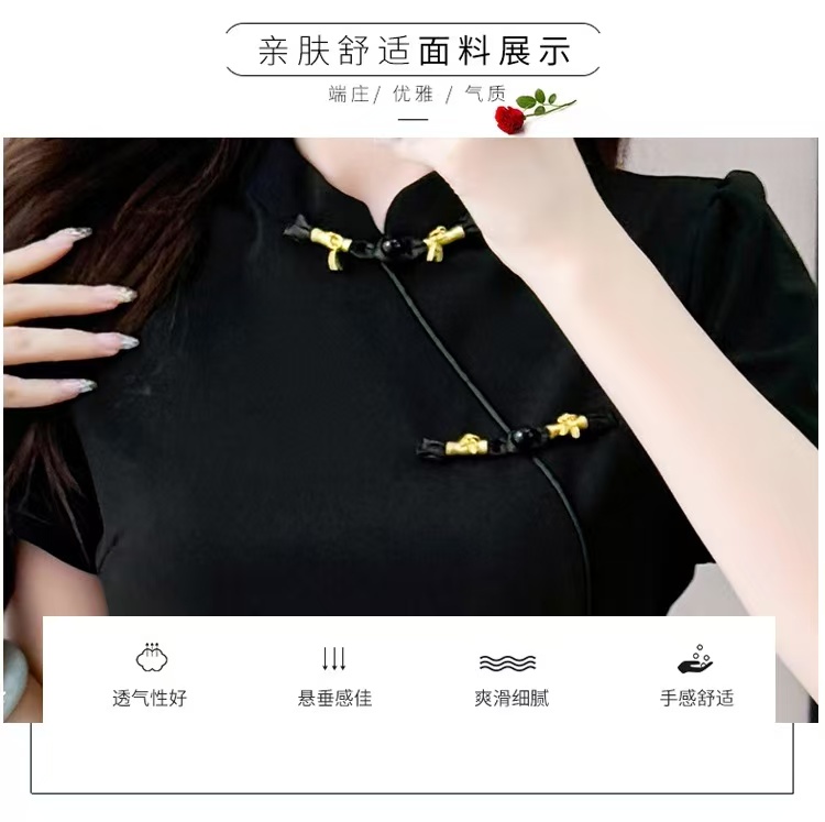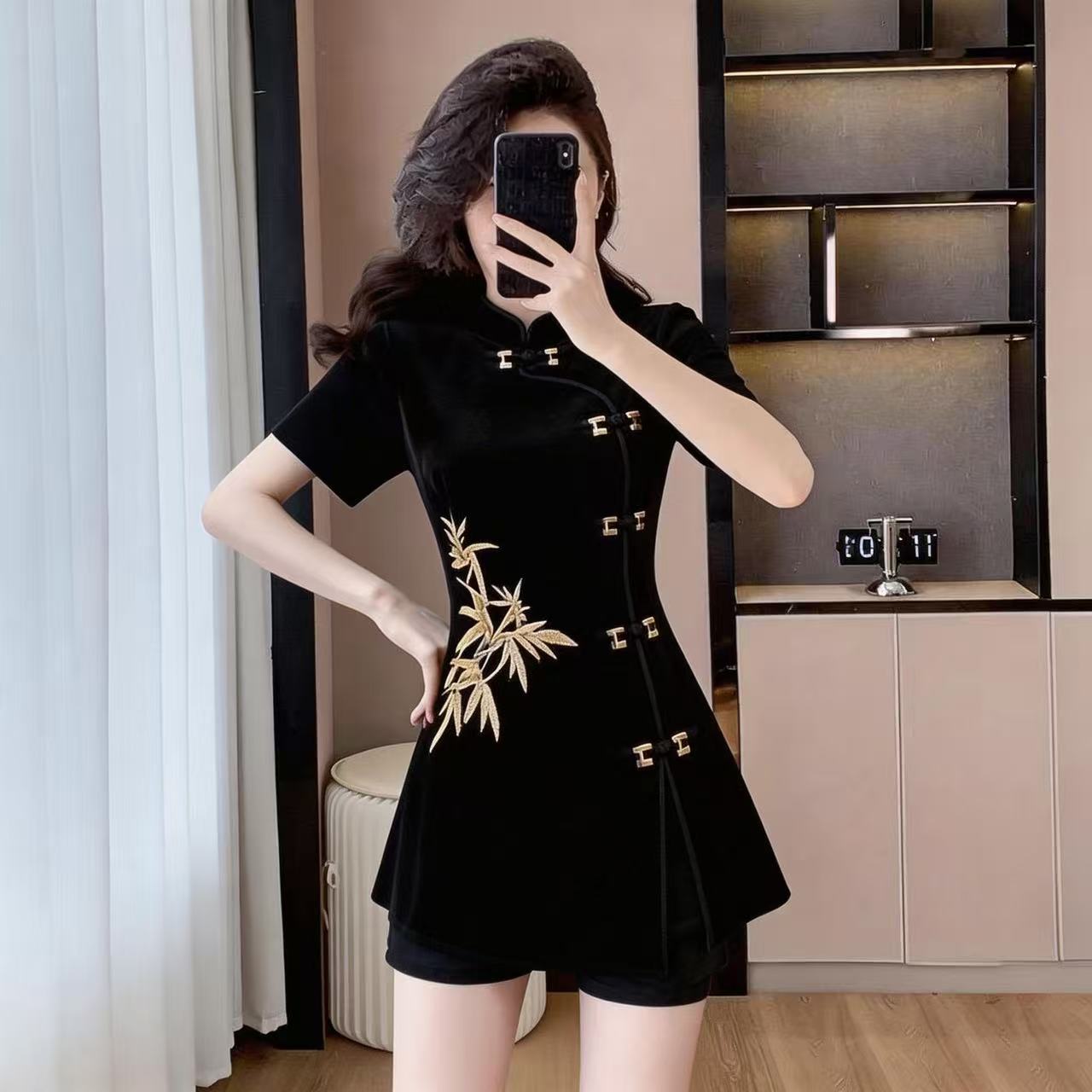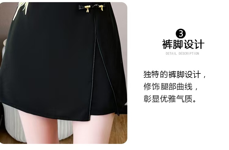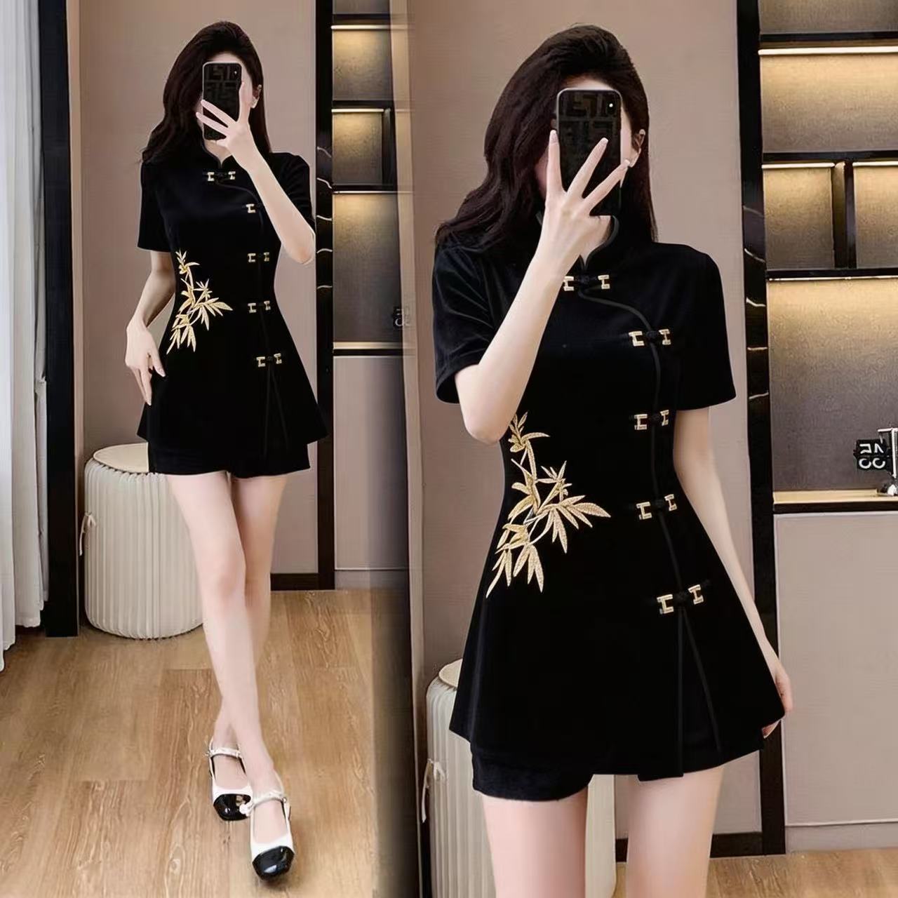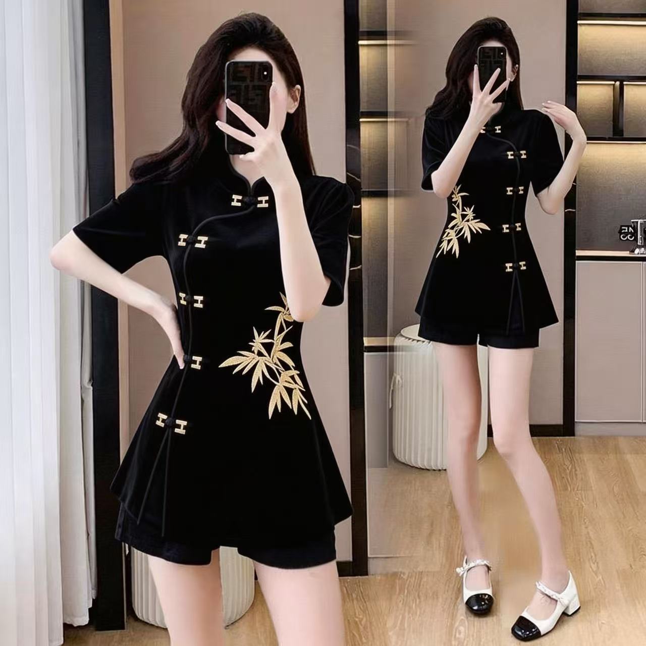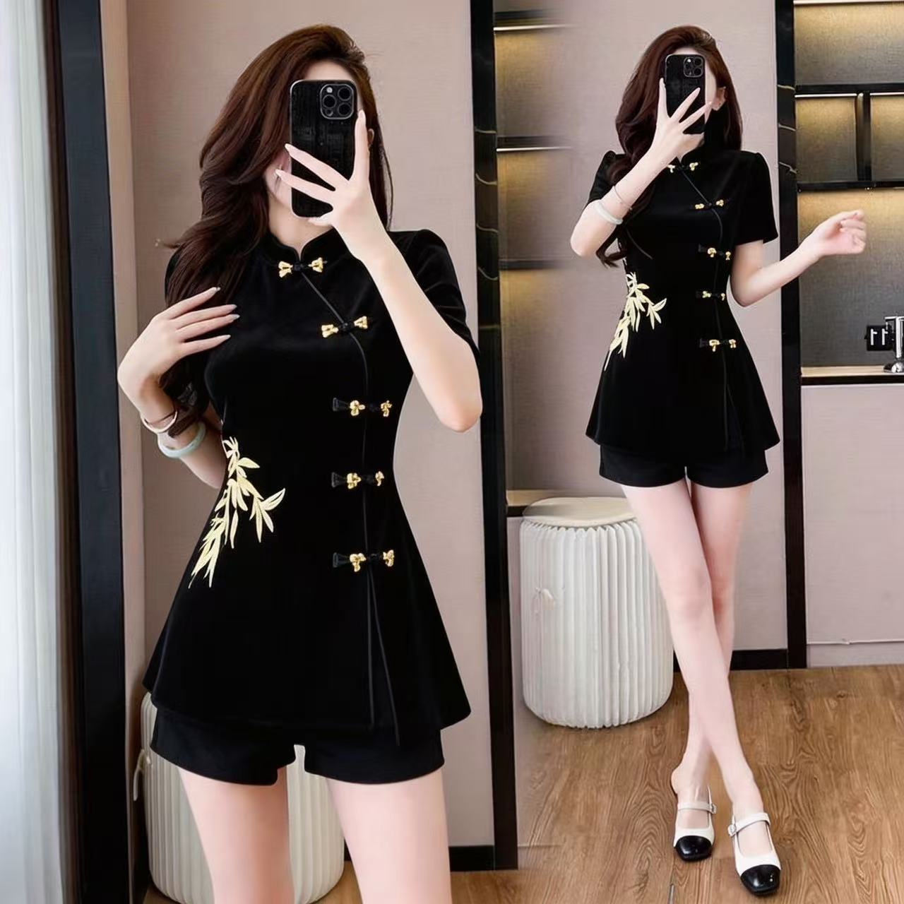 RY3109# 实拍大码新款夏季气质显瘦国潮复古旗袍风刺袖上衣+短裤两件套