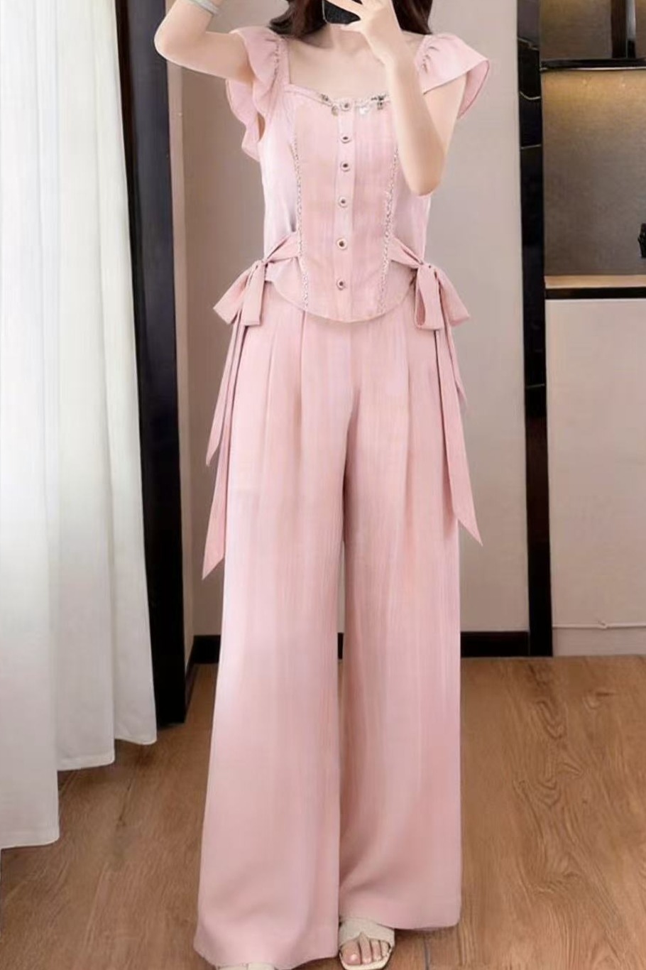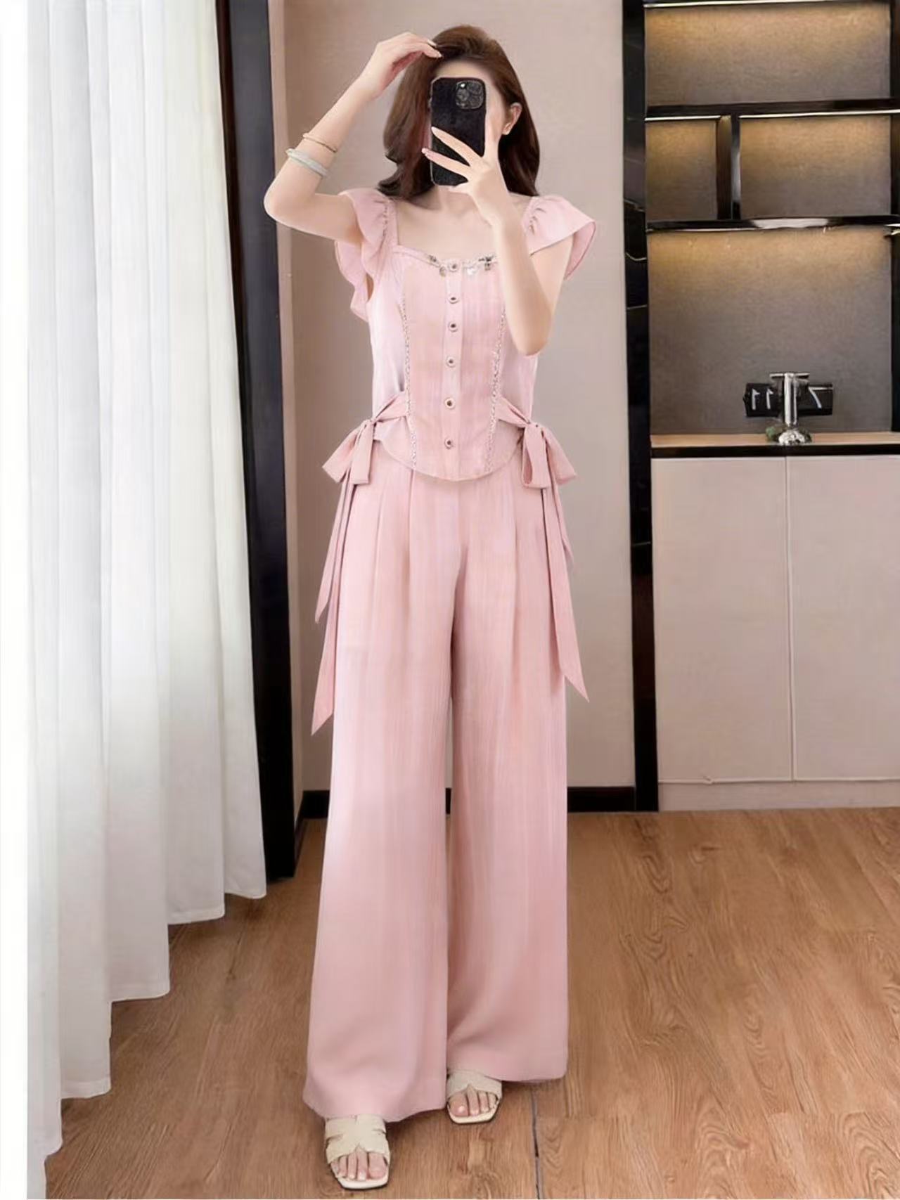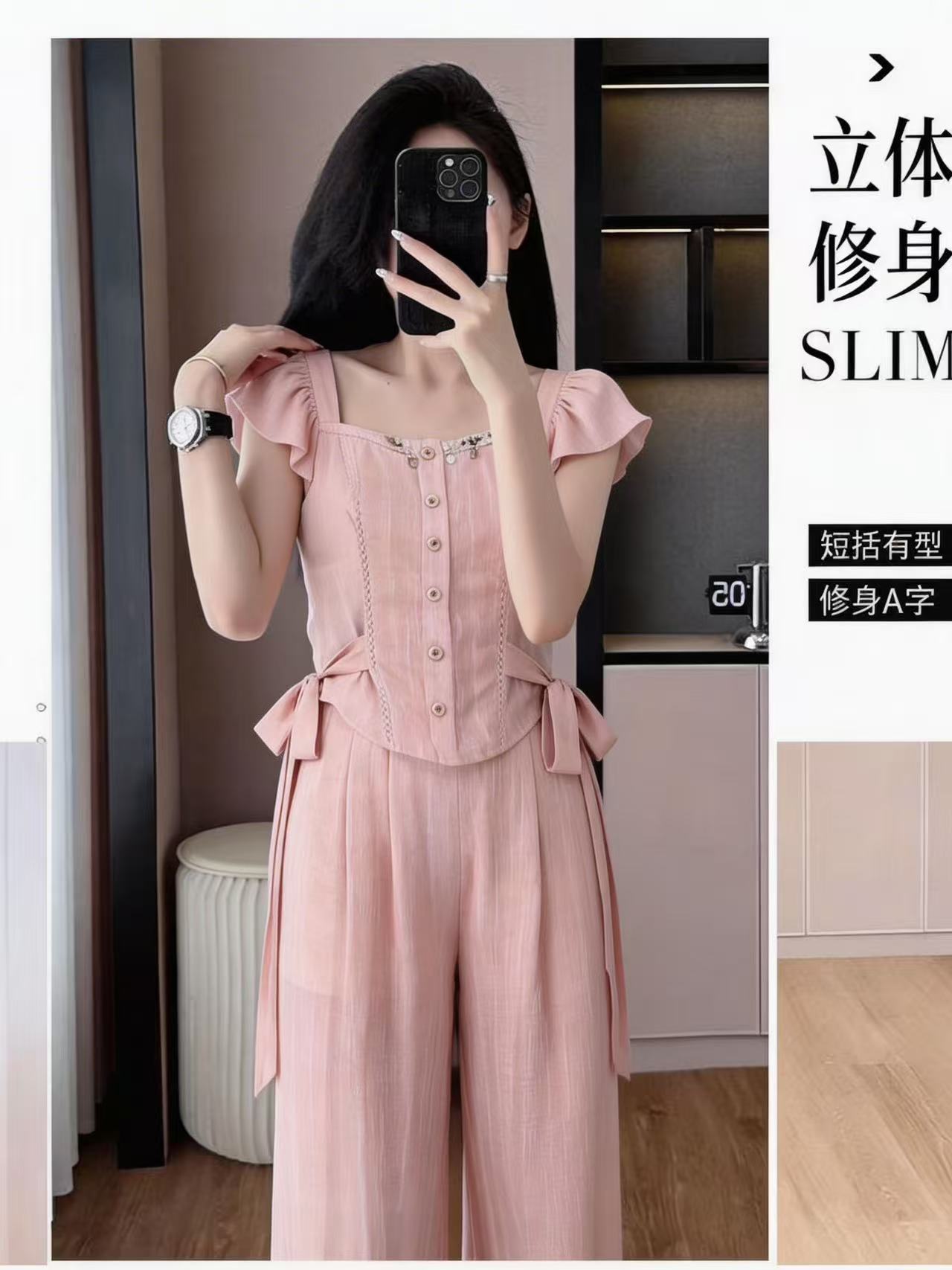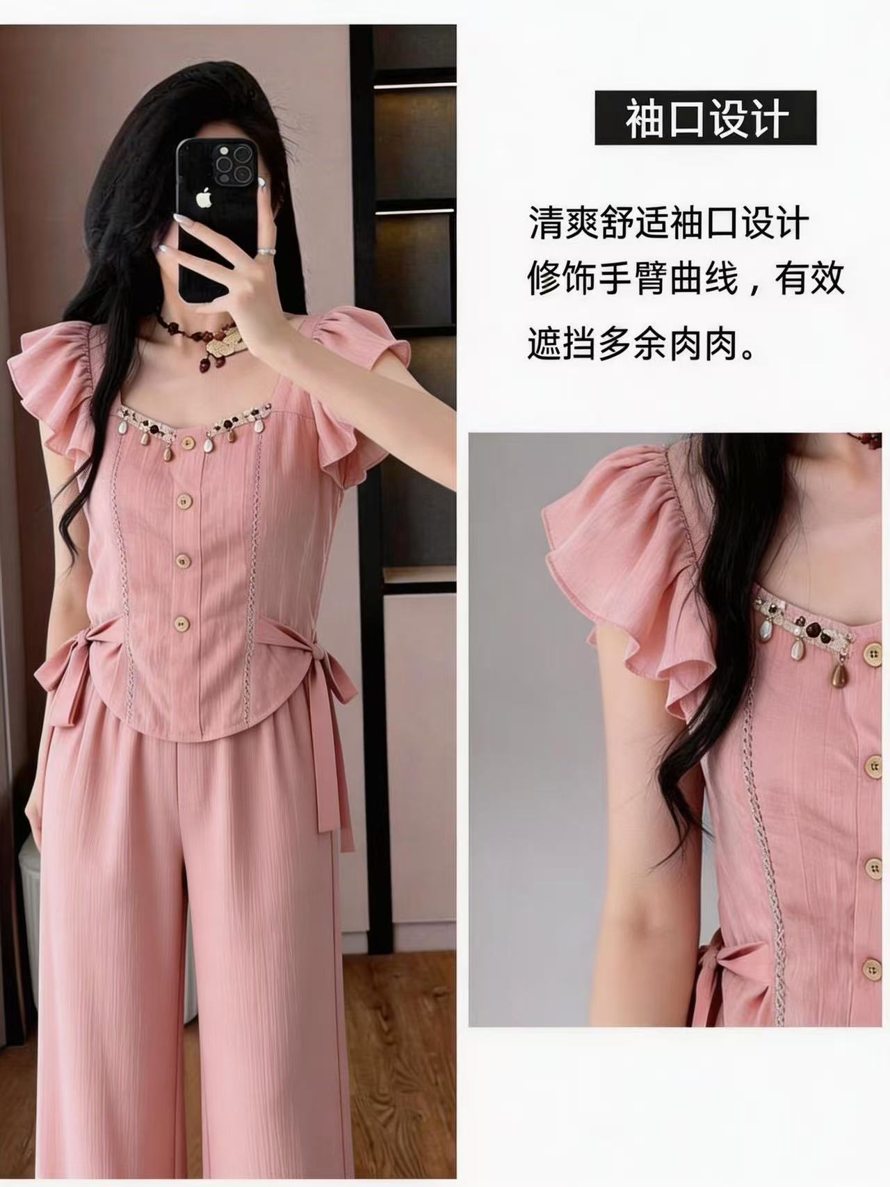 RY3111# 实拍大码新款夏季时尚气质显瘦收腰荷叶袖绑带衬衫阔腿裤两件套
