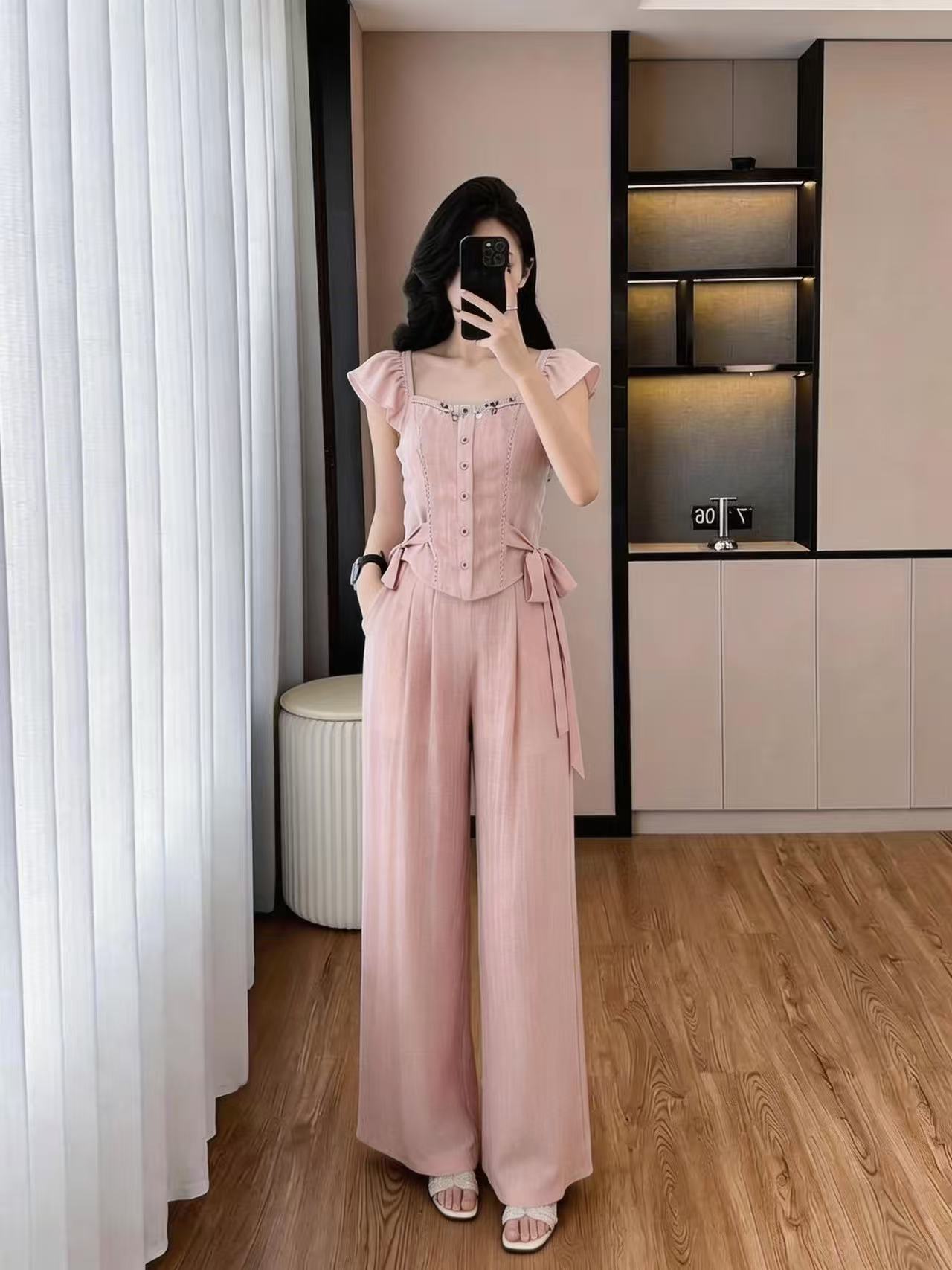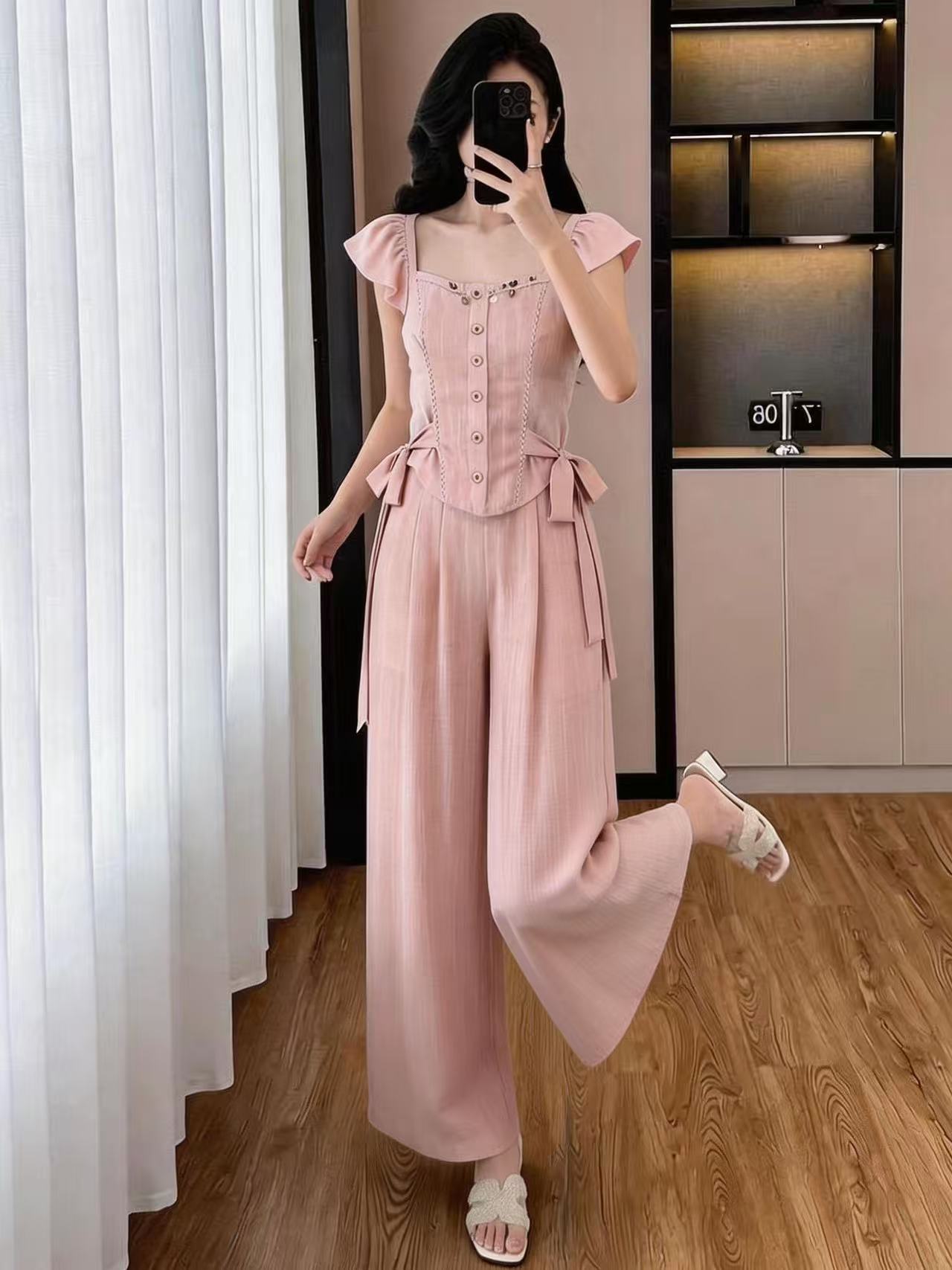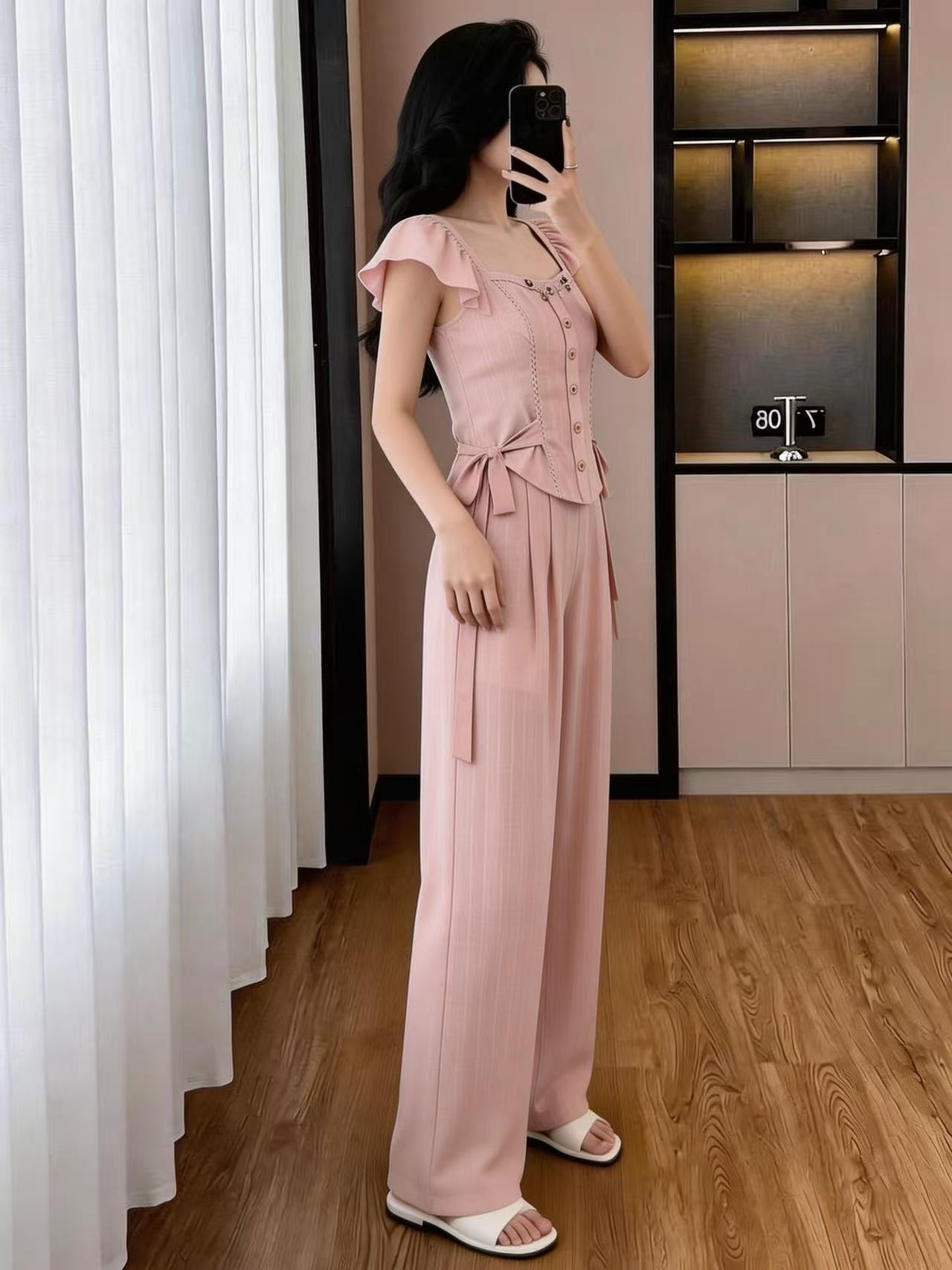RY3111# 实拍大码新款夏季时尚气质显瘦收腰荷叶袖绑带衬衫阔腿裤两件套
