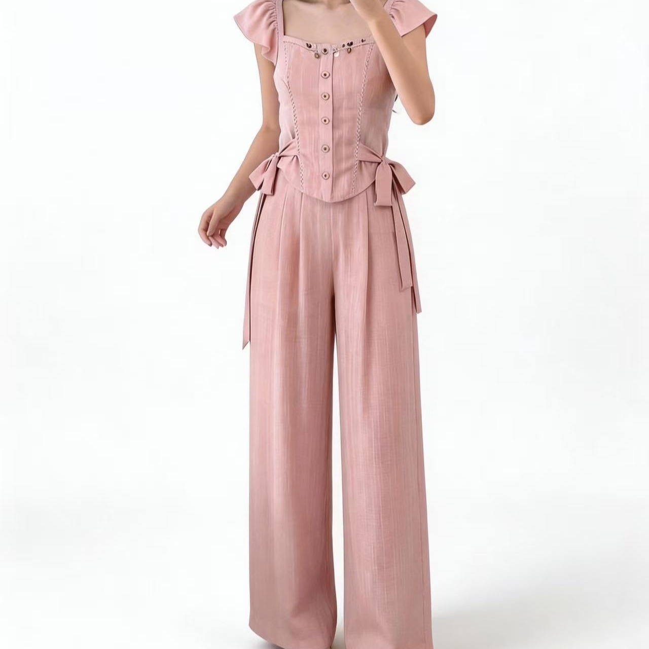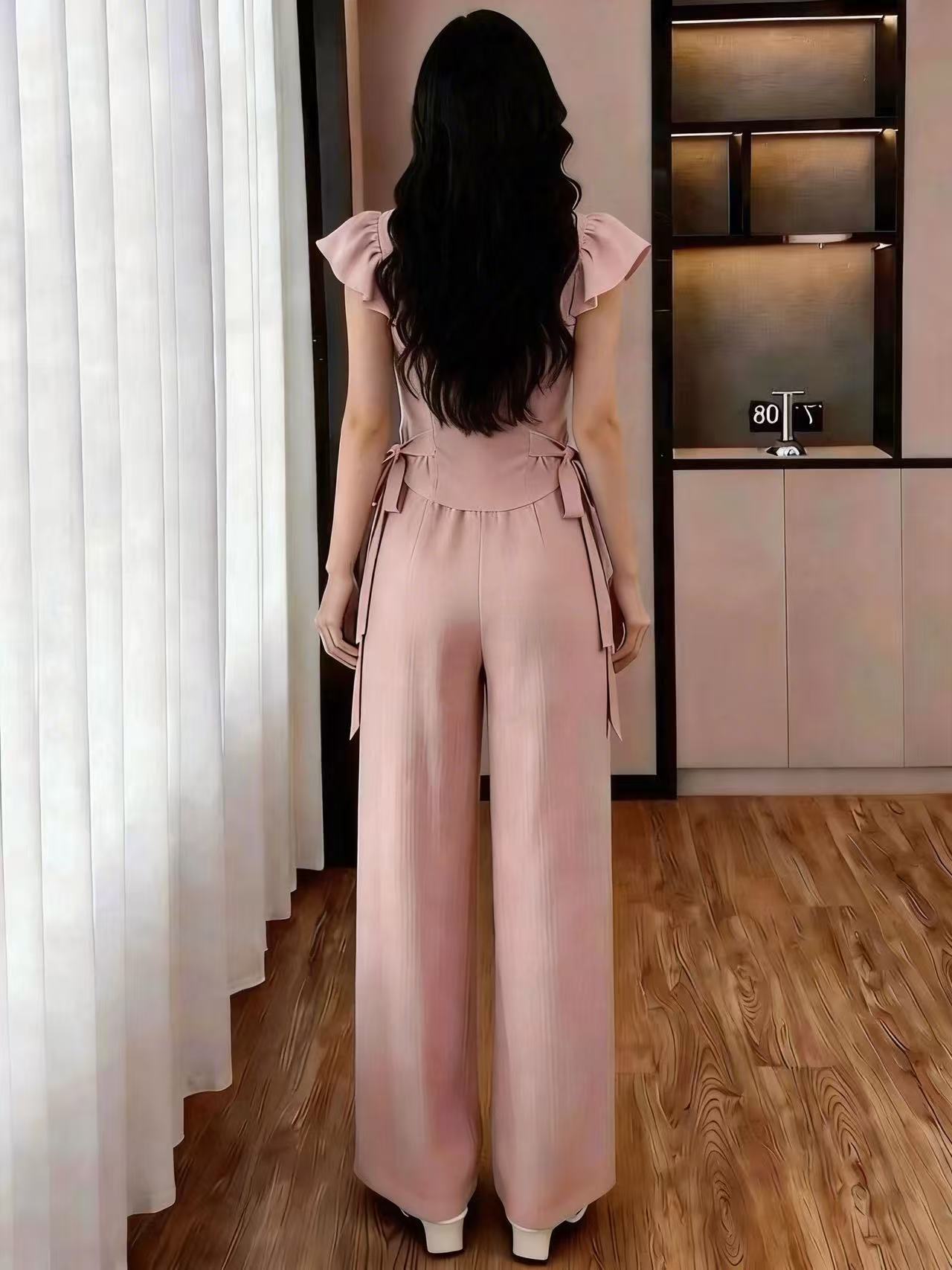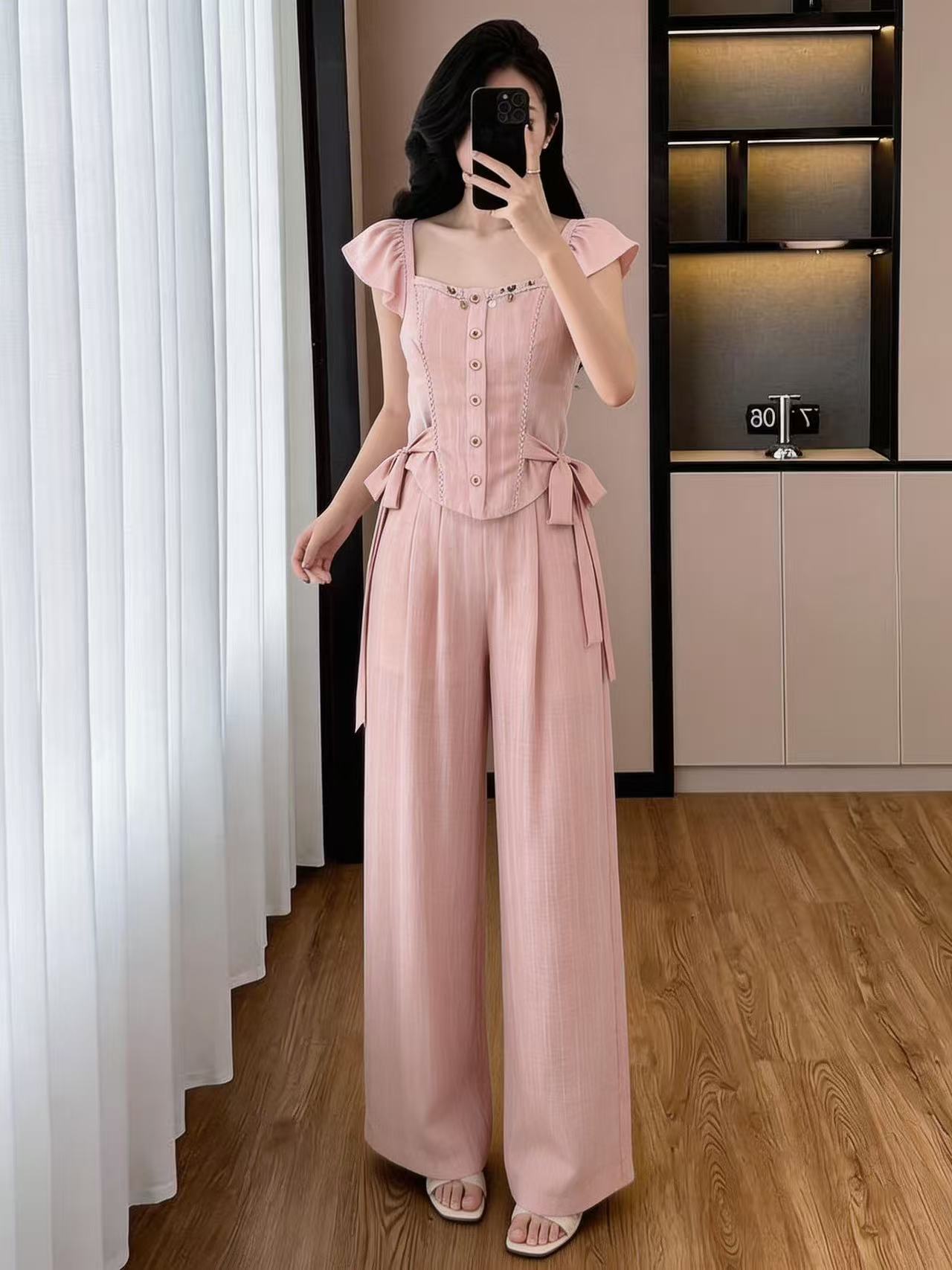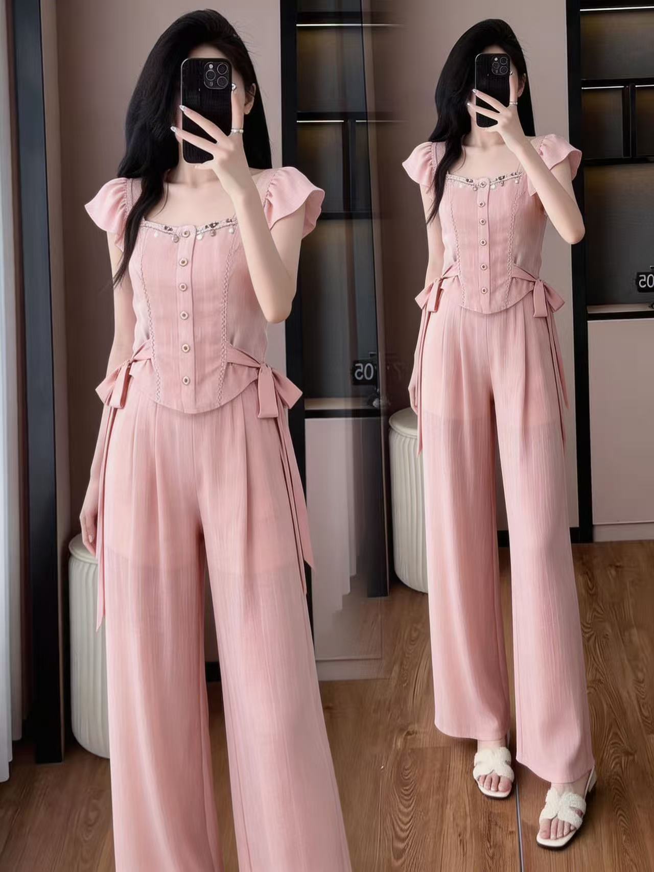 RY3111# 实拍大码新款夏季时尚气质显瘦收腰荷叶袖绑带衬衫阔腿裤两件套