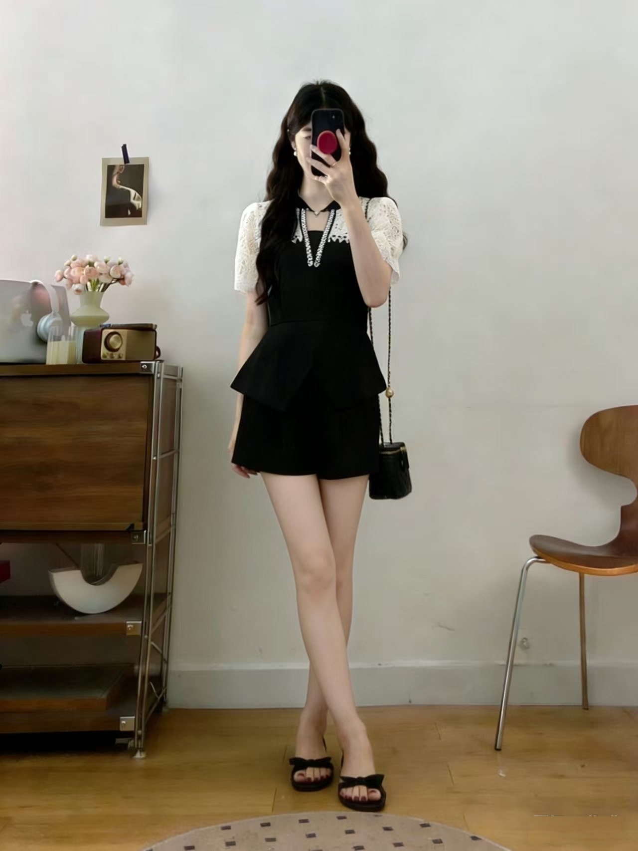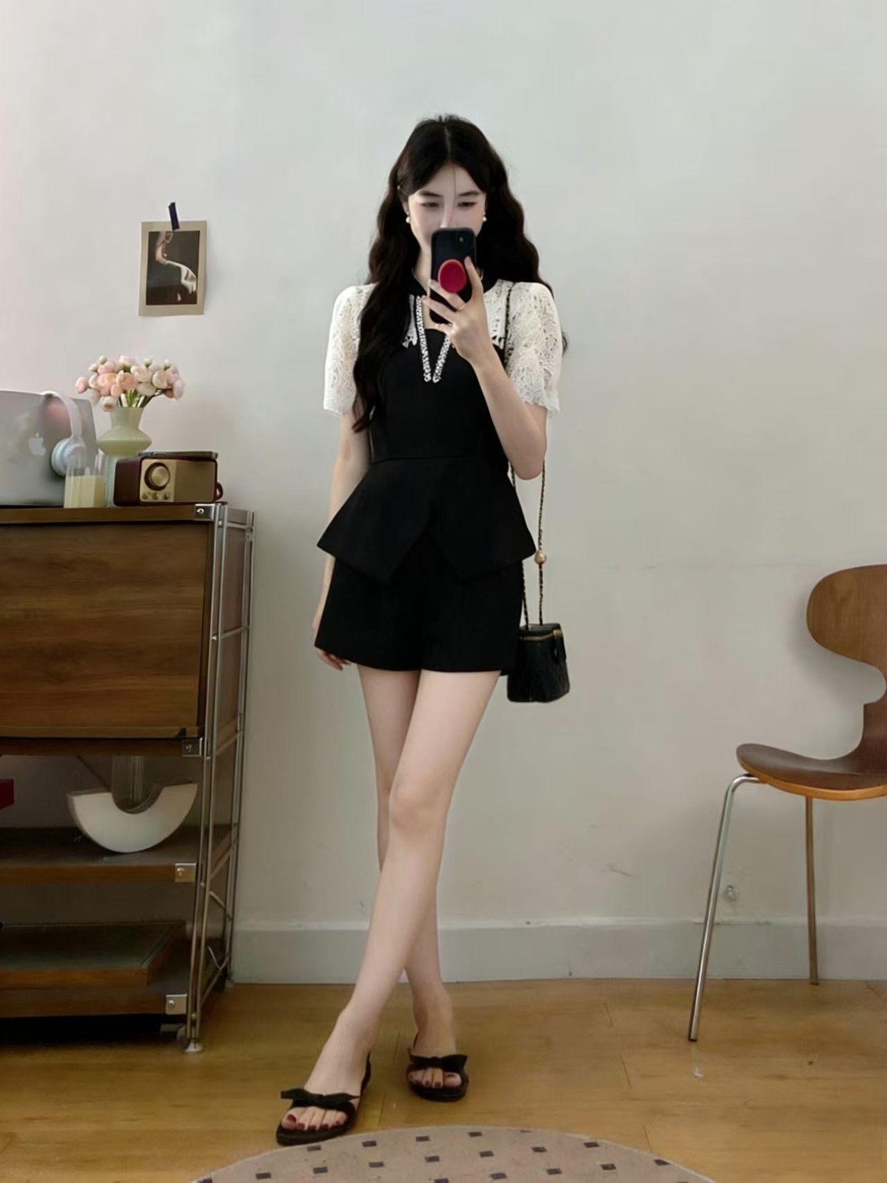 RY3115# 实拍大码女装夏季新款时尚气质显瘦蕾丝拼接上衣+短裤大码两件套