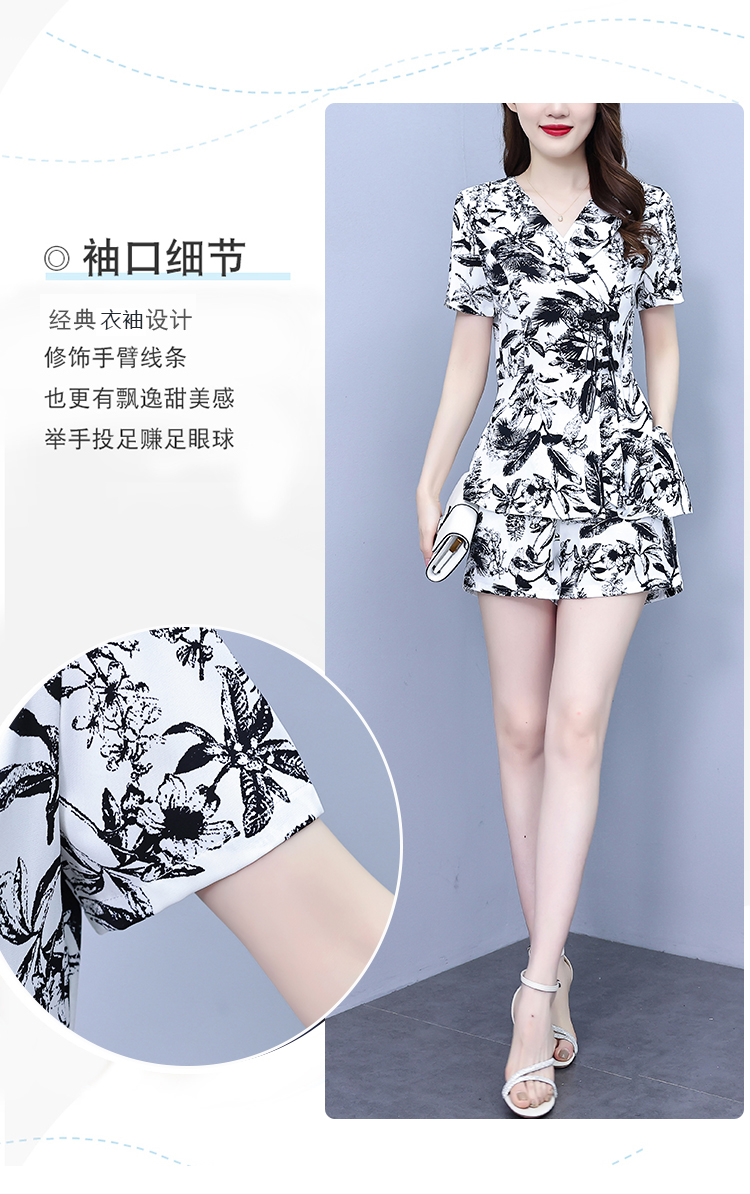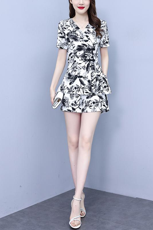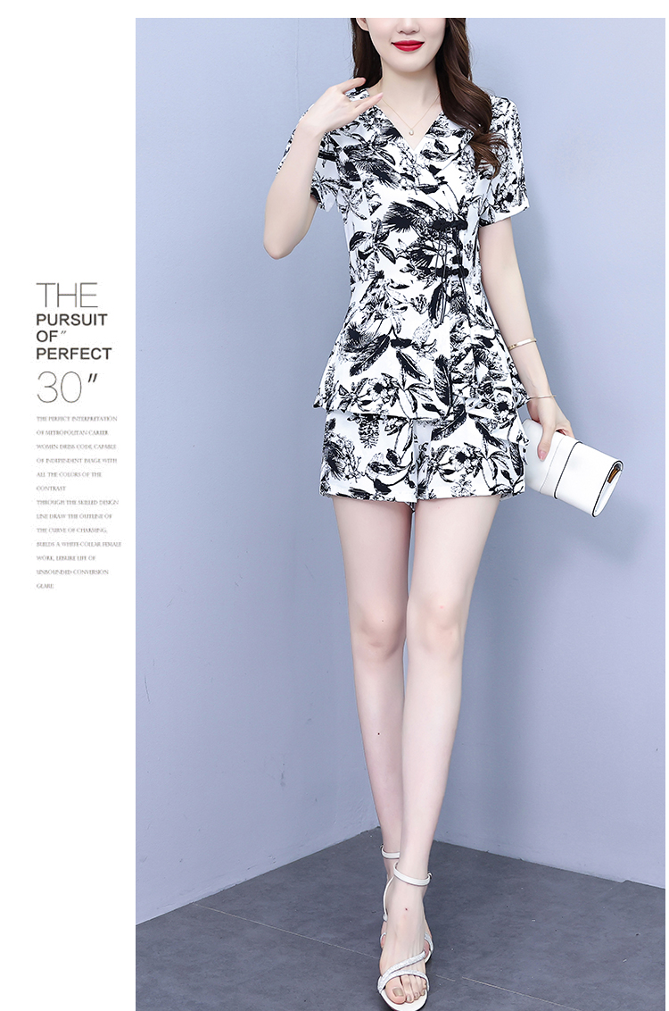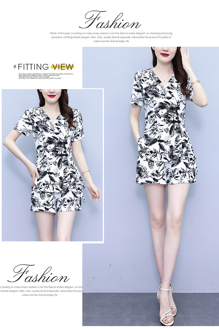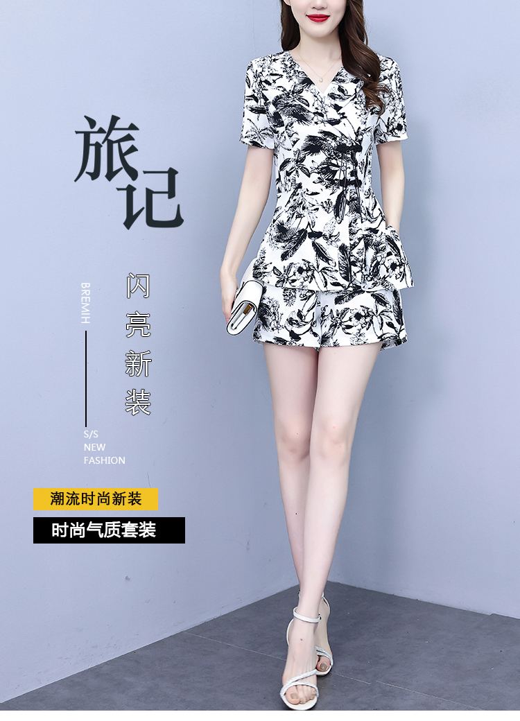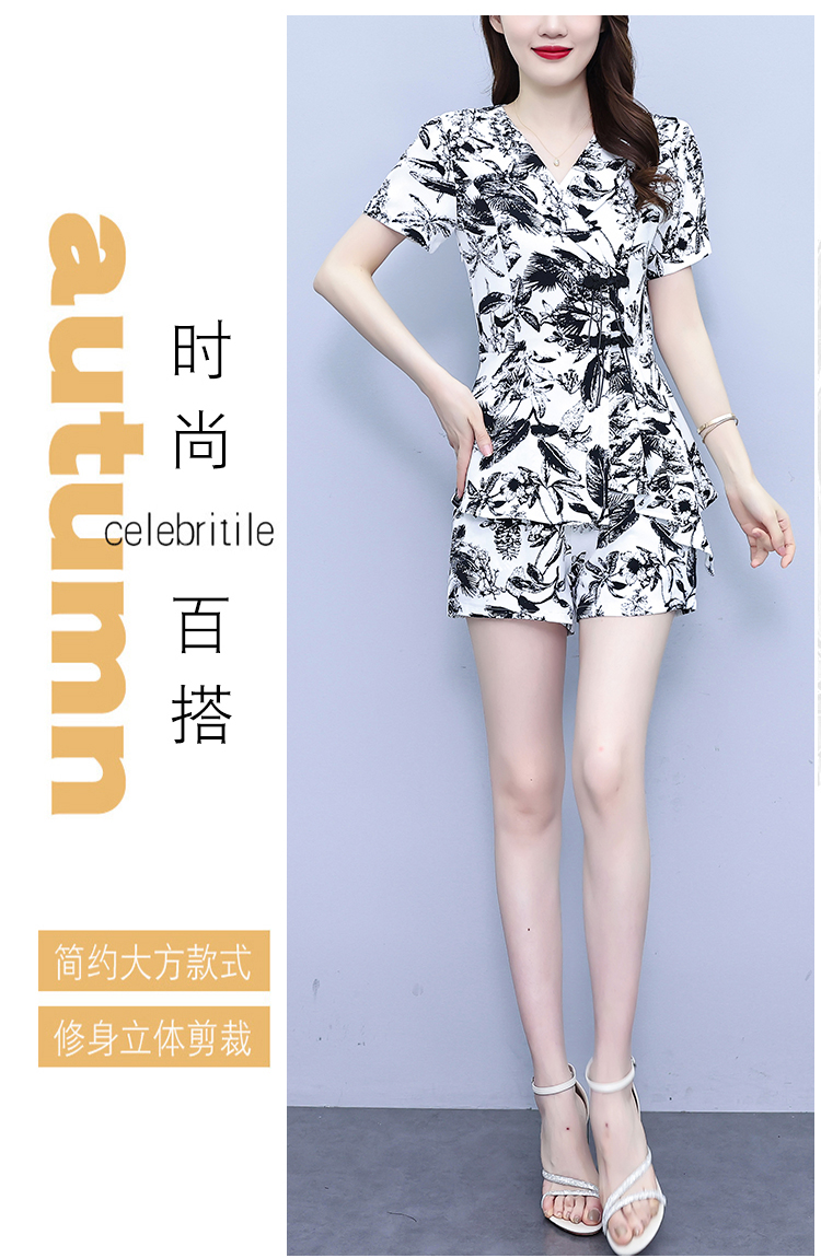RY3117# 实拍夏季新款时尚气质显瘦欧货轻奢印花上衣+短裤大码两件套
