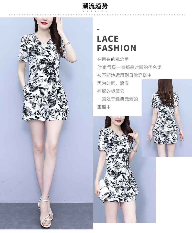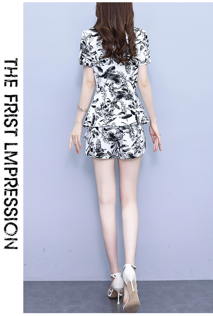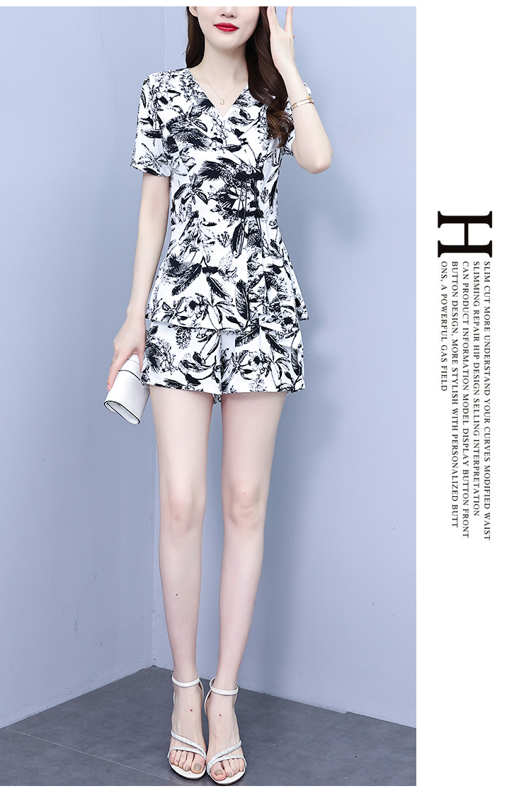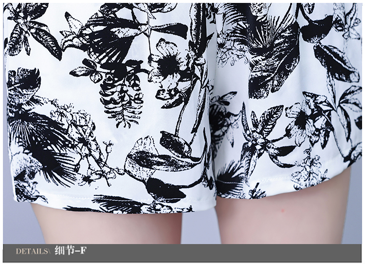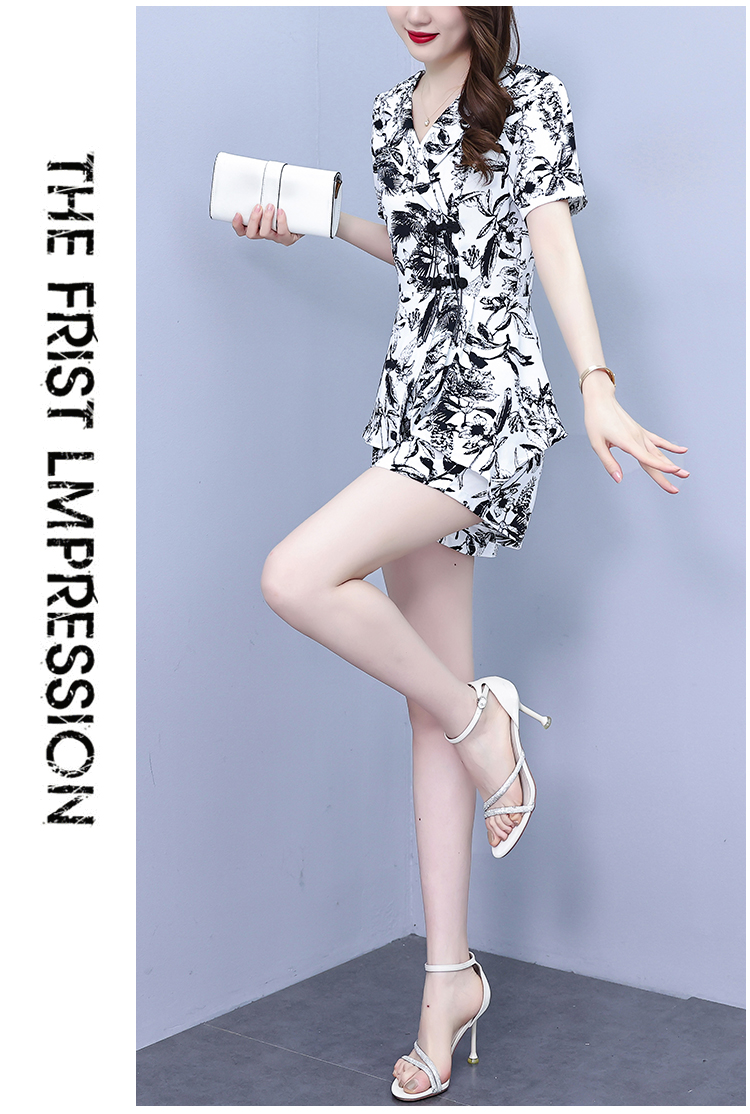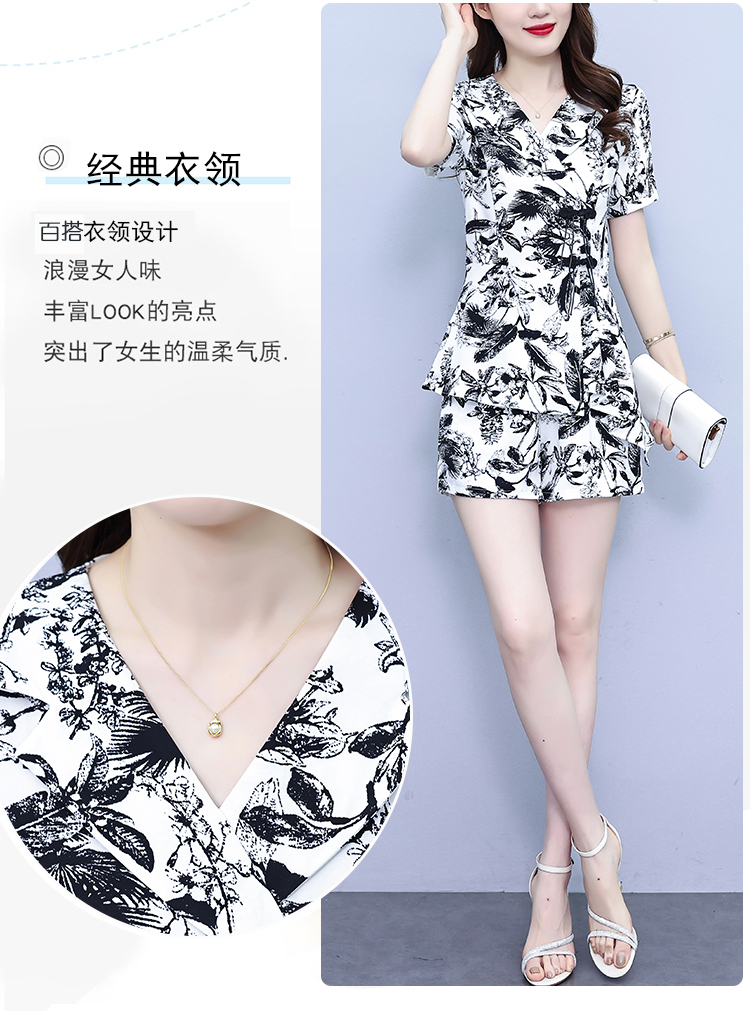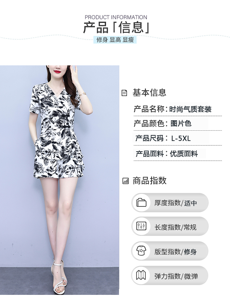 RY3117# 实拍夏季新款时尚气质显瘦欧货轻奢印花上衣+短裤大码两件套