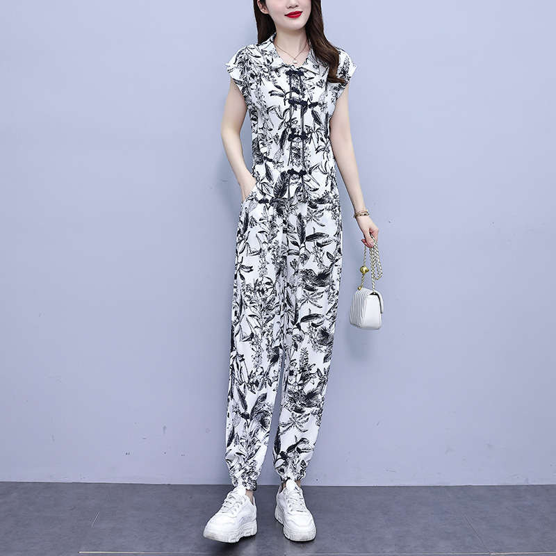 RY3118# 实拍夏季新款时尚盘扣水墨画印花休闲复古大码两件套