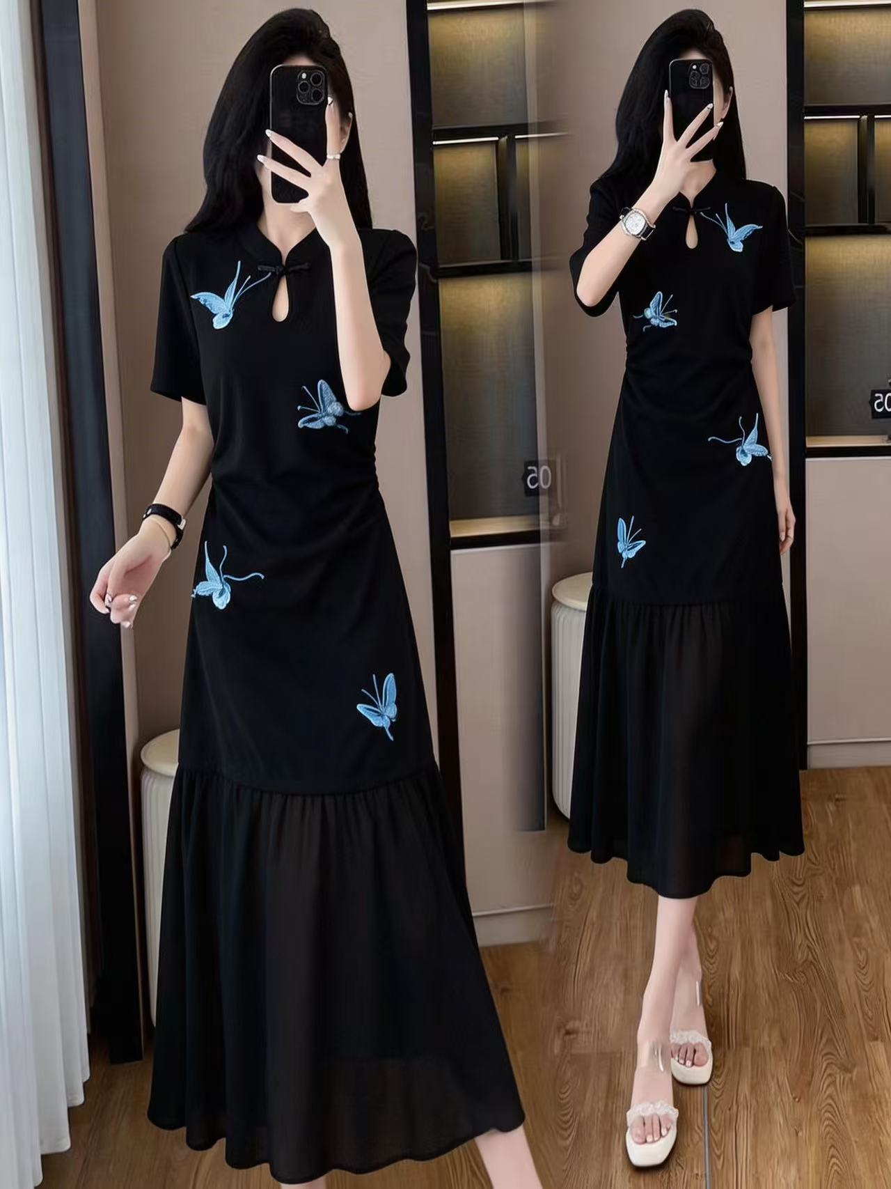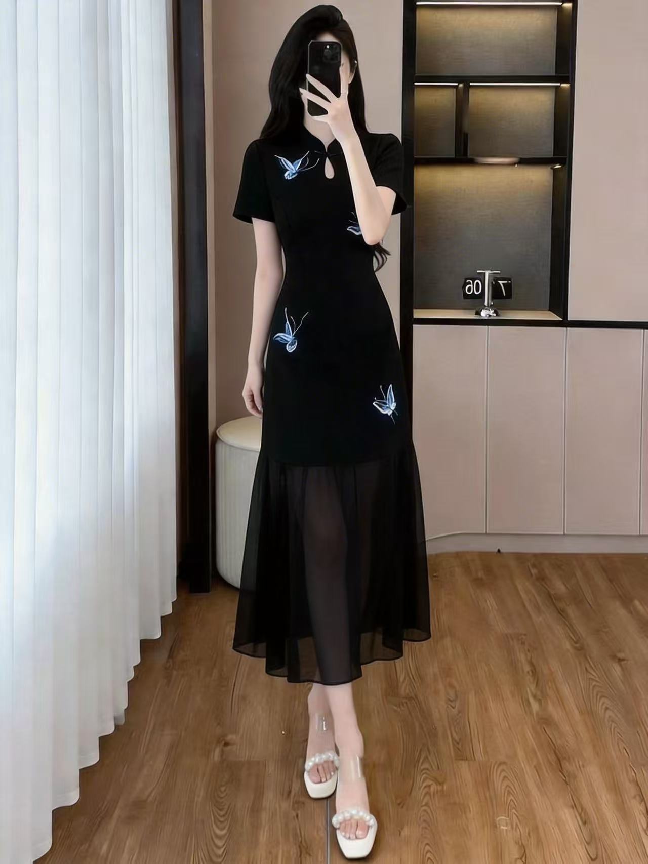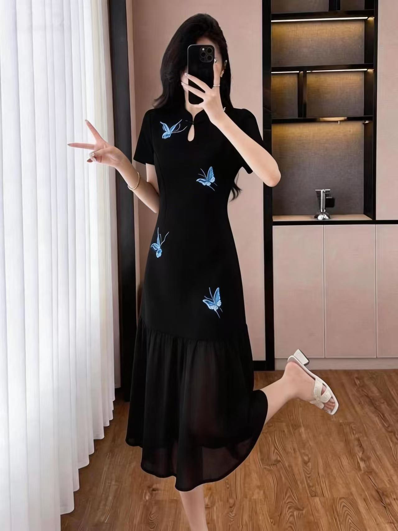 RY3119# 实拍大码女装夏新款法式气质显瘦刺绣蝴蝶拼接雪纺绝美连衣裙