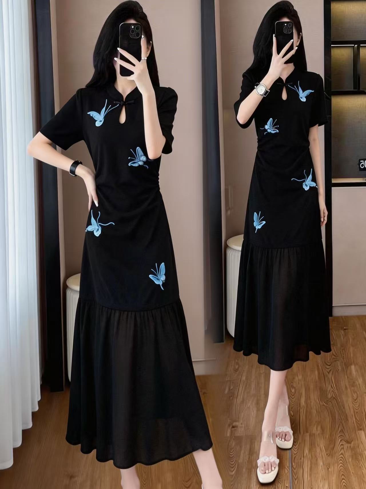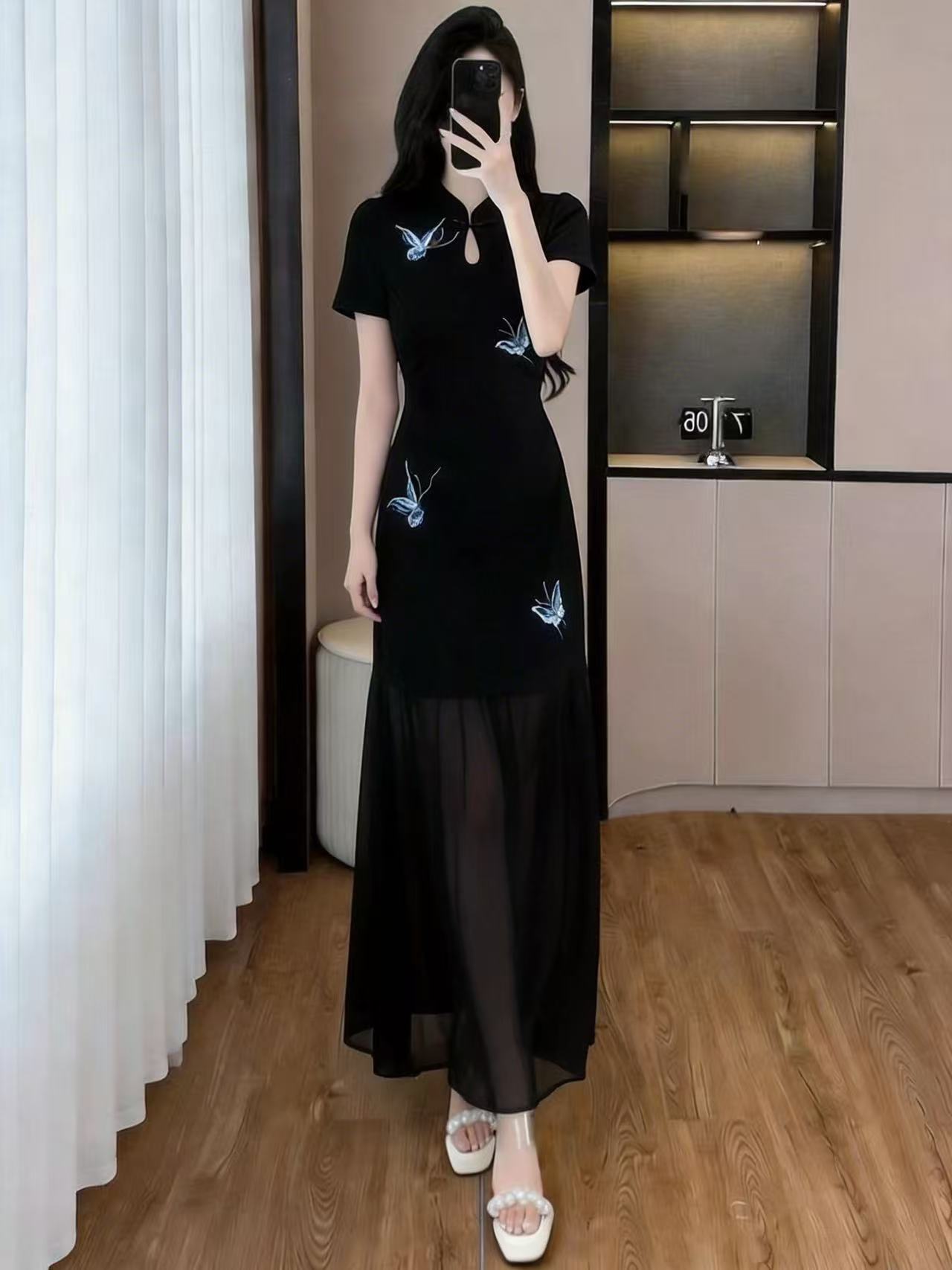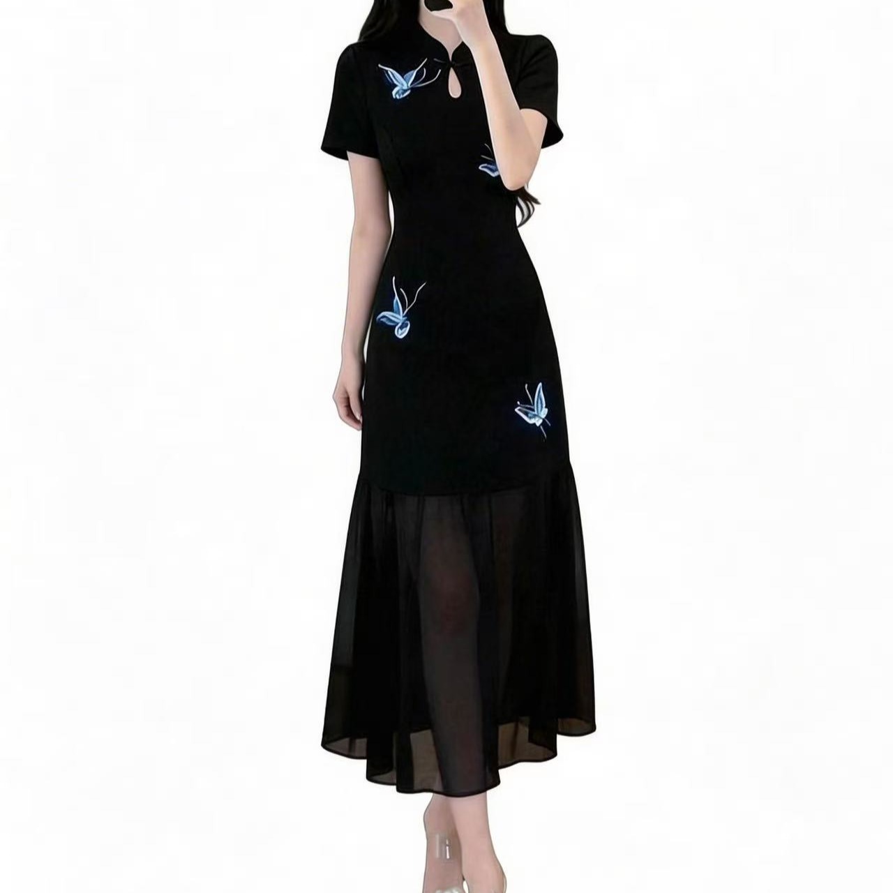 RY3119# 实拍大码女装夏新款法式气质显瘦刺绣蝴蝶拼接雪纺绝美连衣裙