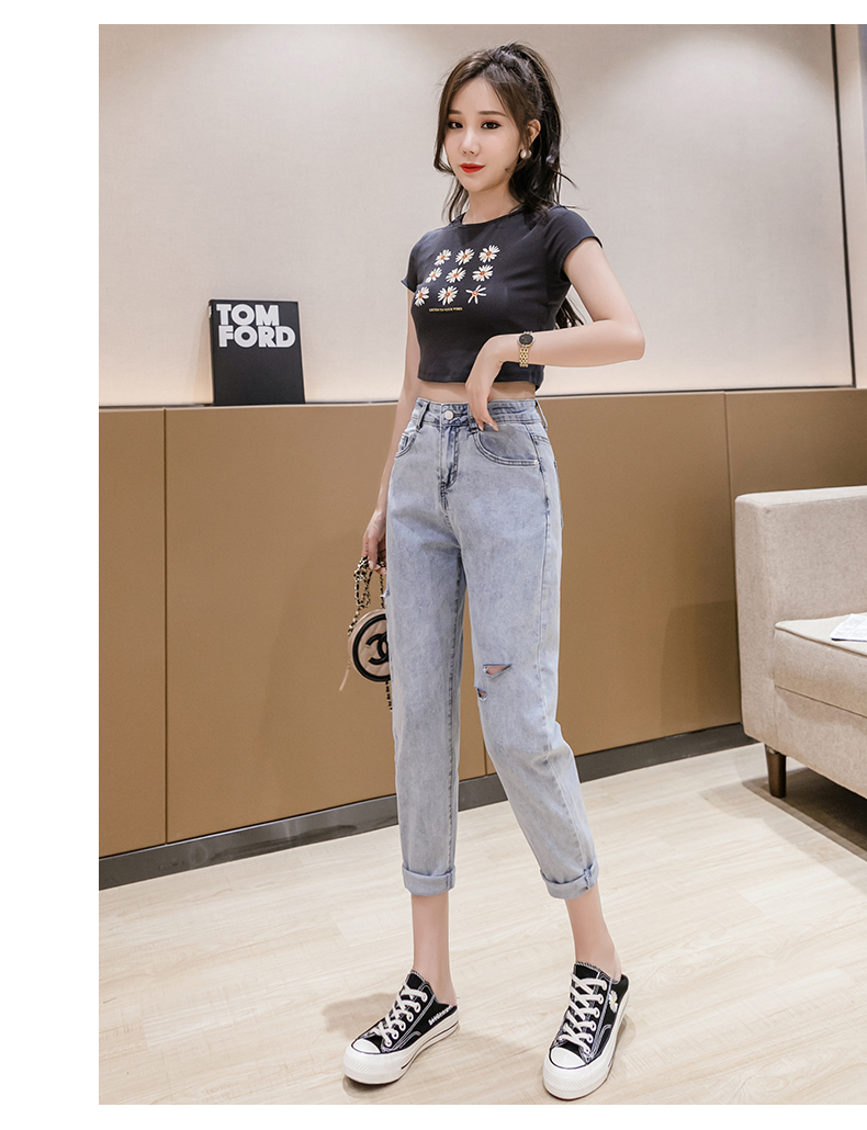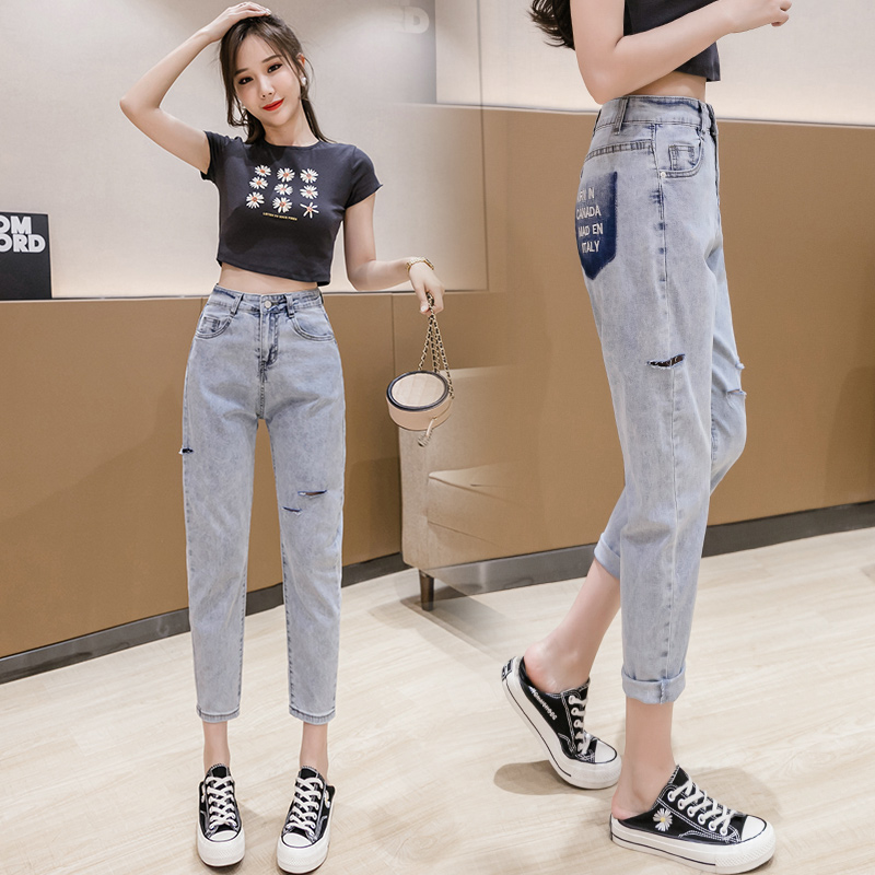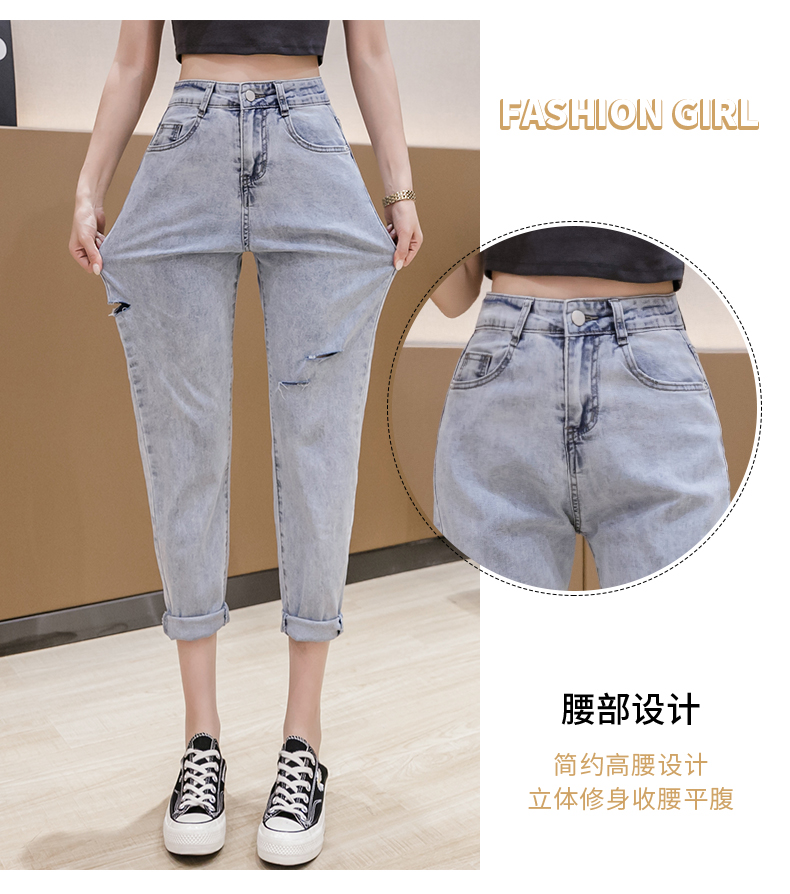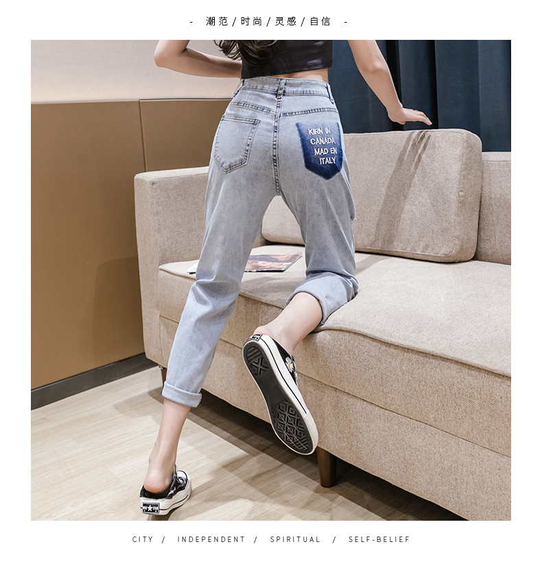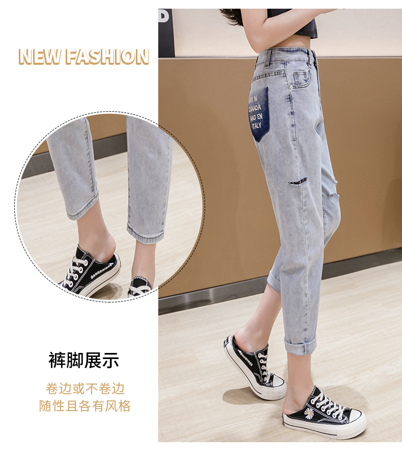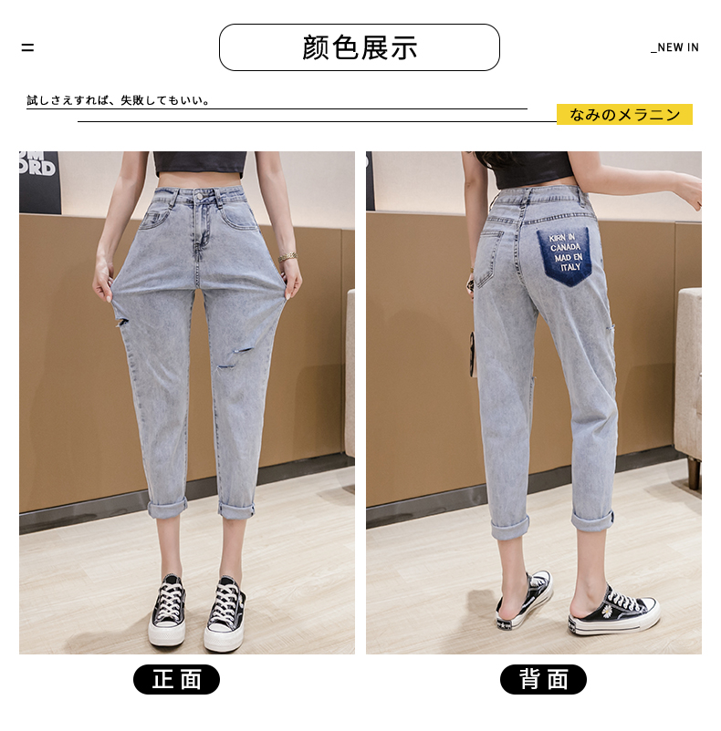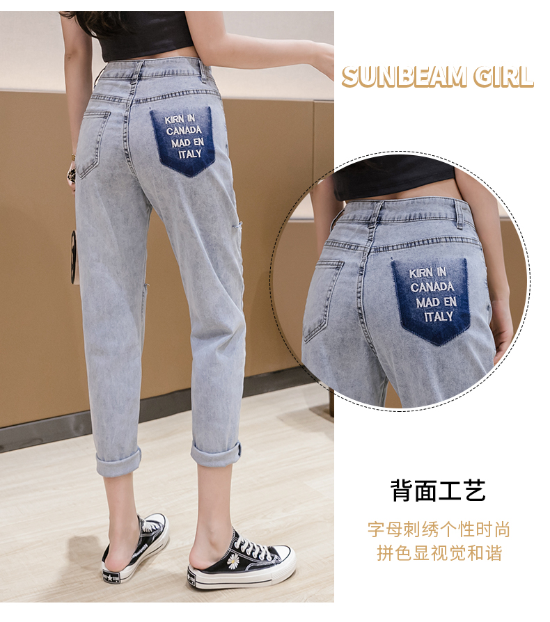 RY3125# 实拍刺绣撞色牛仔裤女2026夏季韩版高腰破洞直筒哈伦裤九分小脚裤