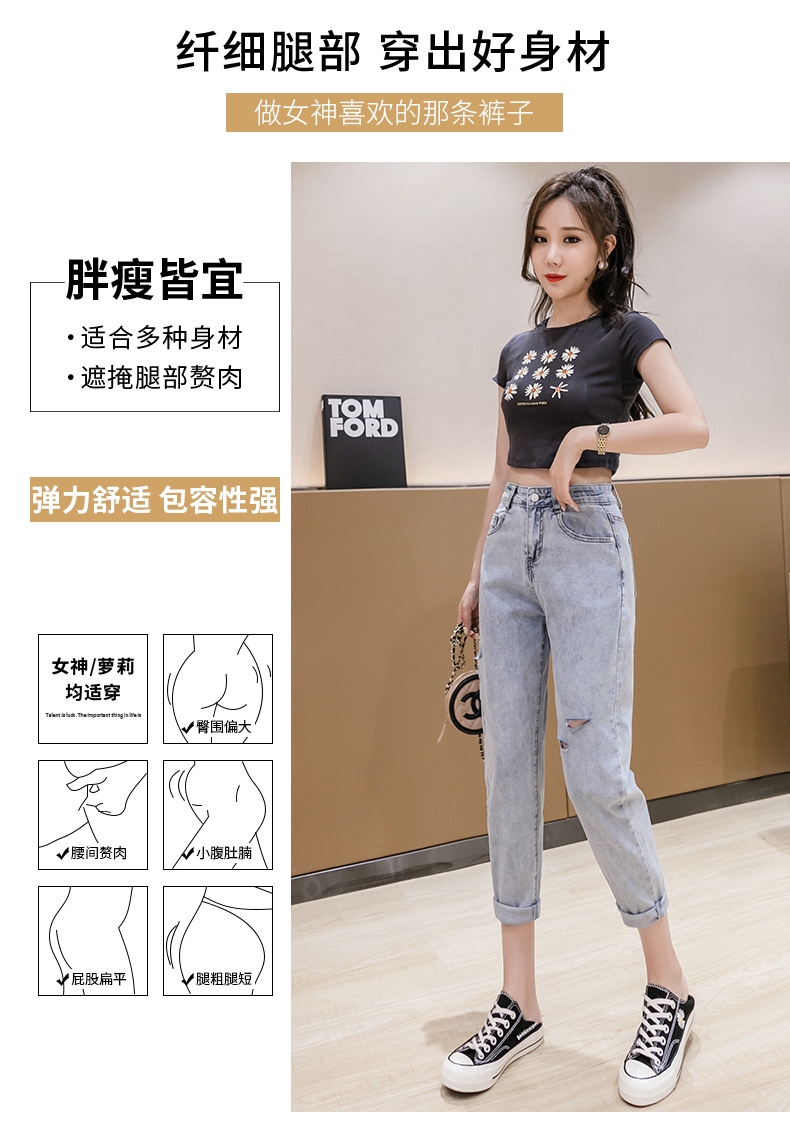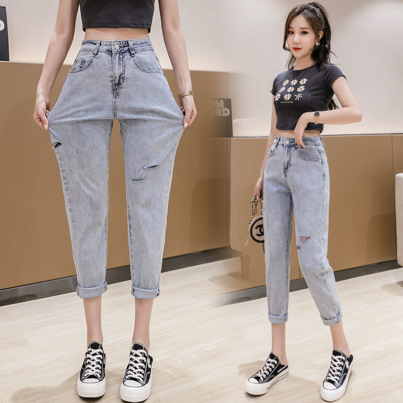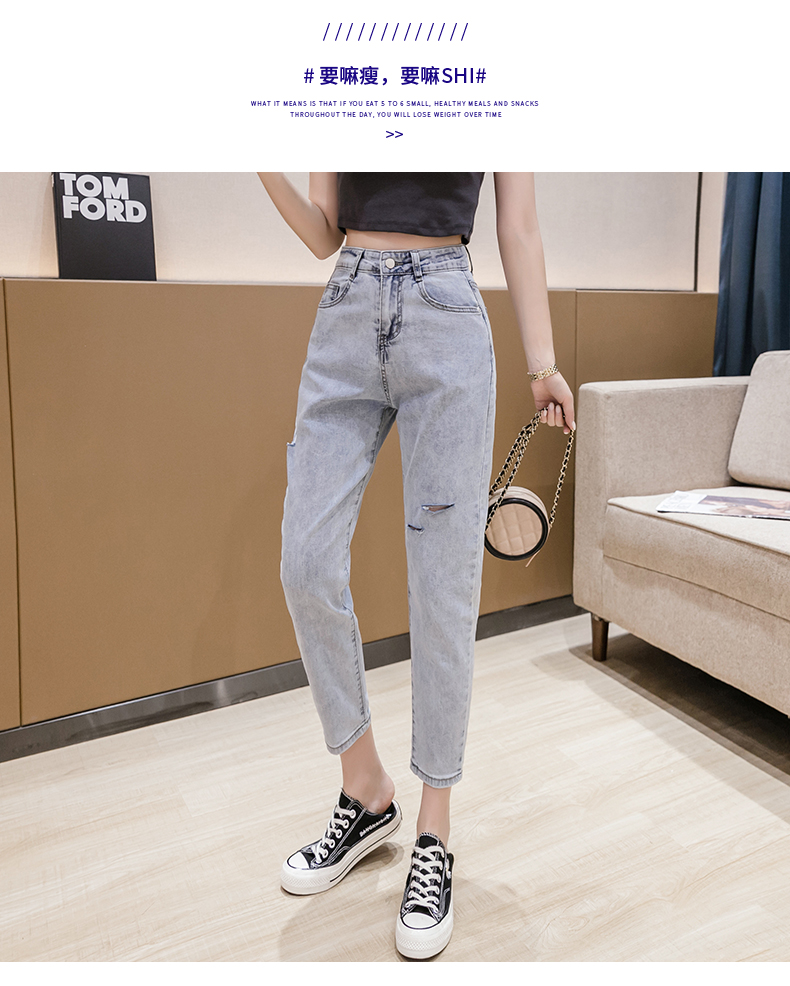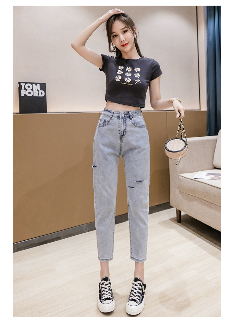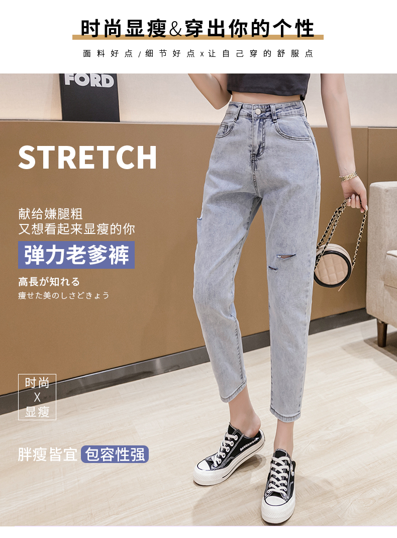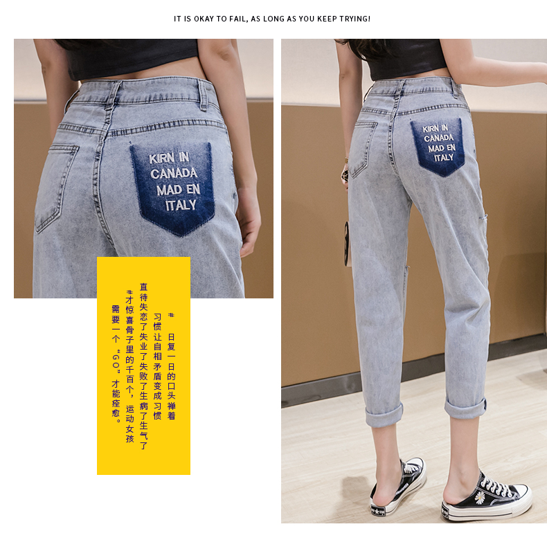 RY3125# 实拍刺绣撞色牛仔裤女2026夏季韩版高腰破洞直筒哈伦裤九分小脚裤