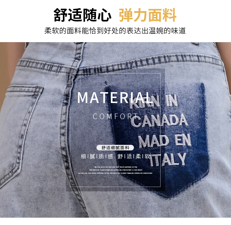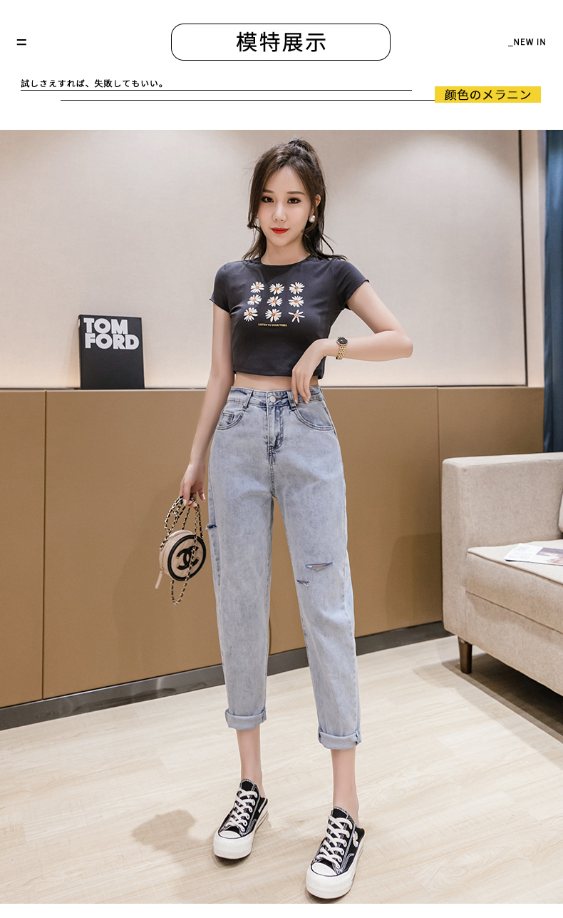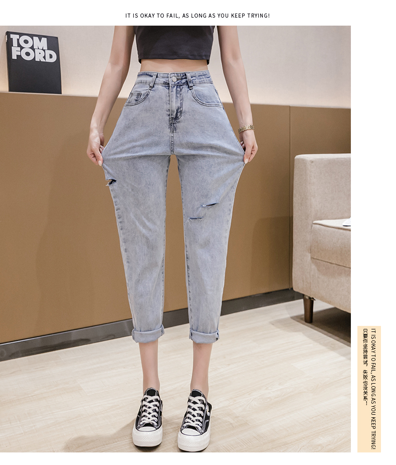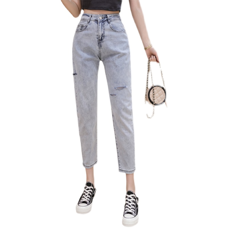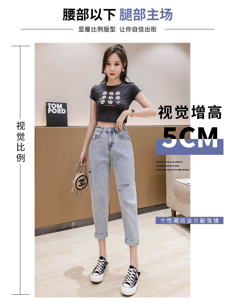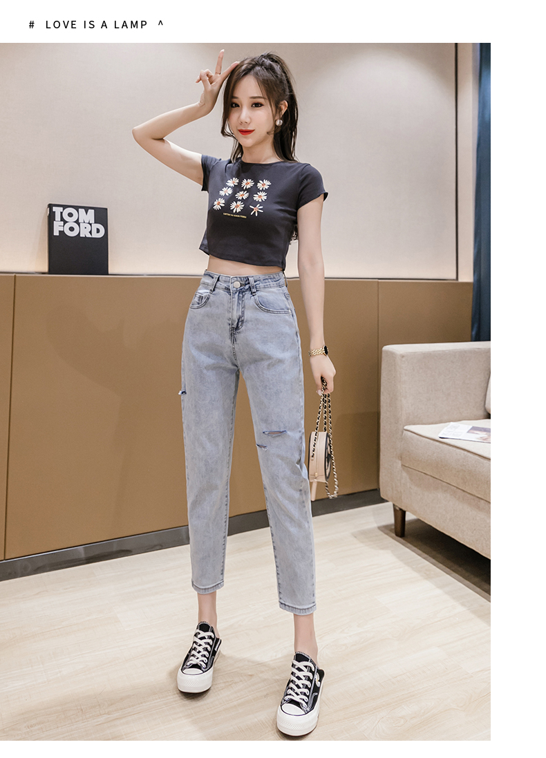 RY3125# 实拍刺绣撞色牛仔裤女2026夏季韩版高腰破洞直筒哈伦裤九分小脚裤