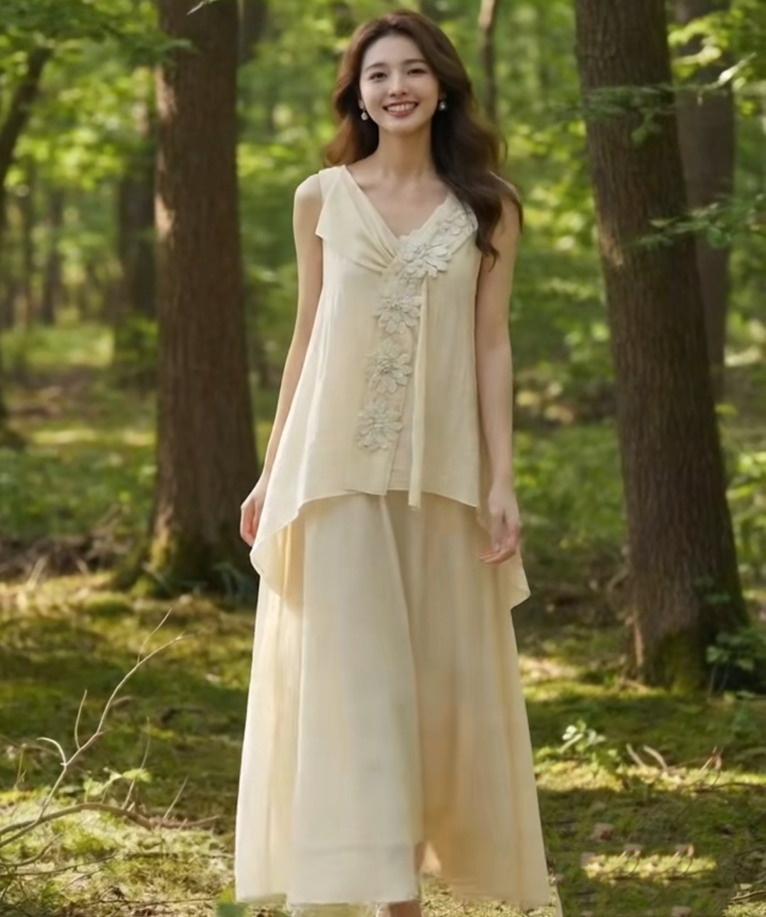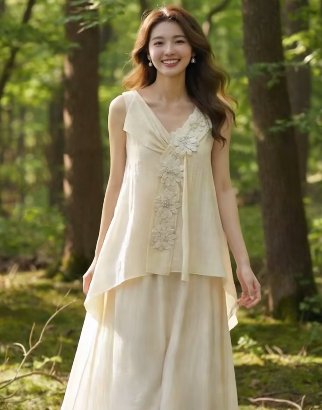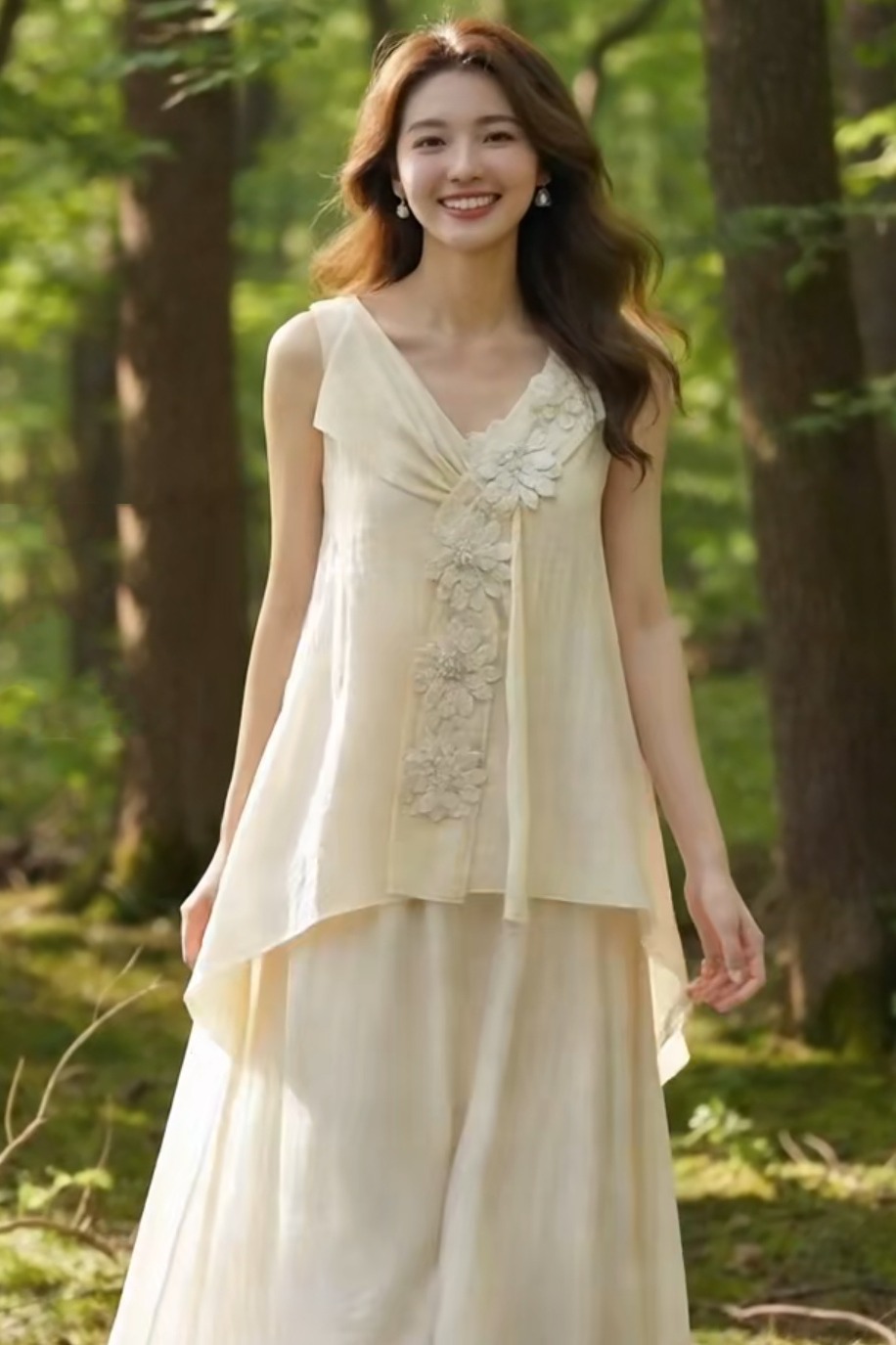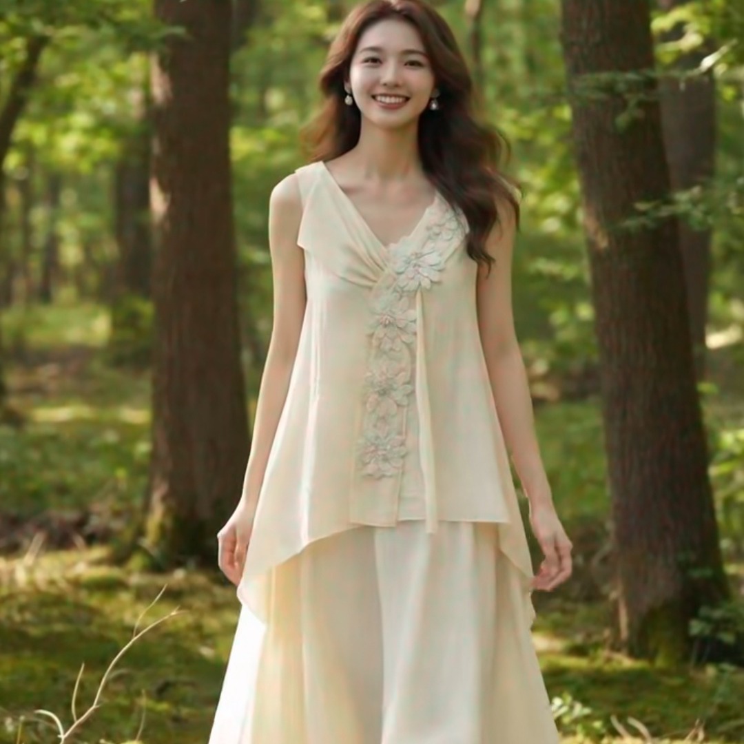 RY3129# 夏季减龄气质甜美v领无袖背心拼接立体花设计法式连衣裙浪漫长裙