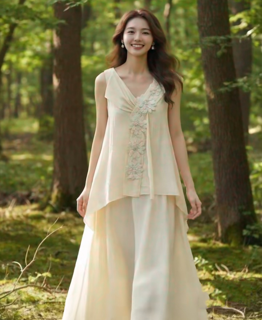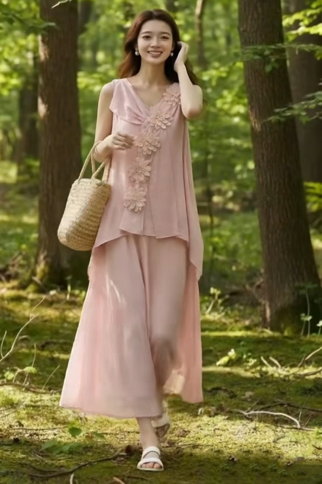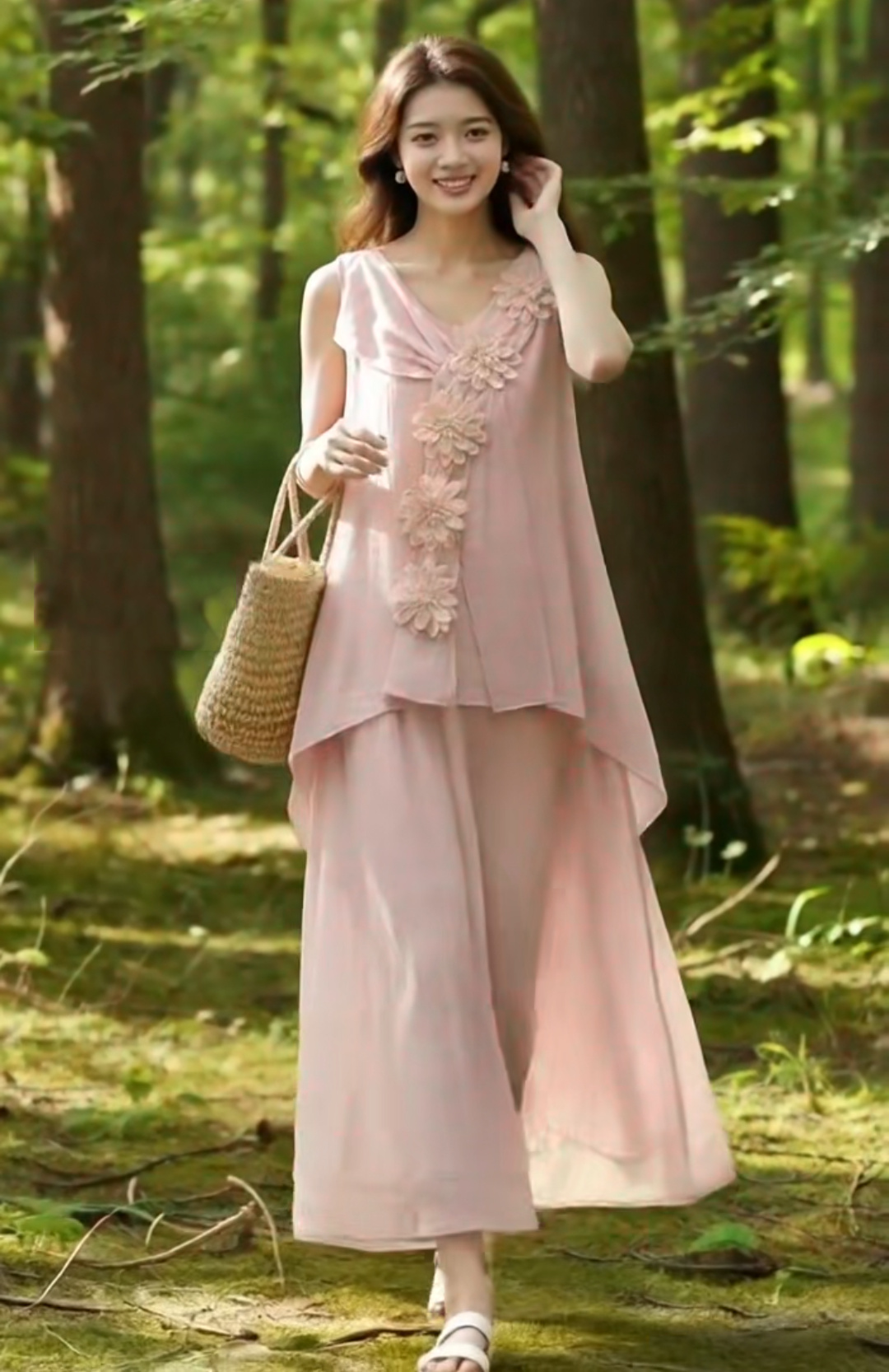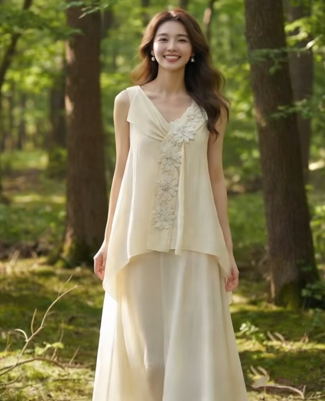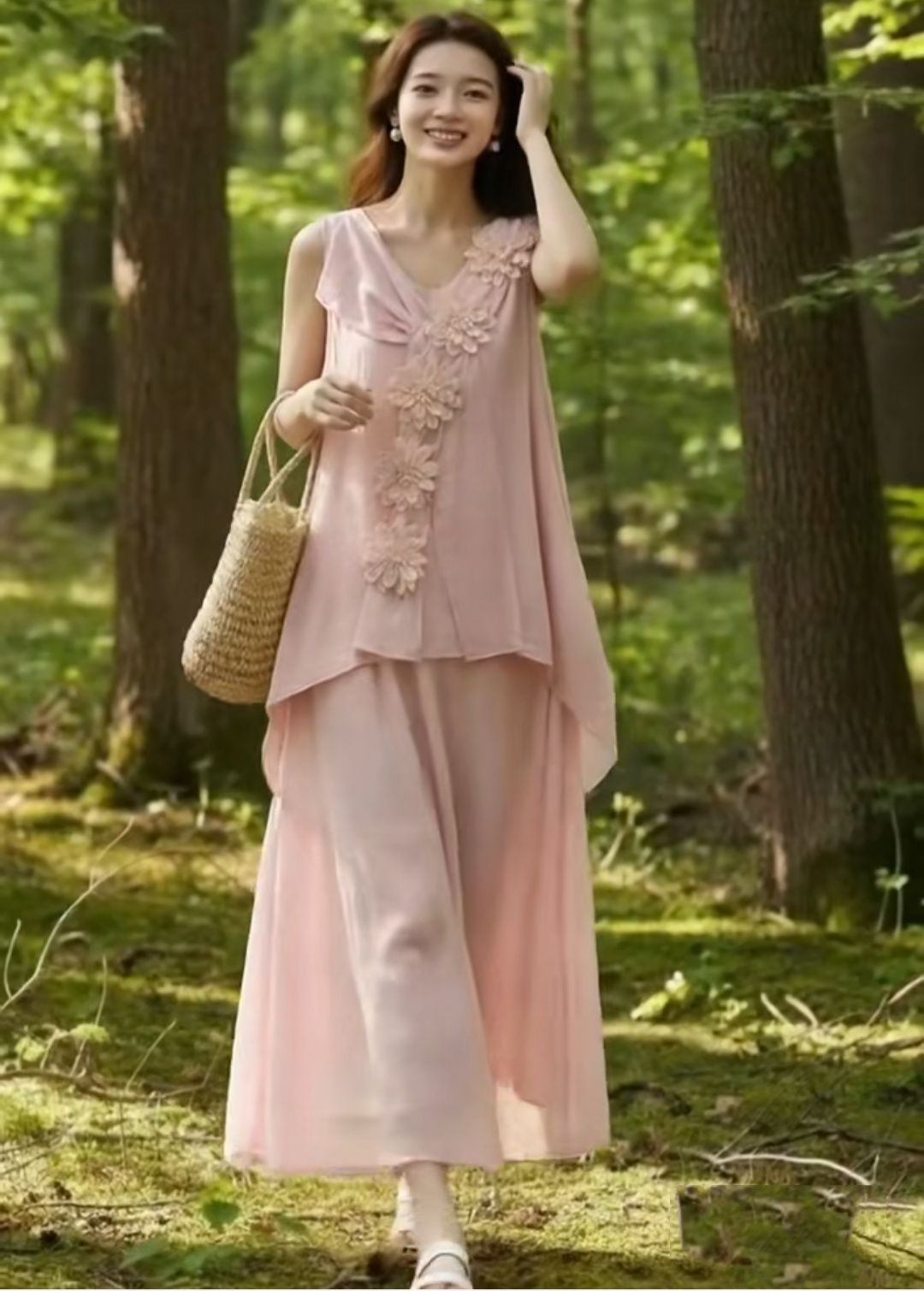 RY3129# 夏季减龄气质甜美v领无袖背心拼接立体花设计法式连衣裙浪漫长裙