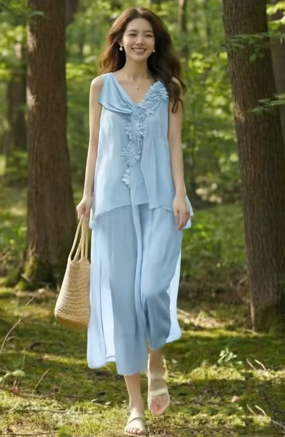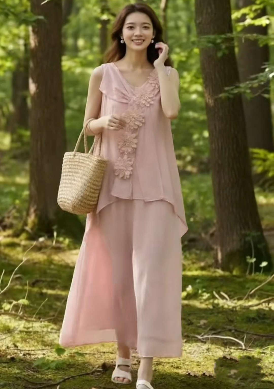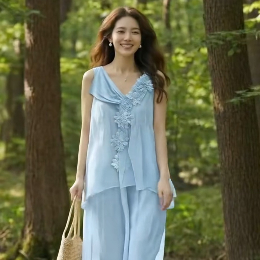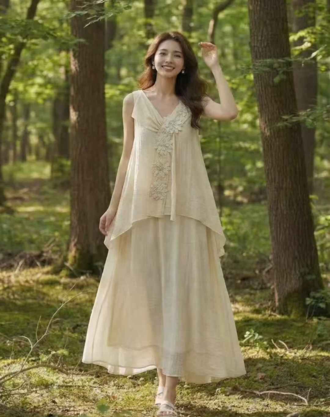 RY3129# 夏季减龄气质甜美v领无袖背心拼接立体花设计法式连衣裙浪漫长裙