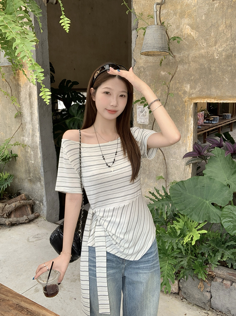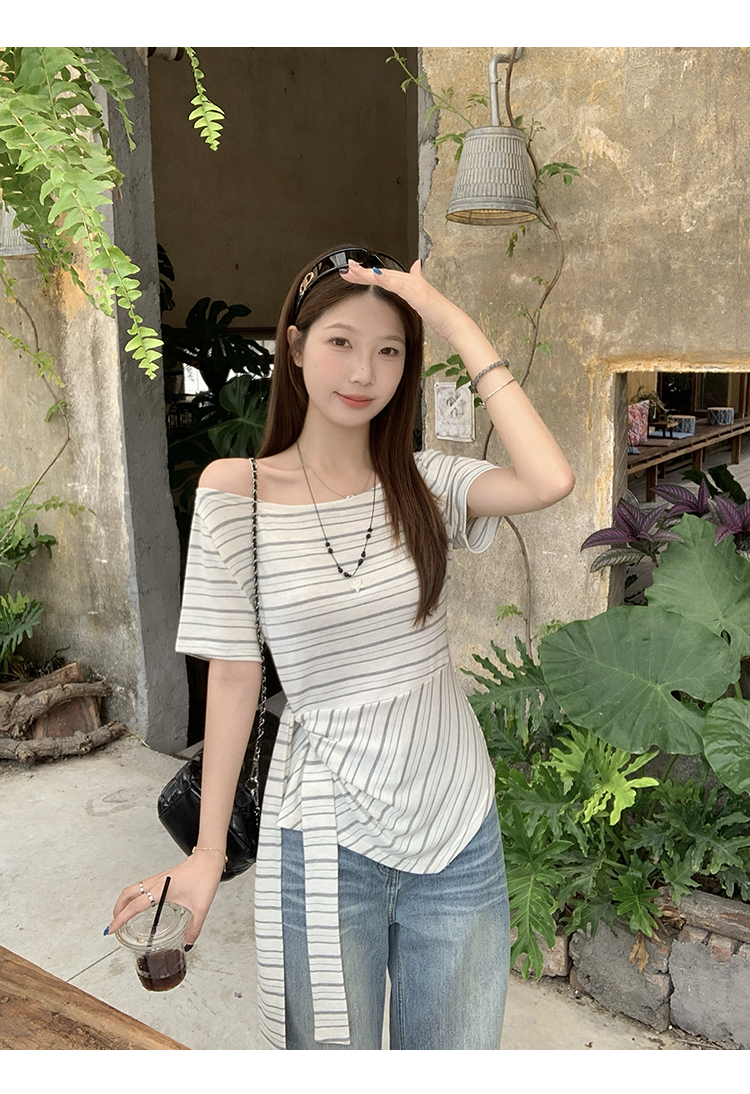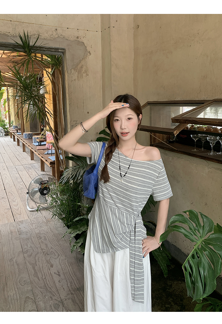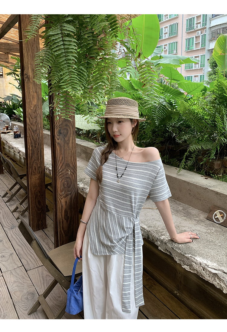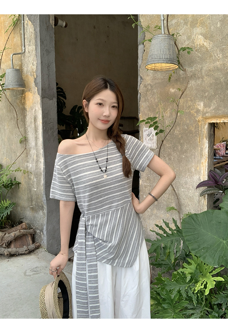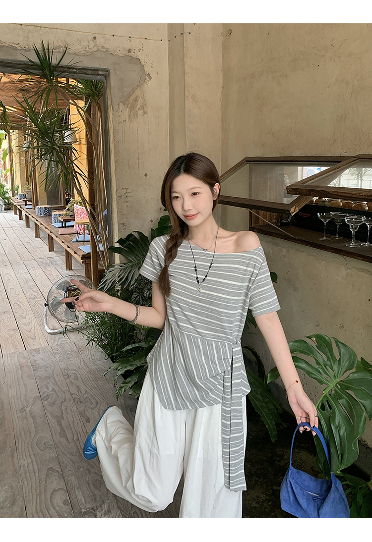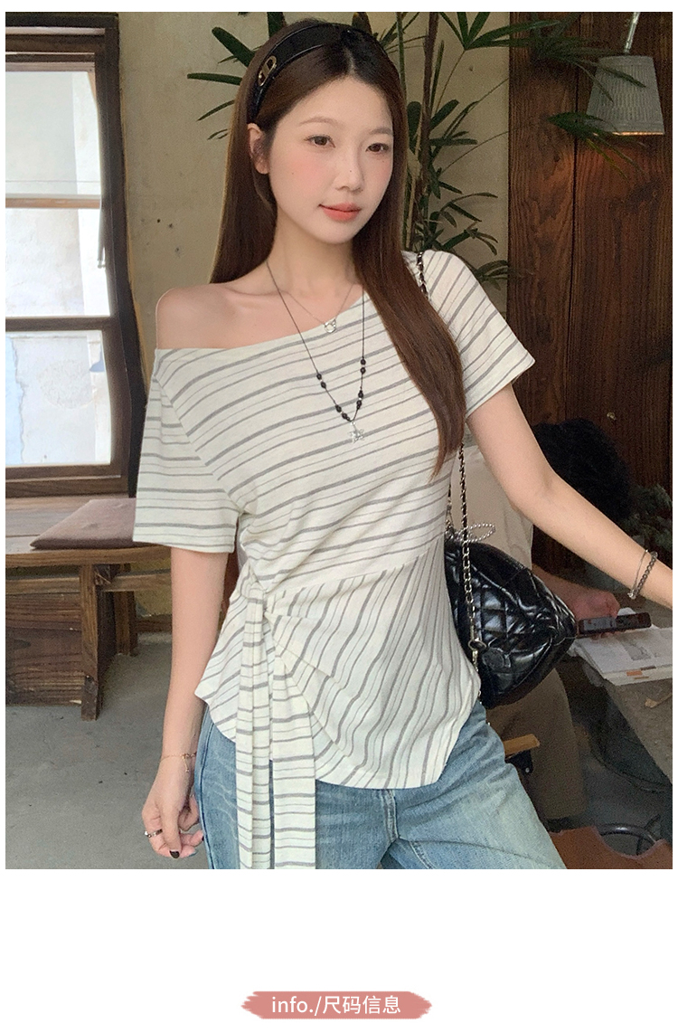 RY3133# 实价实拍2026夏装新款胖mm大码女高级条纹露肩飘带不规则短袖上衣