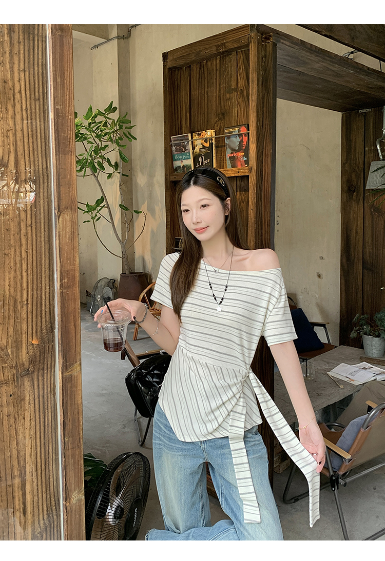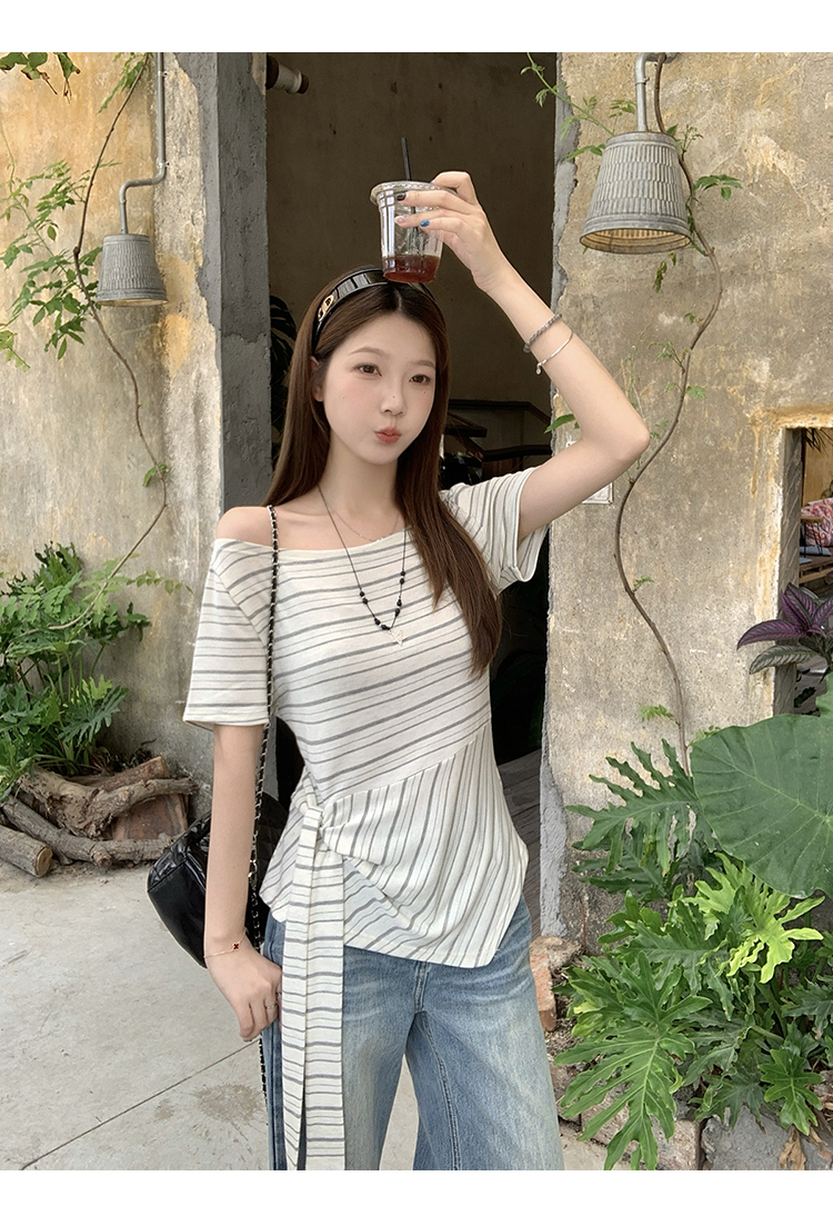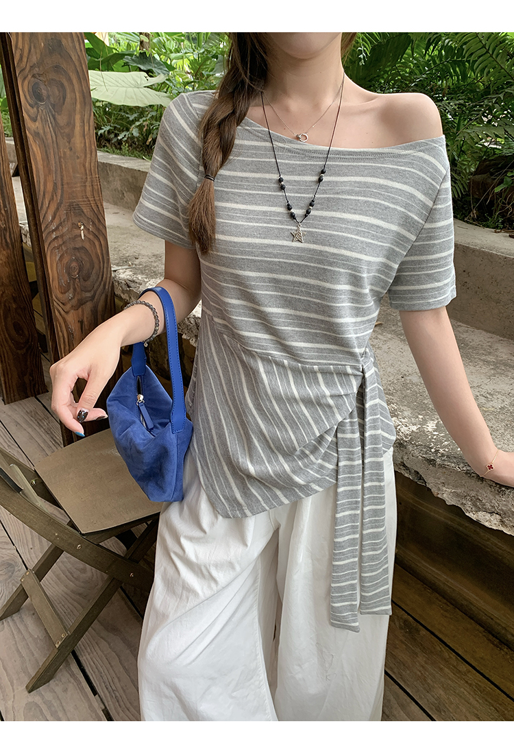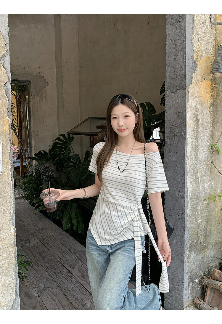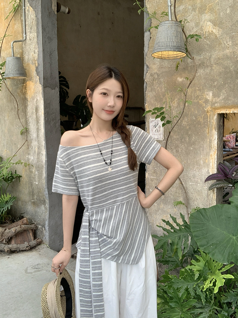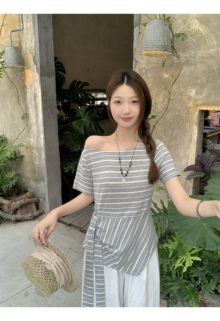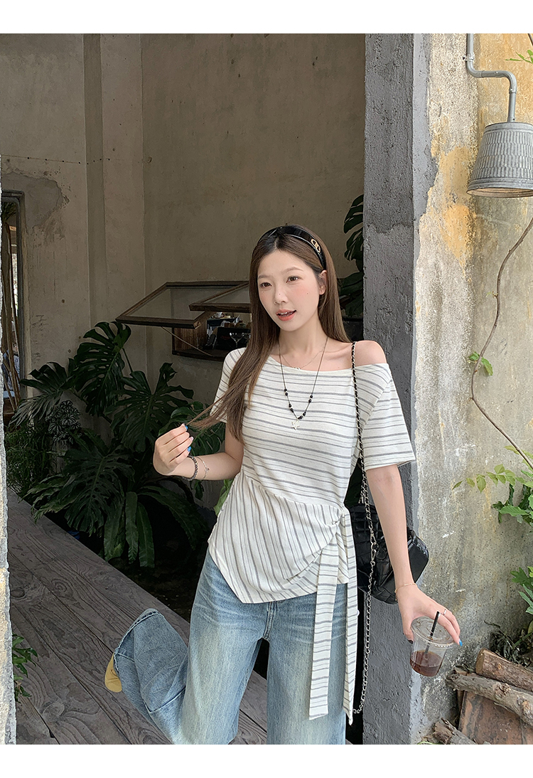 RY3133# 实价实拍2026夏装新款胖mm大码女高级条纹露肩飘带不规则短袖上衣