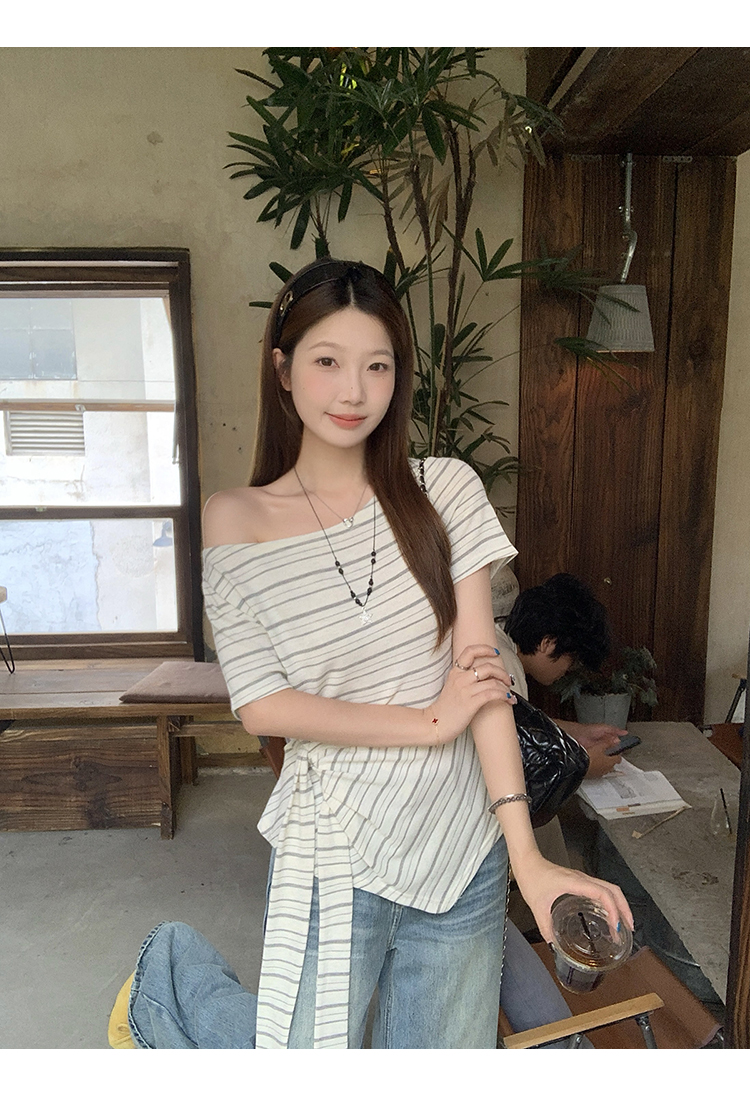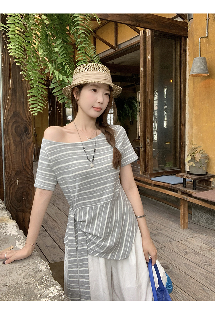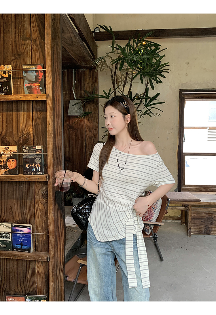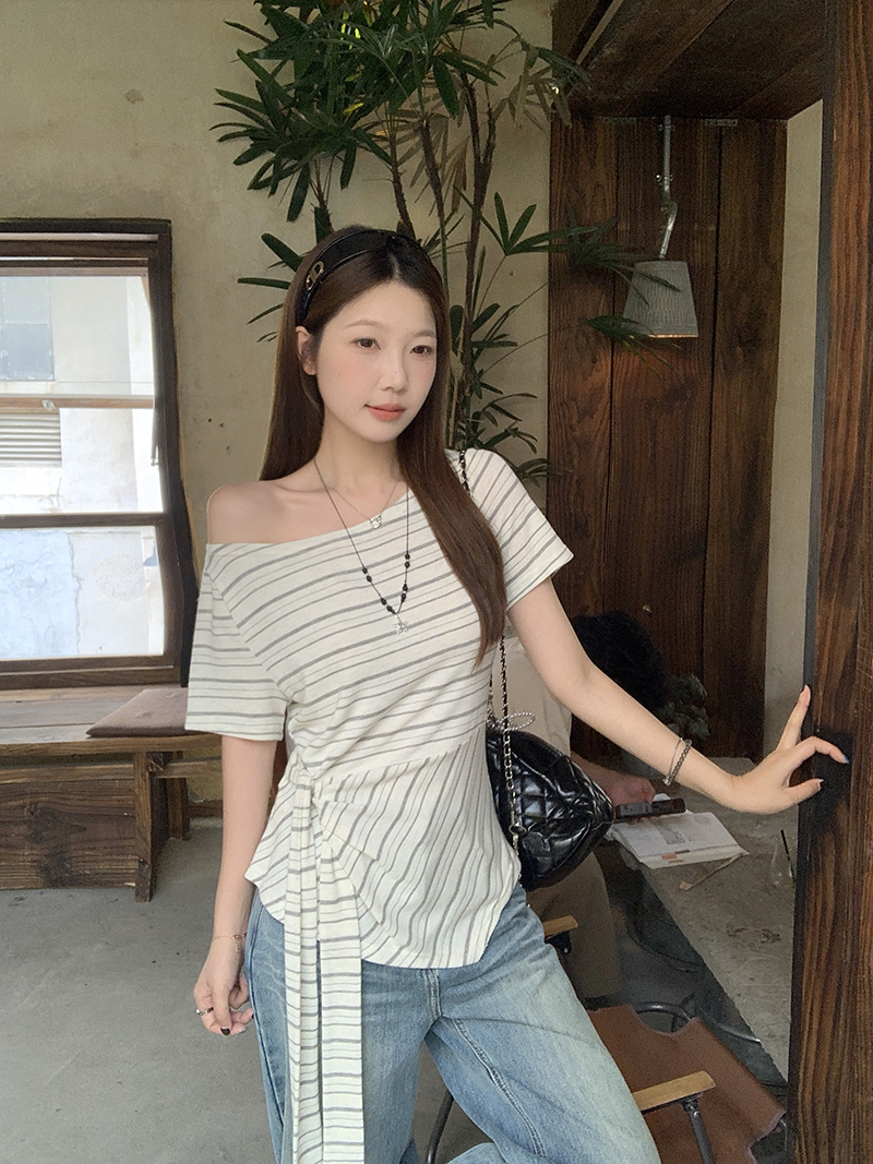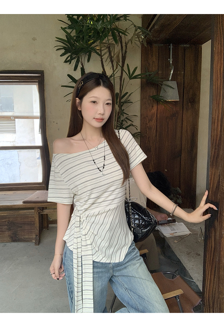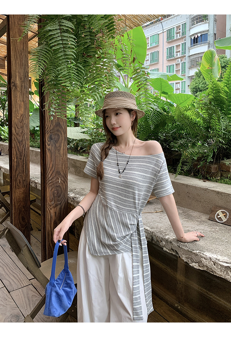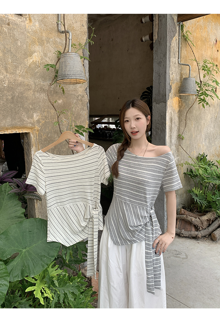 RY3133# 实价实拍2026夏装新款胖mm大码女高级条纹露肩飘带不规则短袖上衣