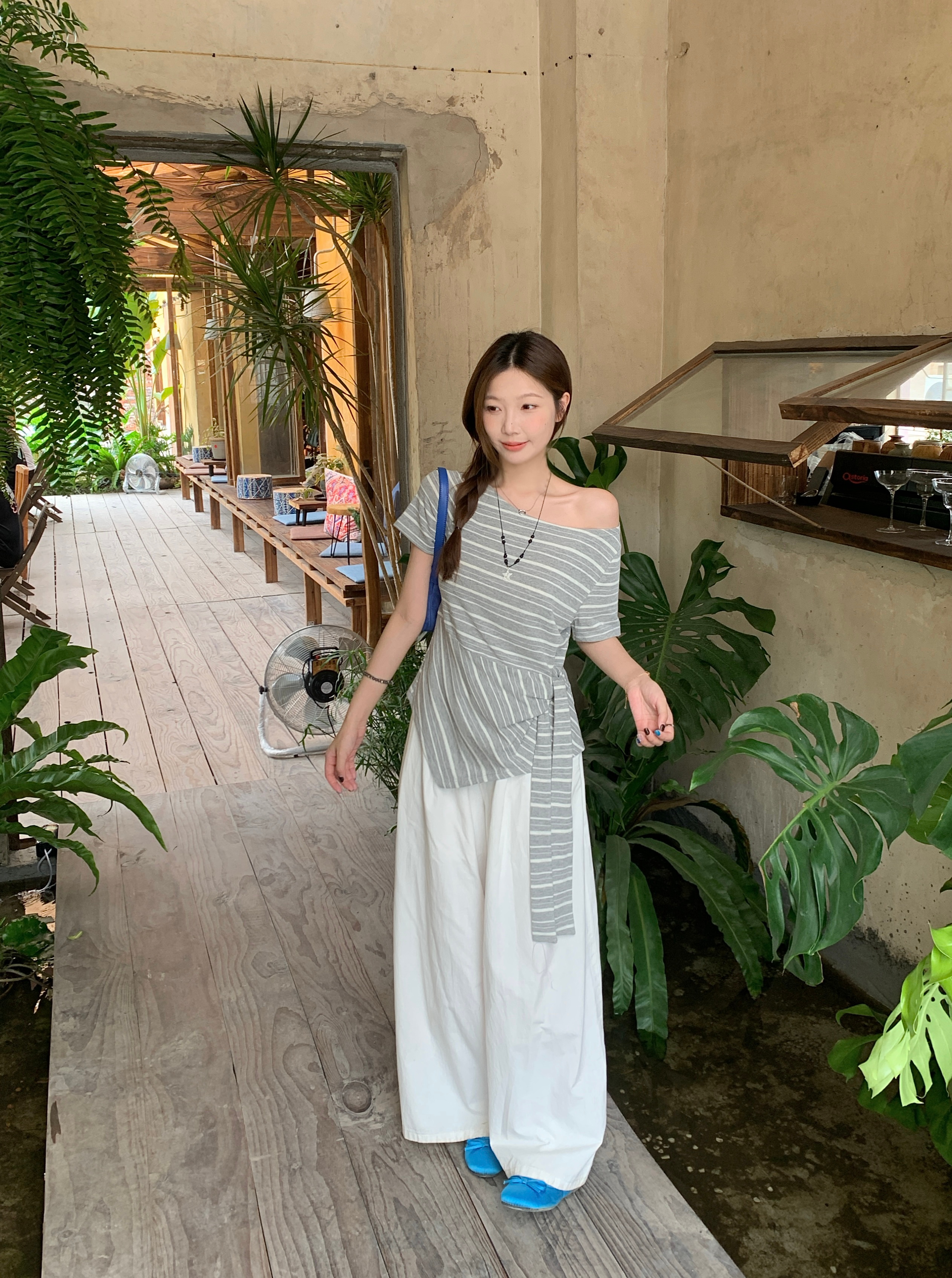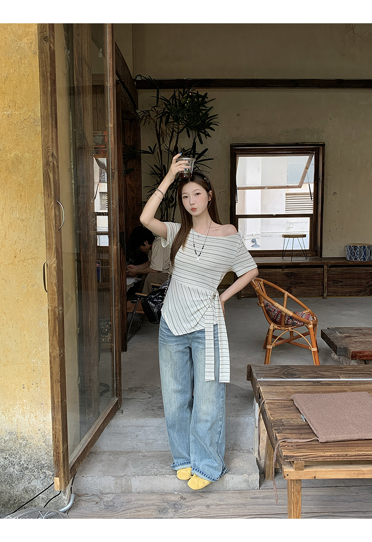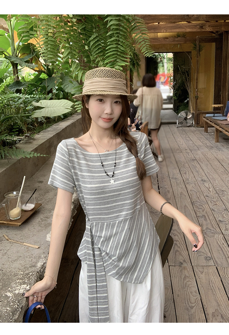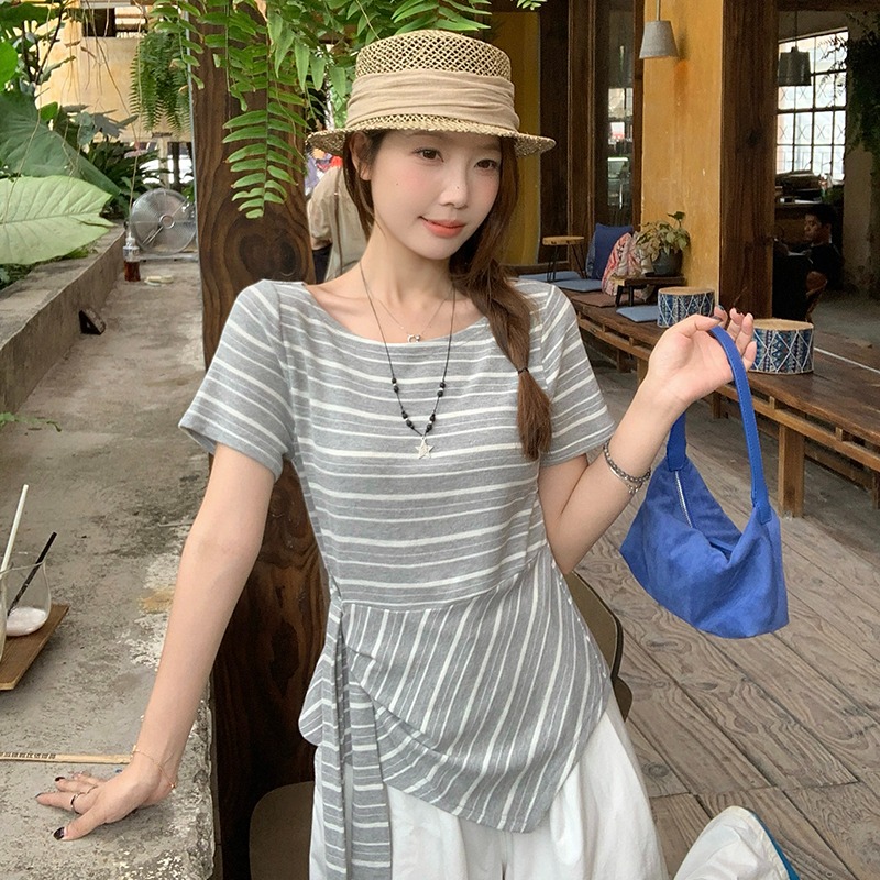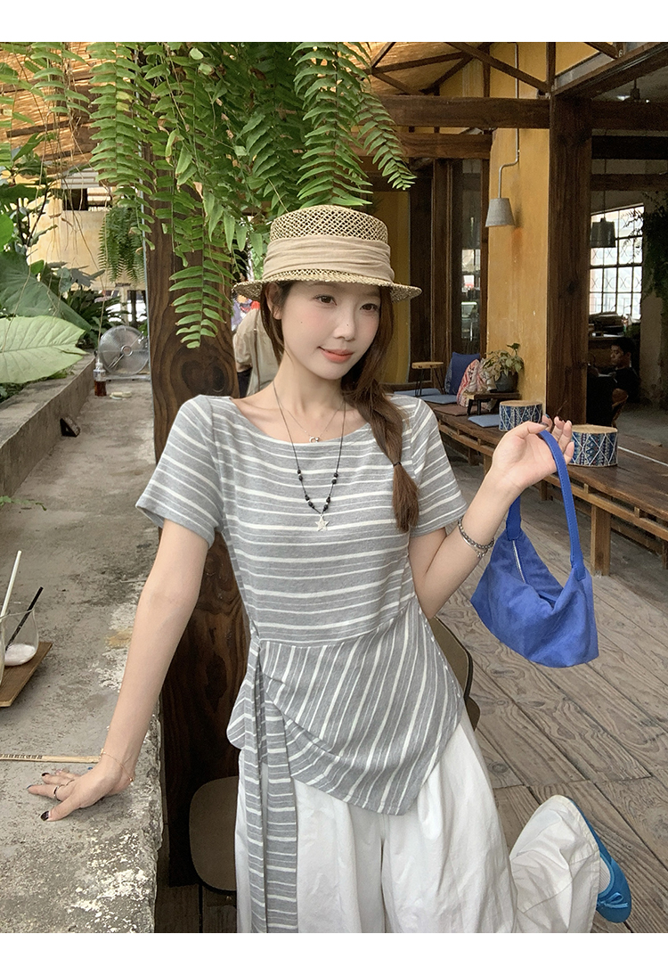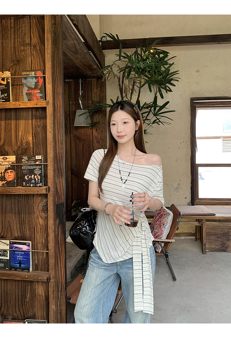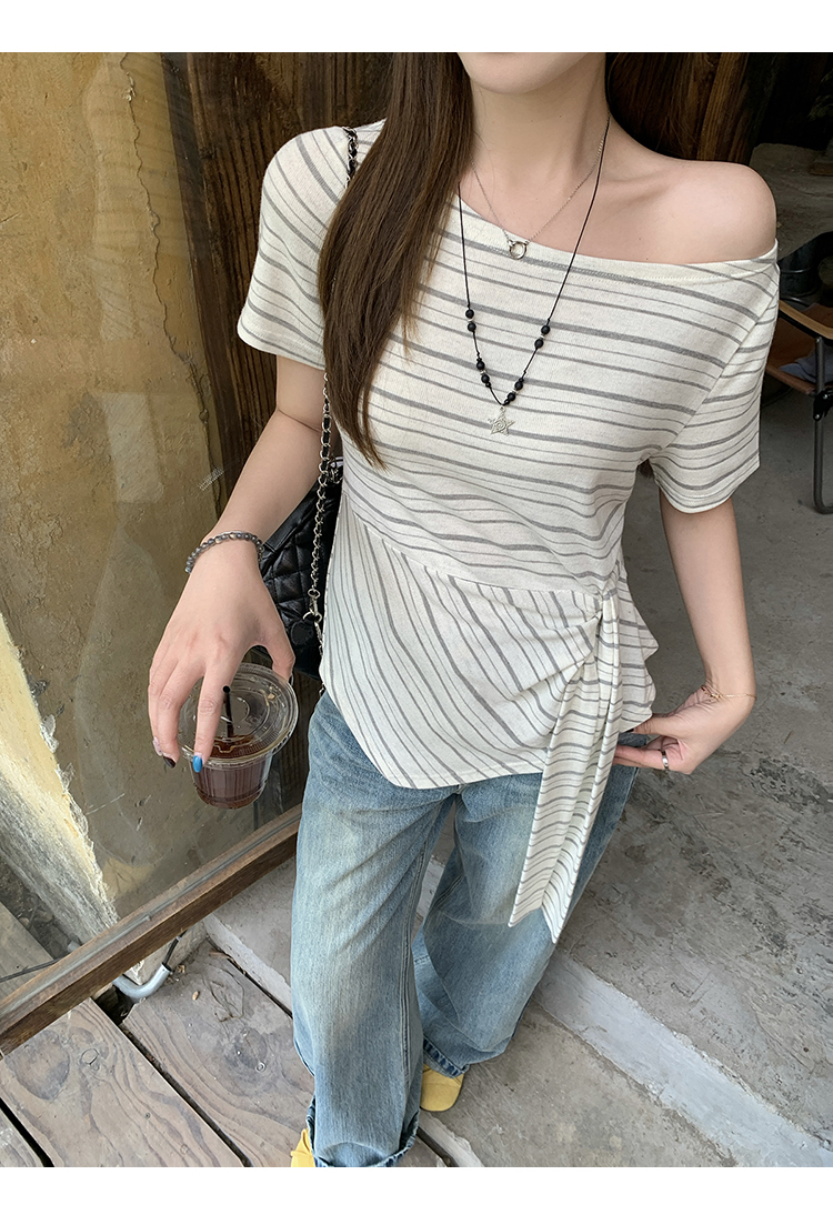RY3133# 实价实拍2026夏装新款胖mm大码女高级条纹露肩飘带不规则短袖上衣