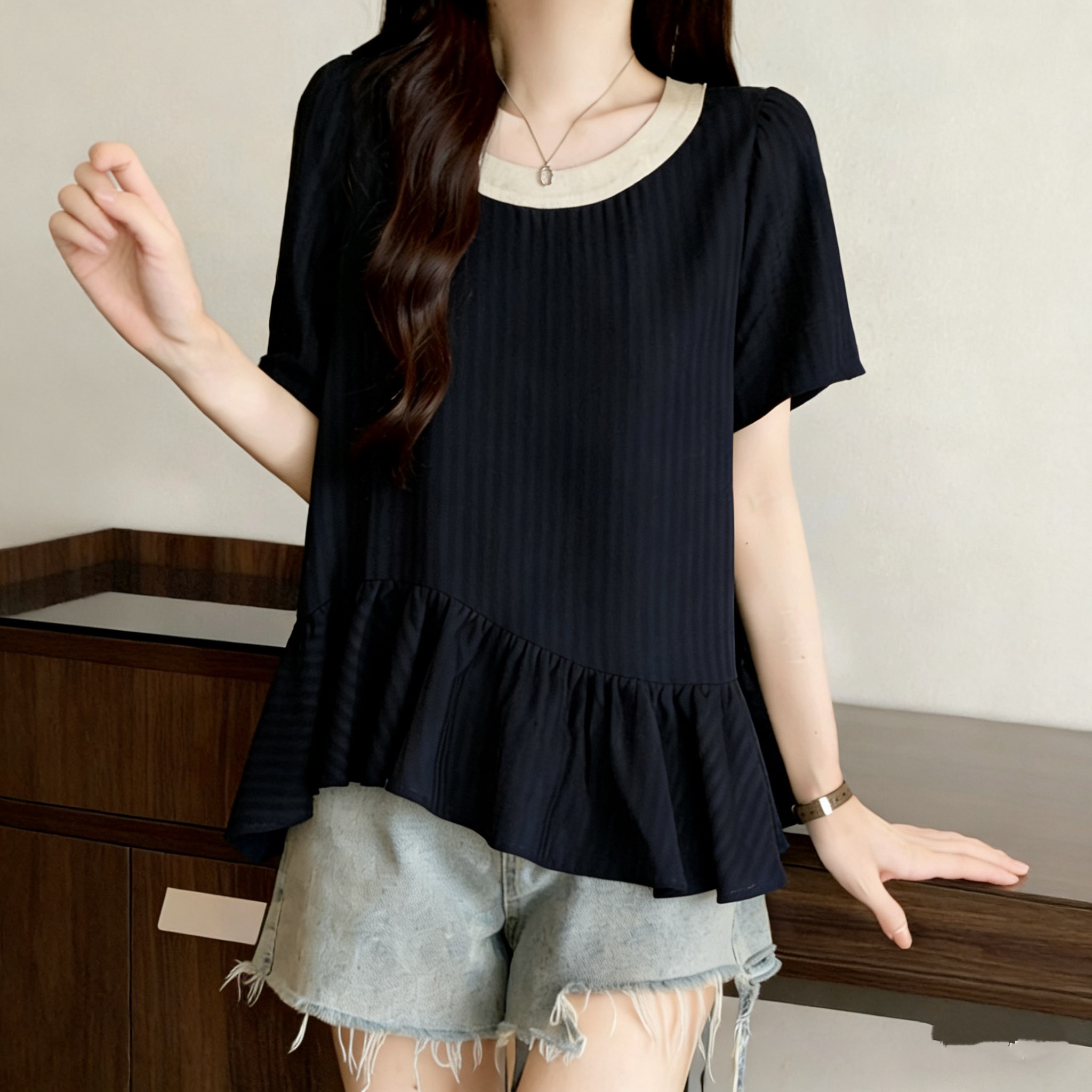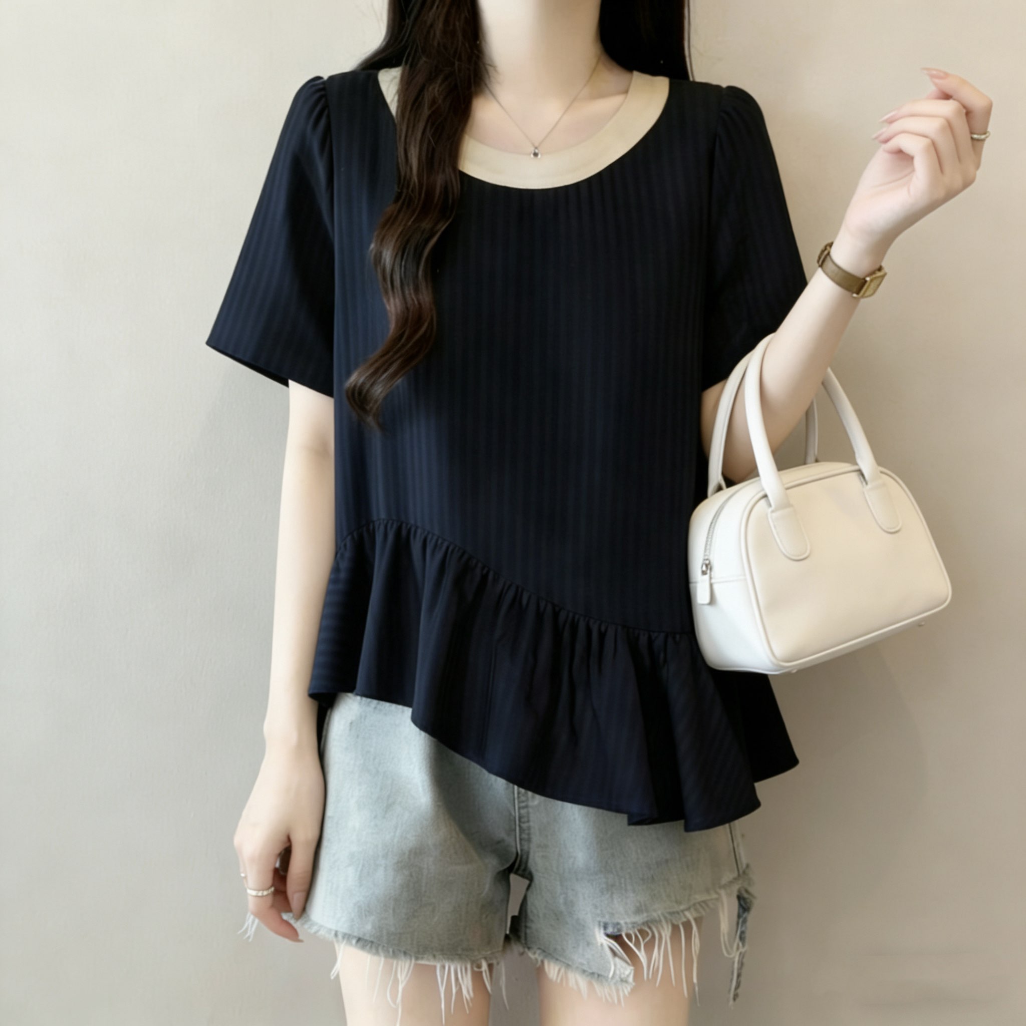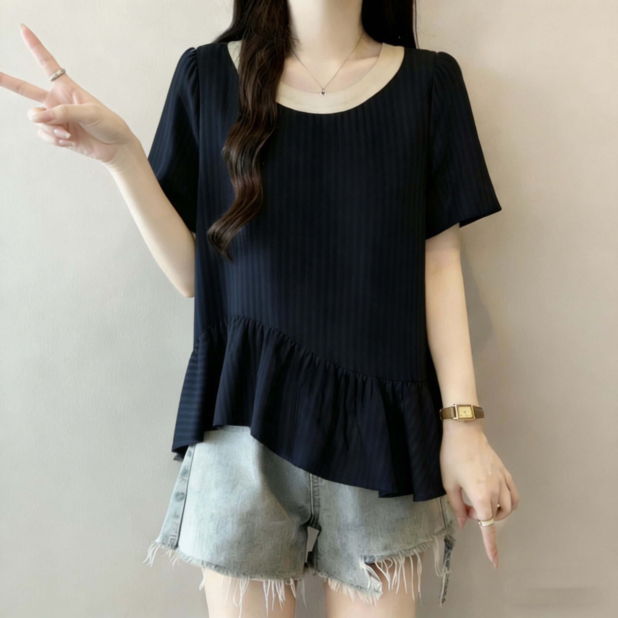 RY3148# 大码女装遮肚子设计感不规则短袖衬衫女夏季胖mm宽松显瘦雪纺上衣