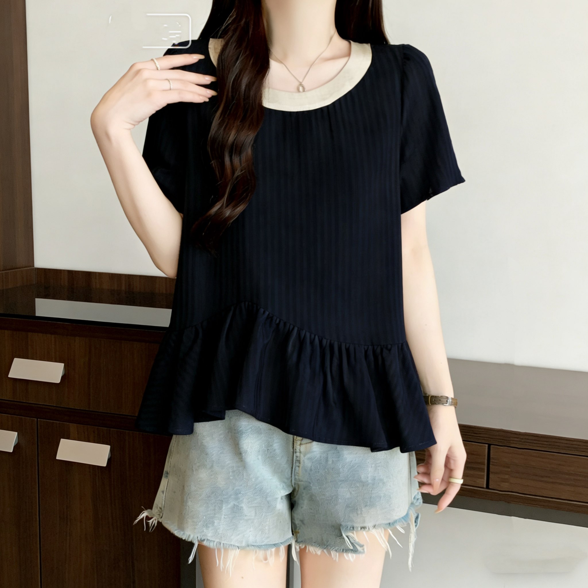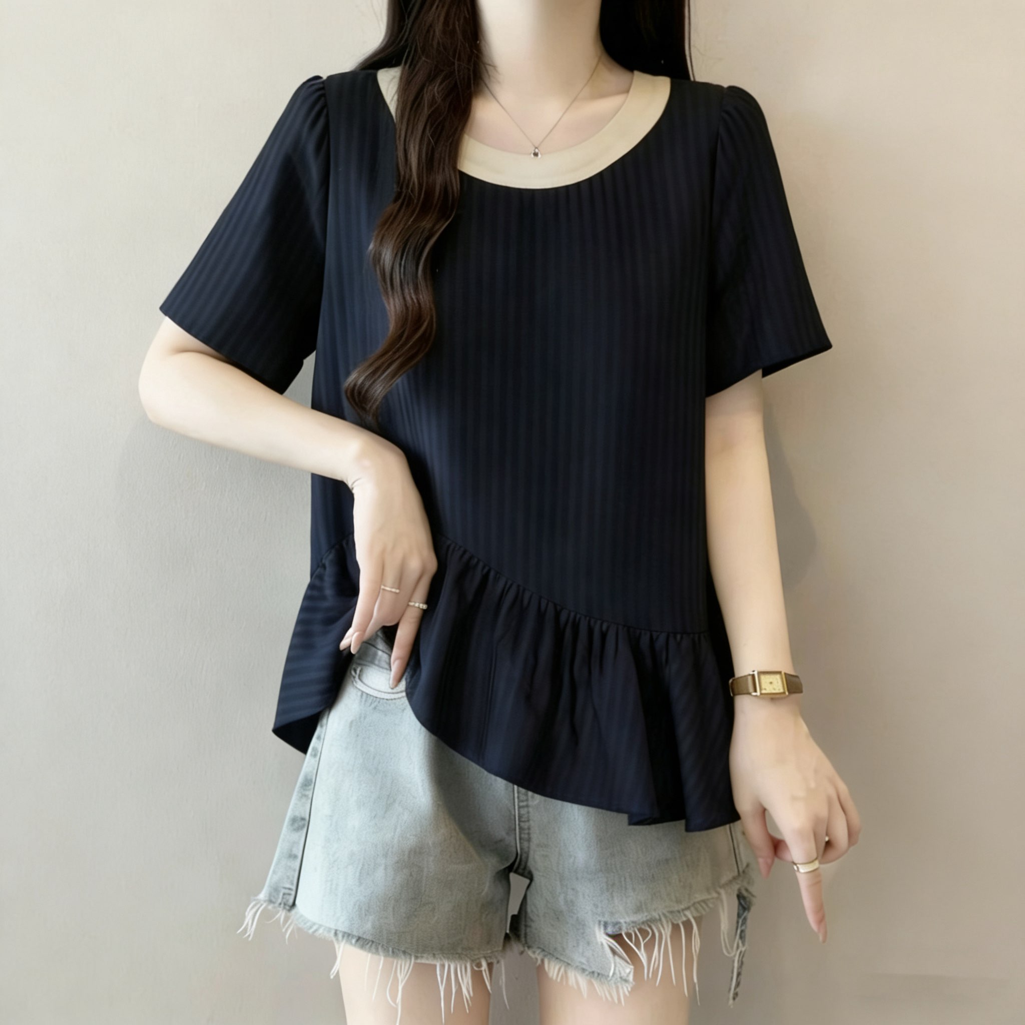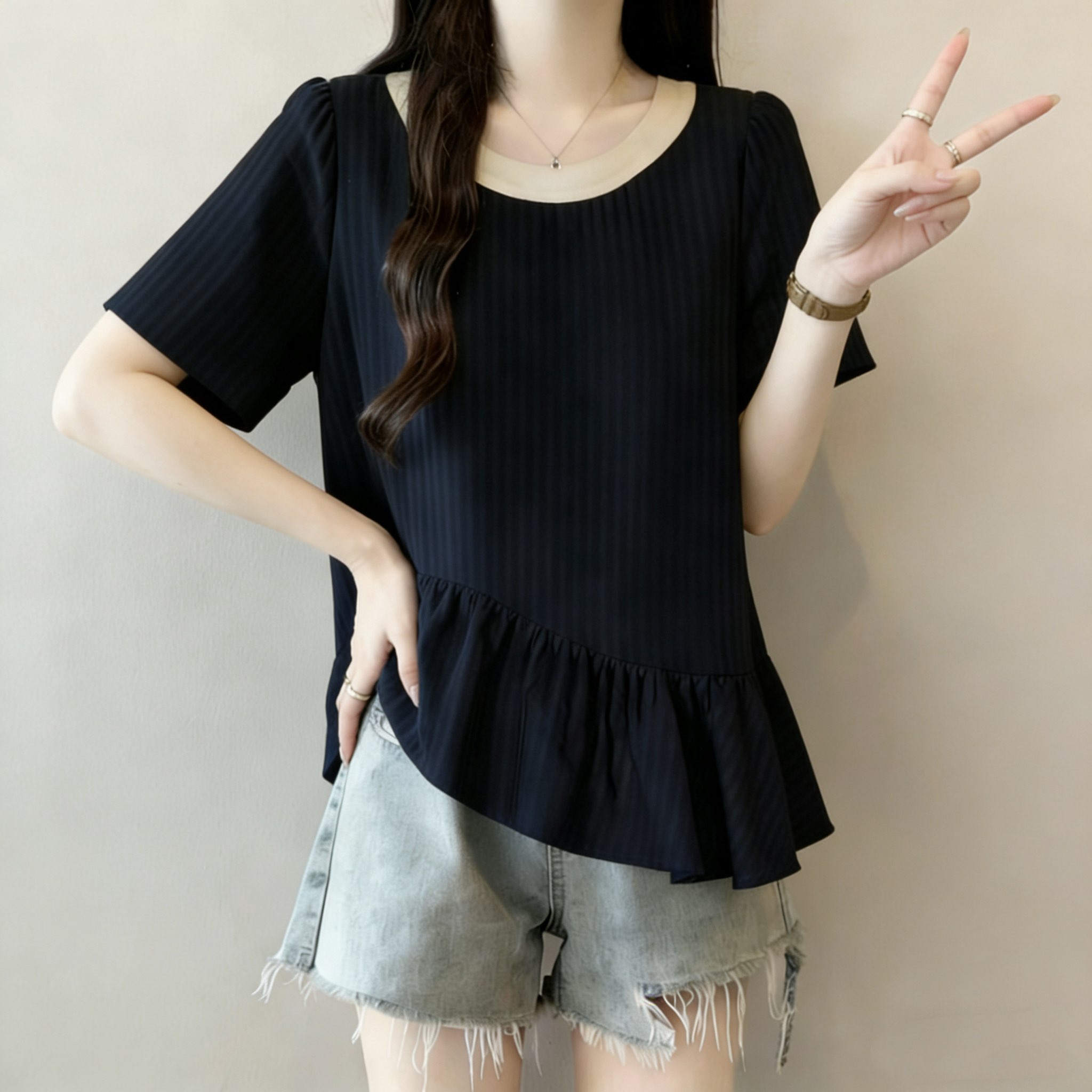 RY3148# 大码女装遮肚子设计感不规则短袖衬衫女夏季胖mm宽松显瘦雪纺上衣