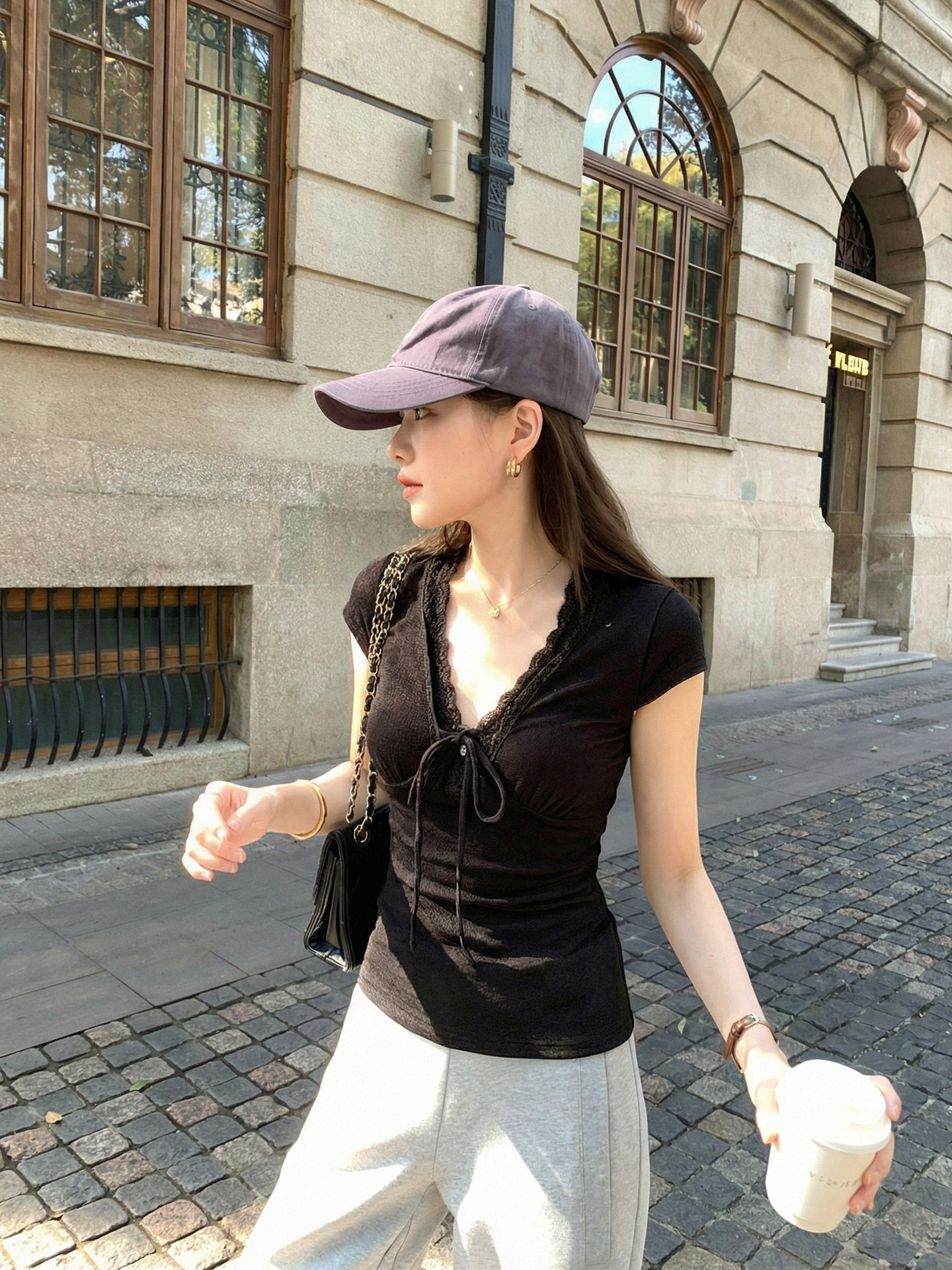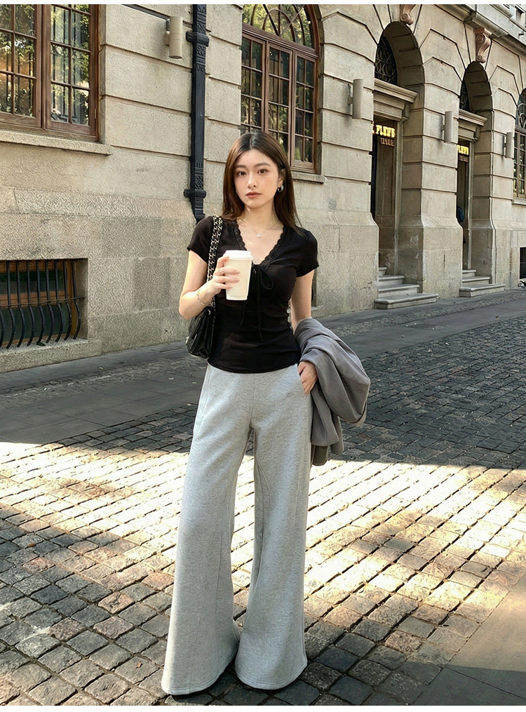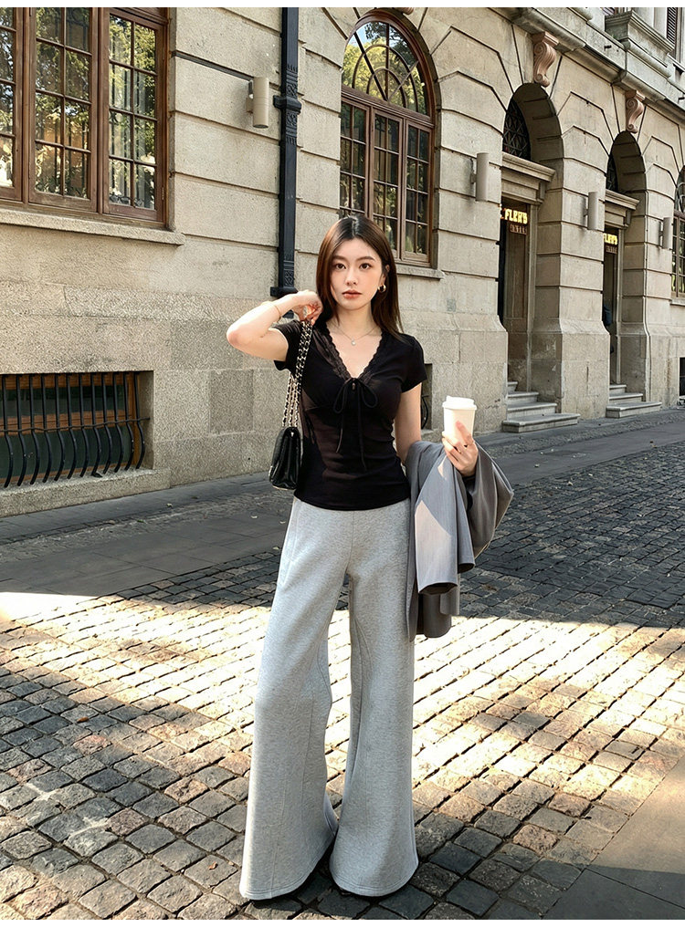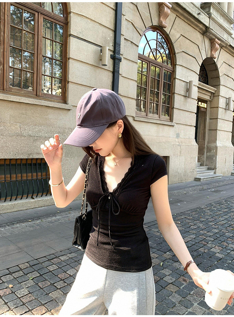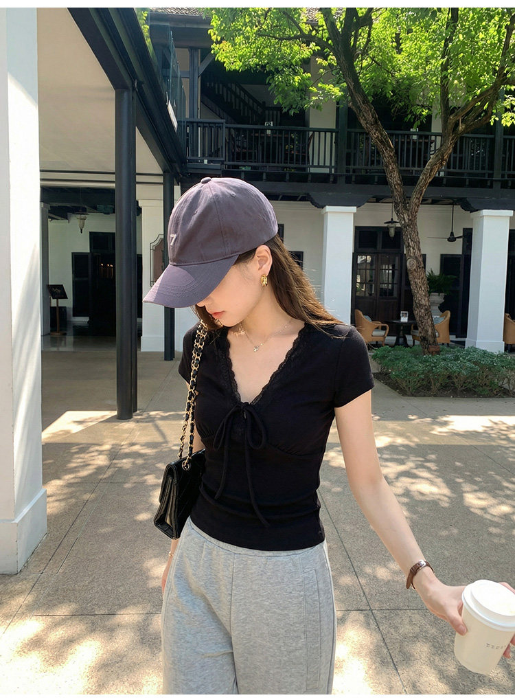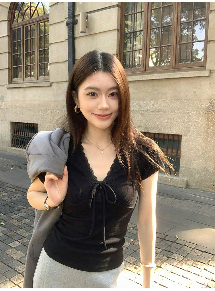 RY3153# 短袖t恤女2026新款夏季黑色半袖短款修身蕾丝拼接漂亮纯棉V领上衣
