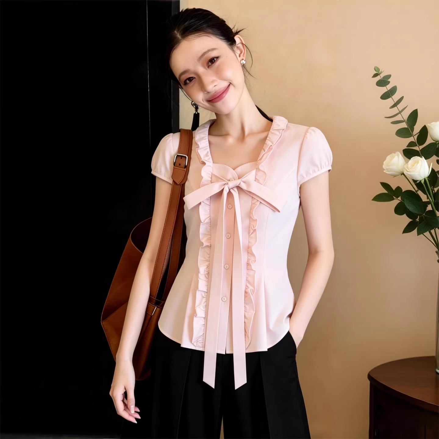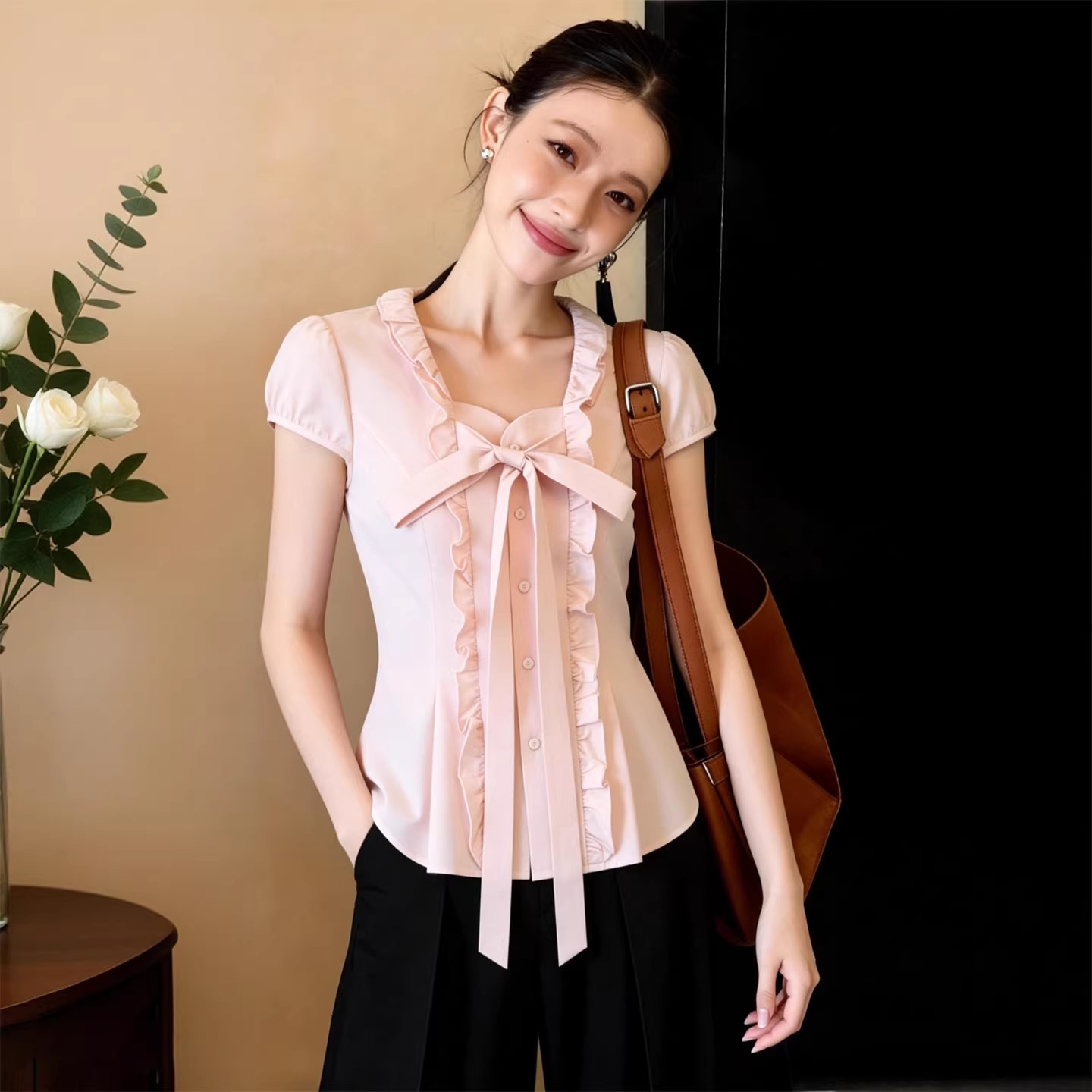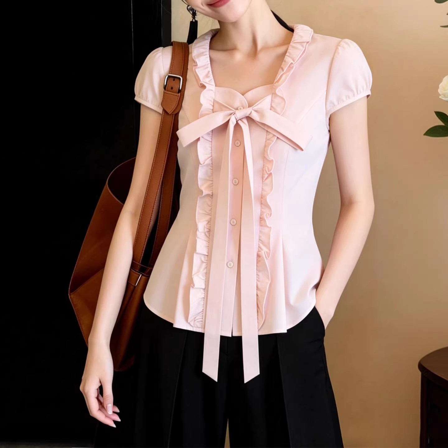 RY3154# 韩系甜美蝴蝶结泡泡袖衬衫女2026夏季新款显瘦百搭木耳边上衣潮