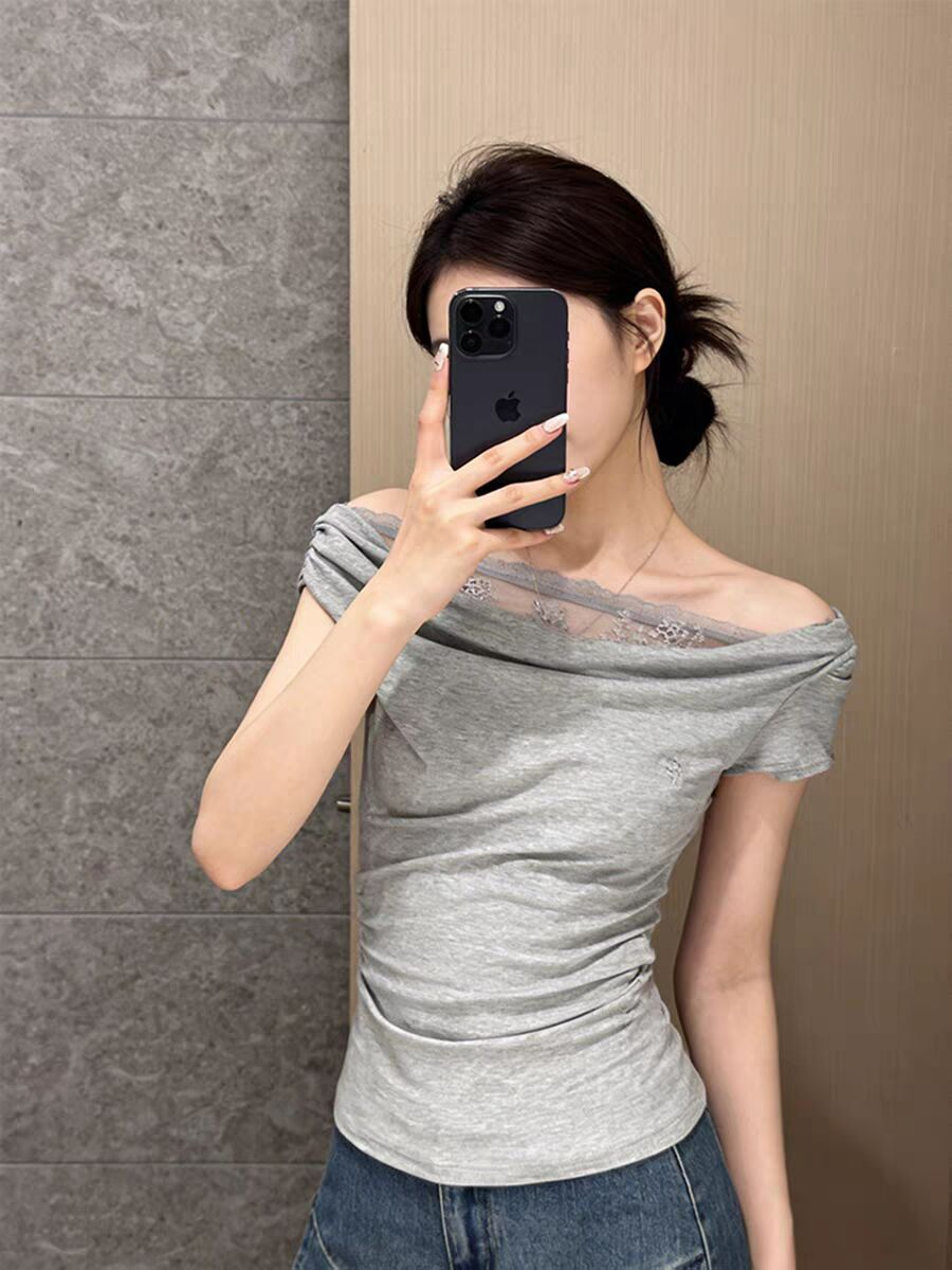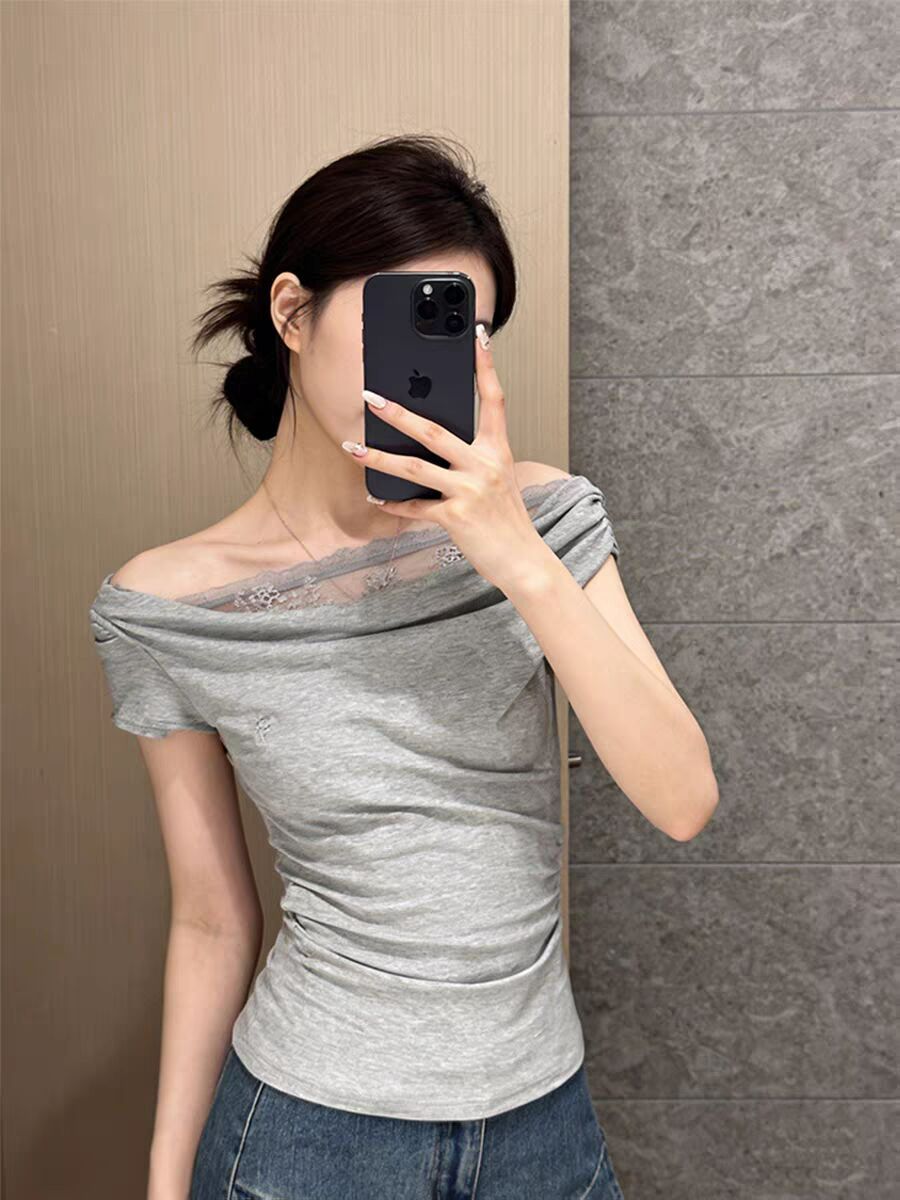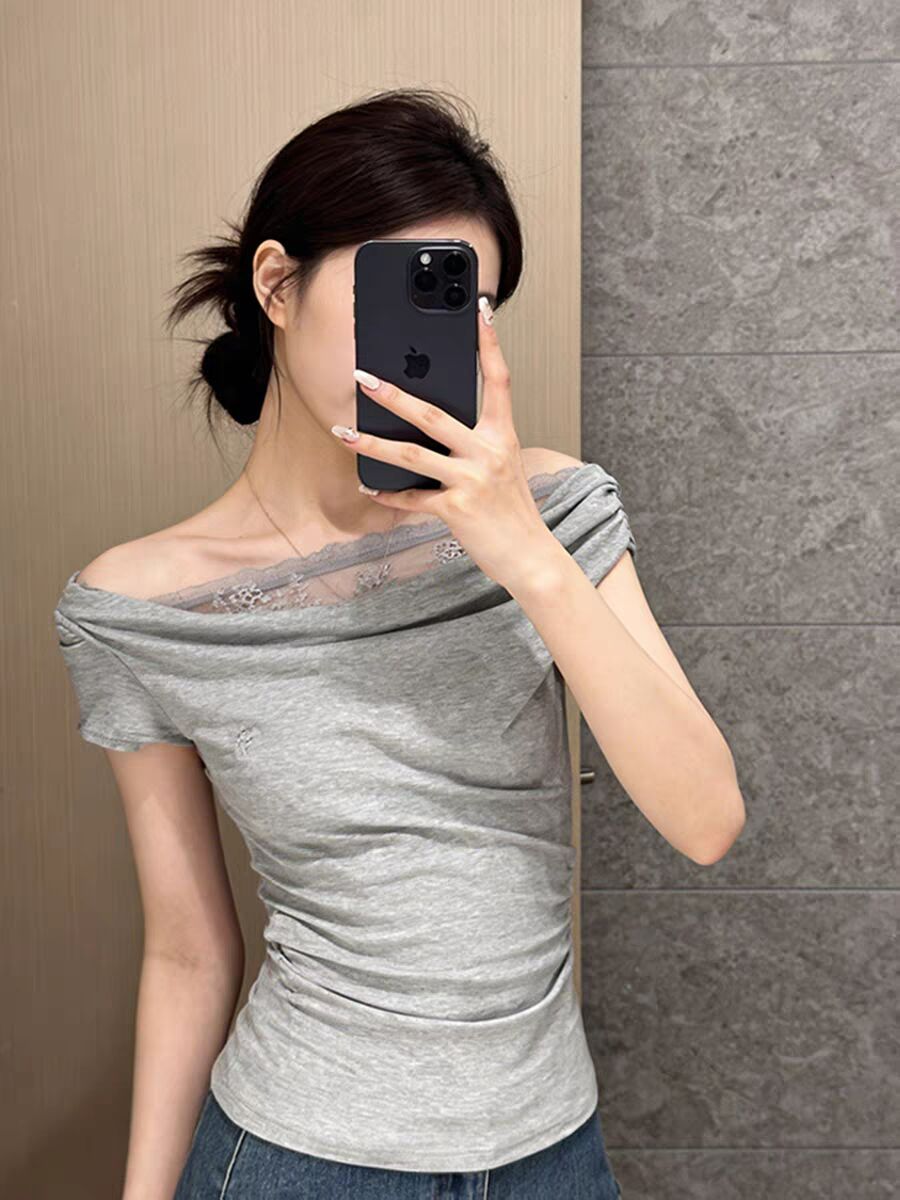 RY3157# 人棉拼接蕾丝+刺绣韩系蕾丝拼接气质短袖女