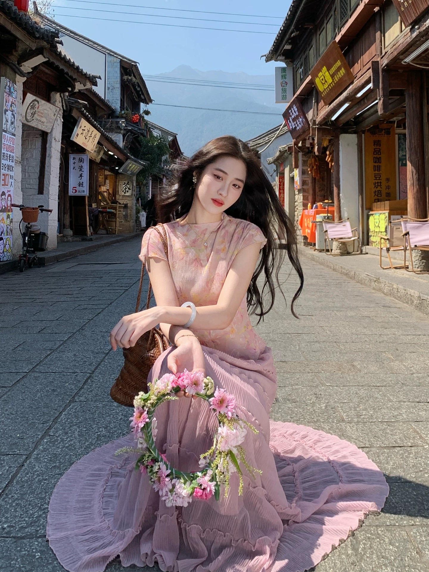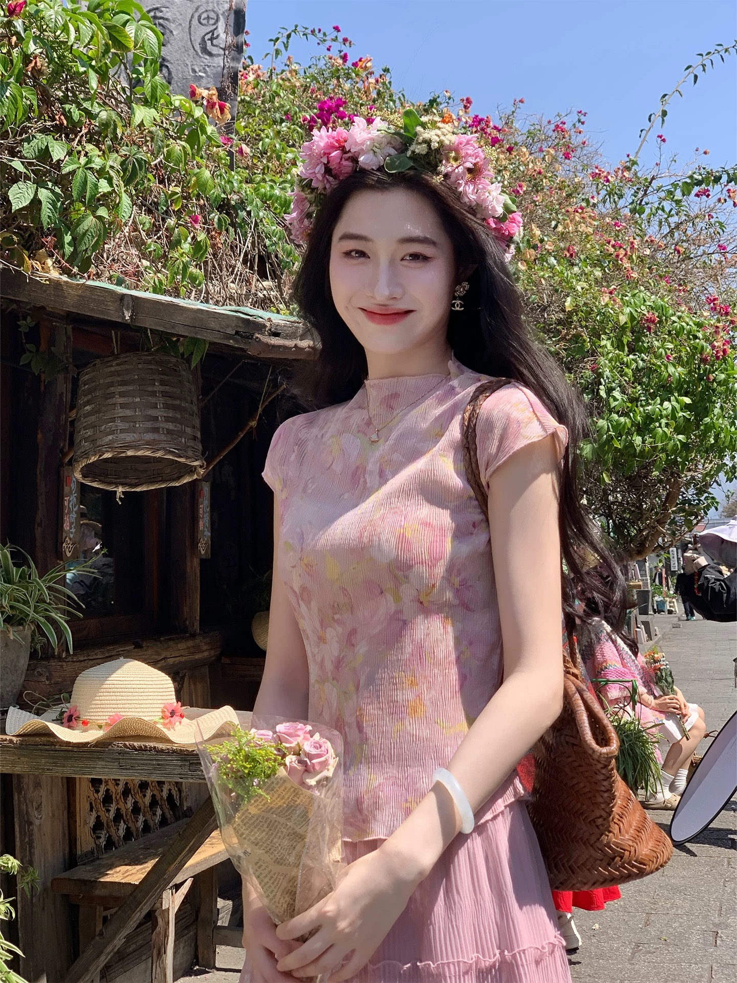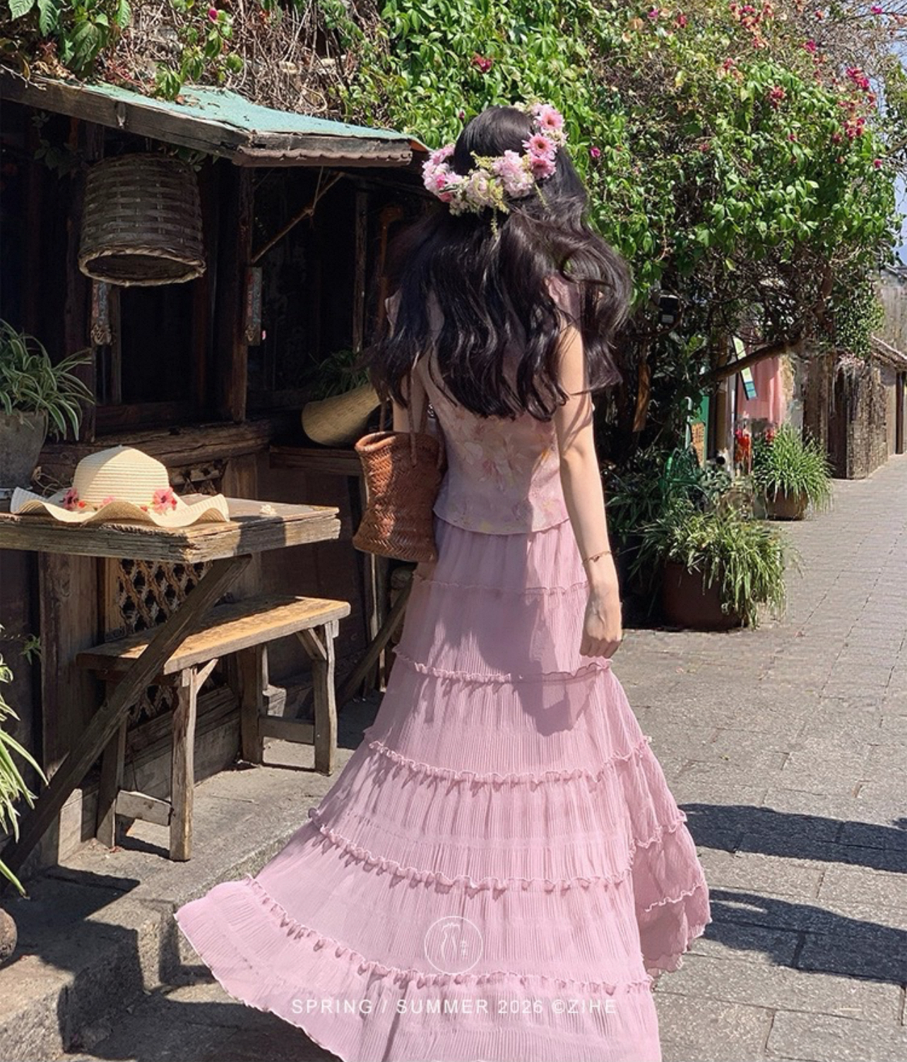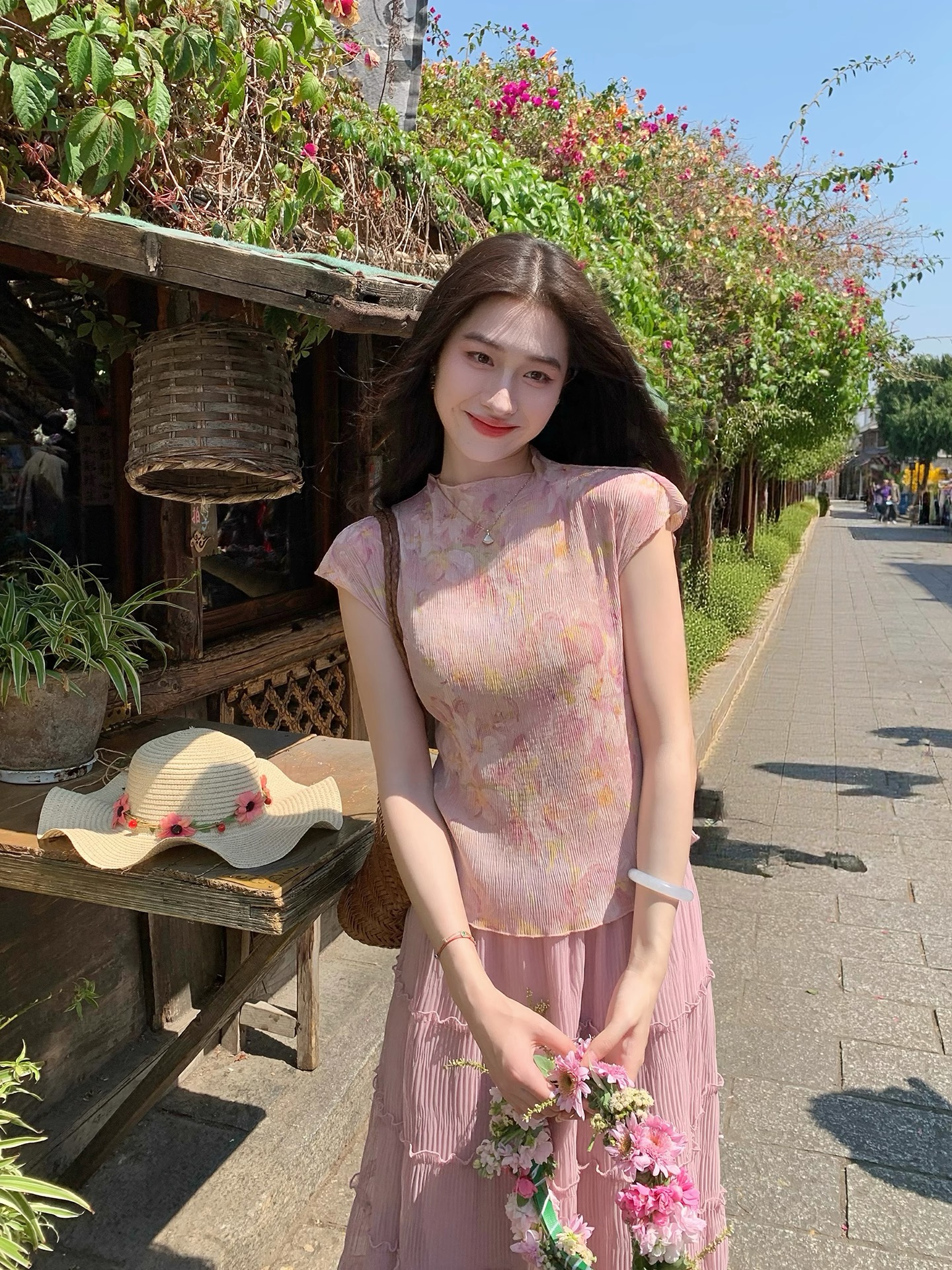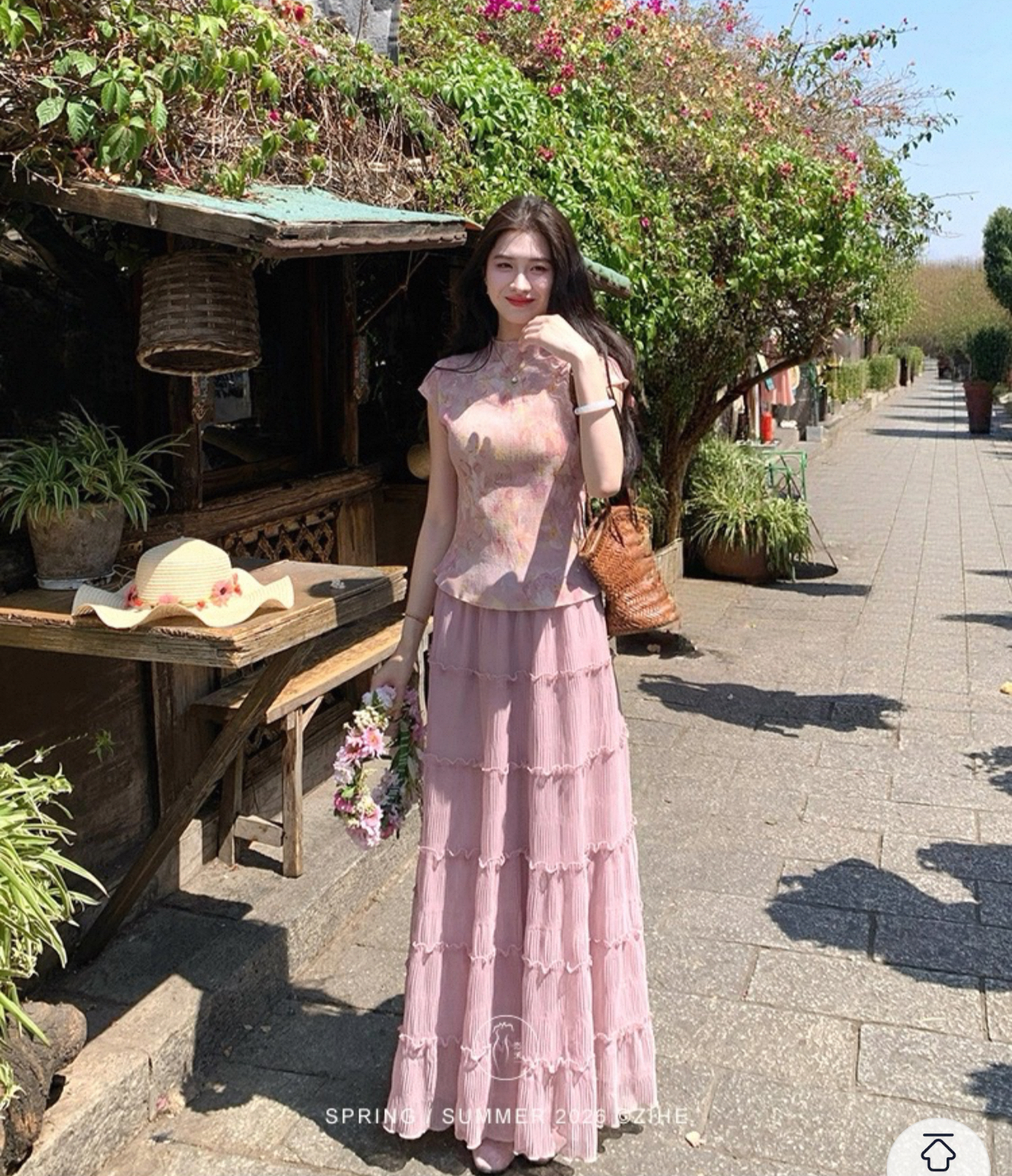 RY3161# 凌茜恣禾雾间晓花国风新中式短款碎花肌理感晕染显上衣+裙子套装