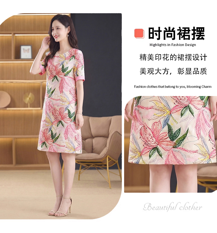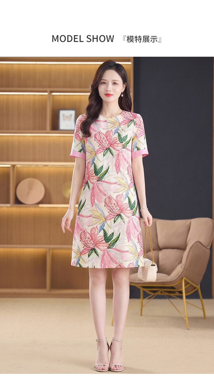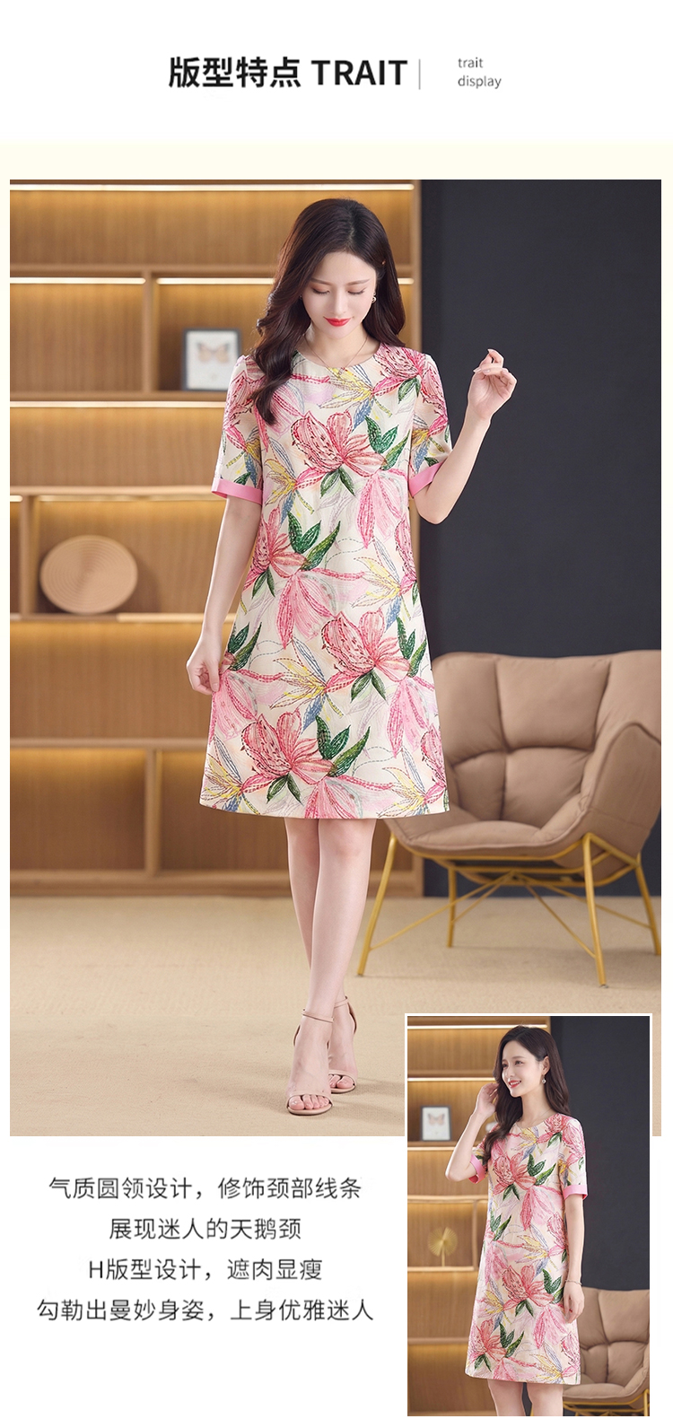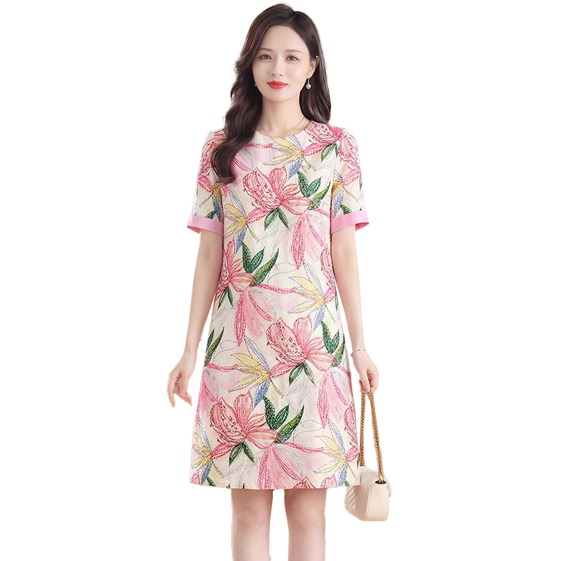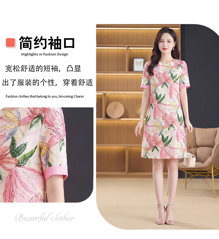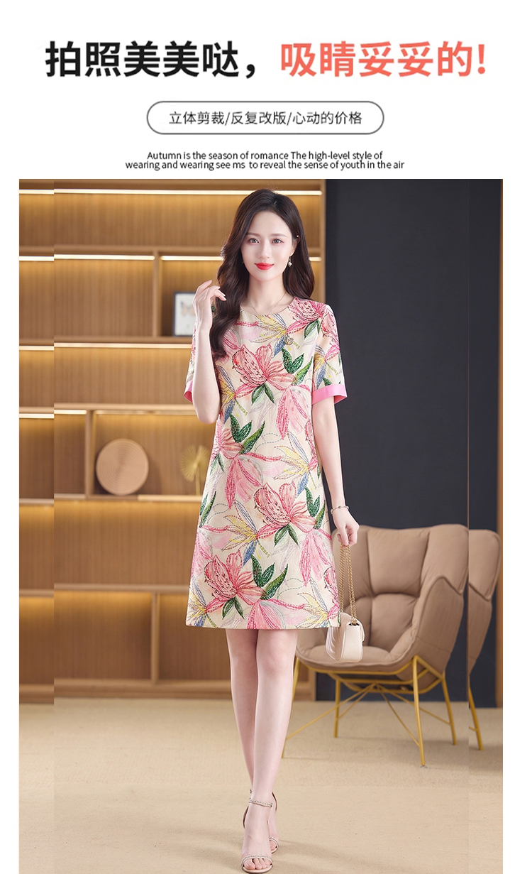 RY3165# 高级感线条百合花2026夏季新款女装精棉重工订珠圆领短袖连衣裙