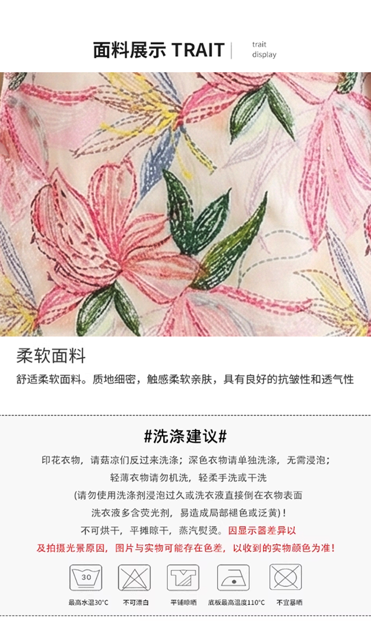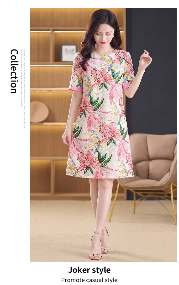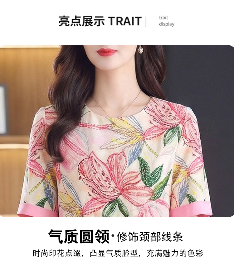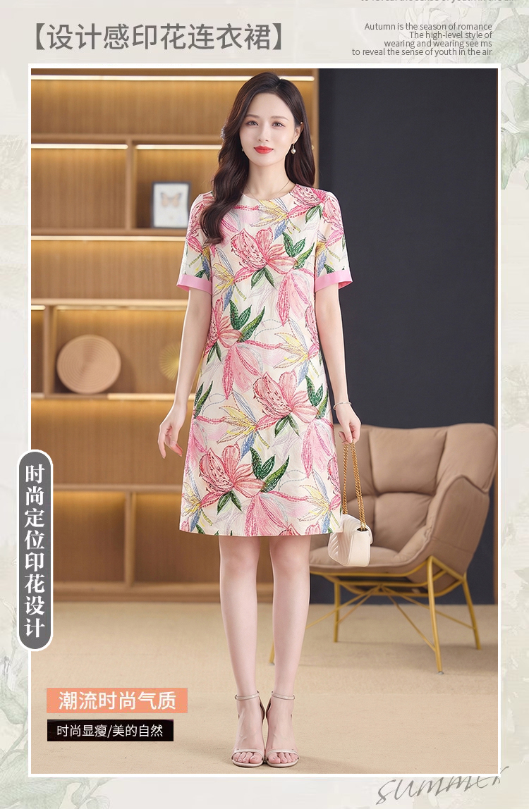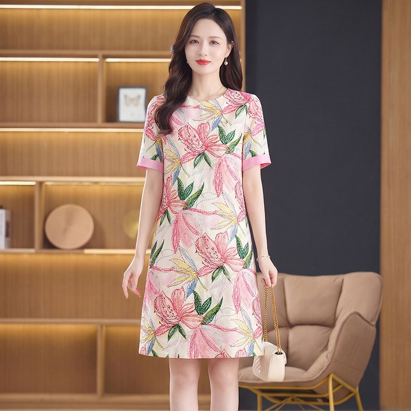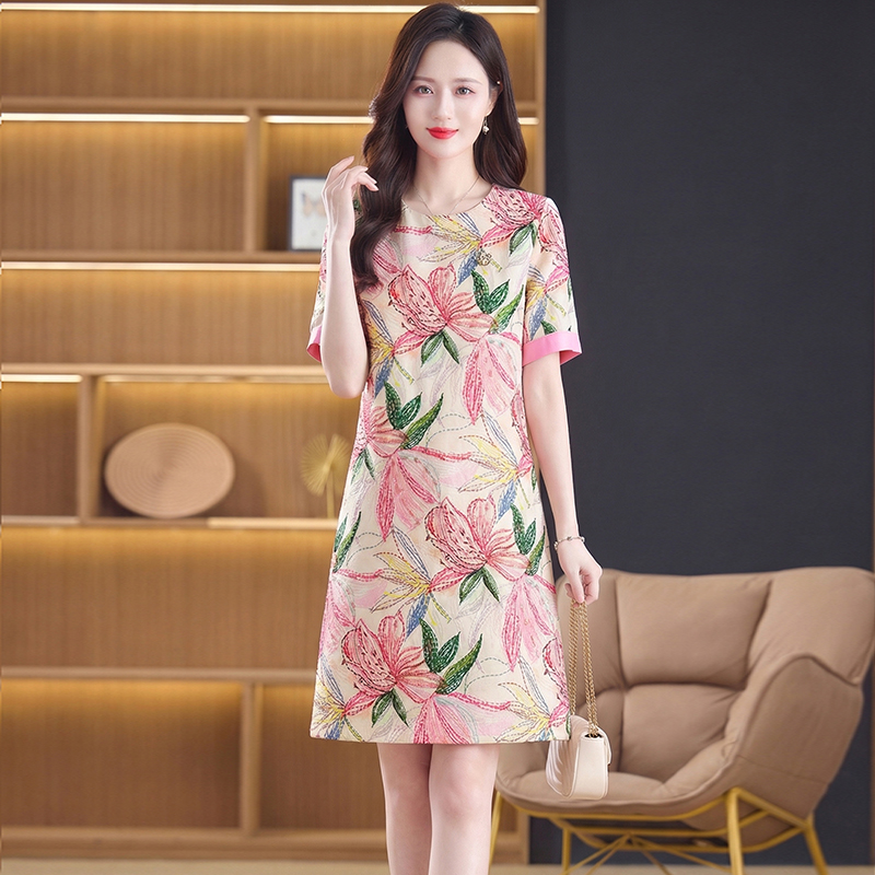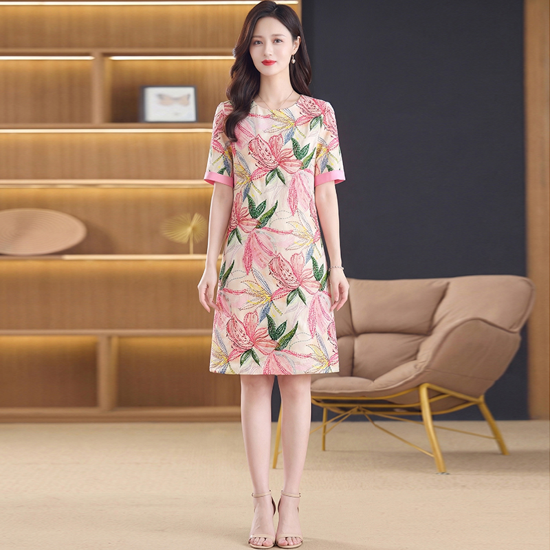 RY3165# 高级感线条百合花2026夏季新款女装精棉重工订珠圆领短袖连衣裙