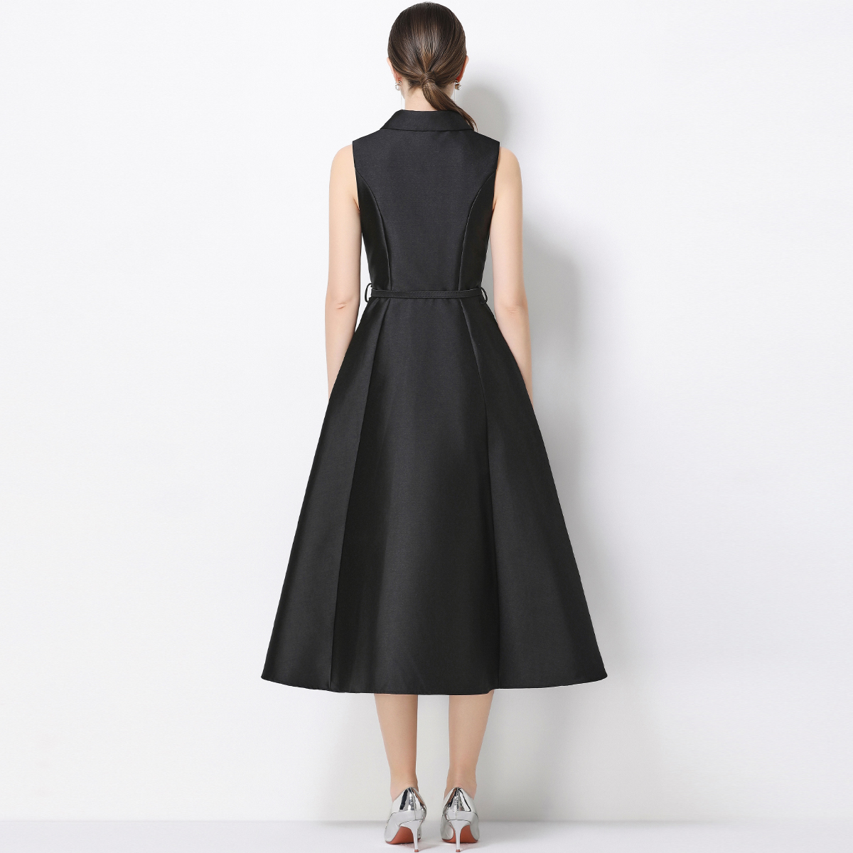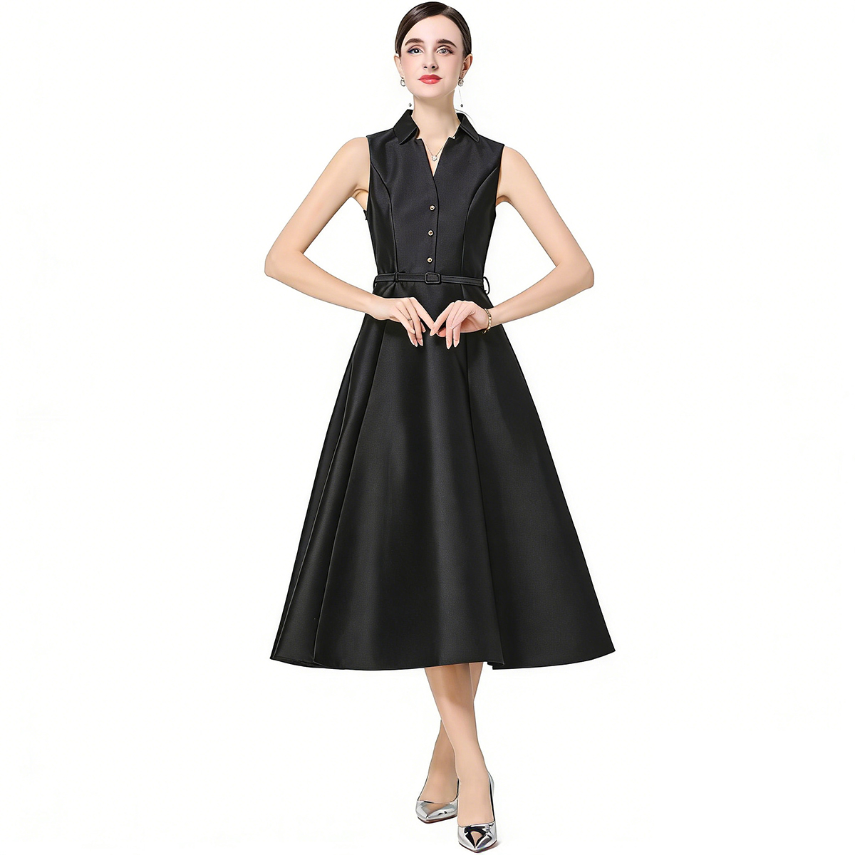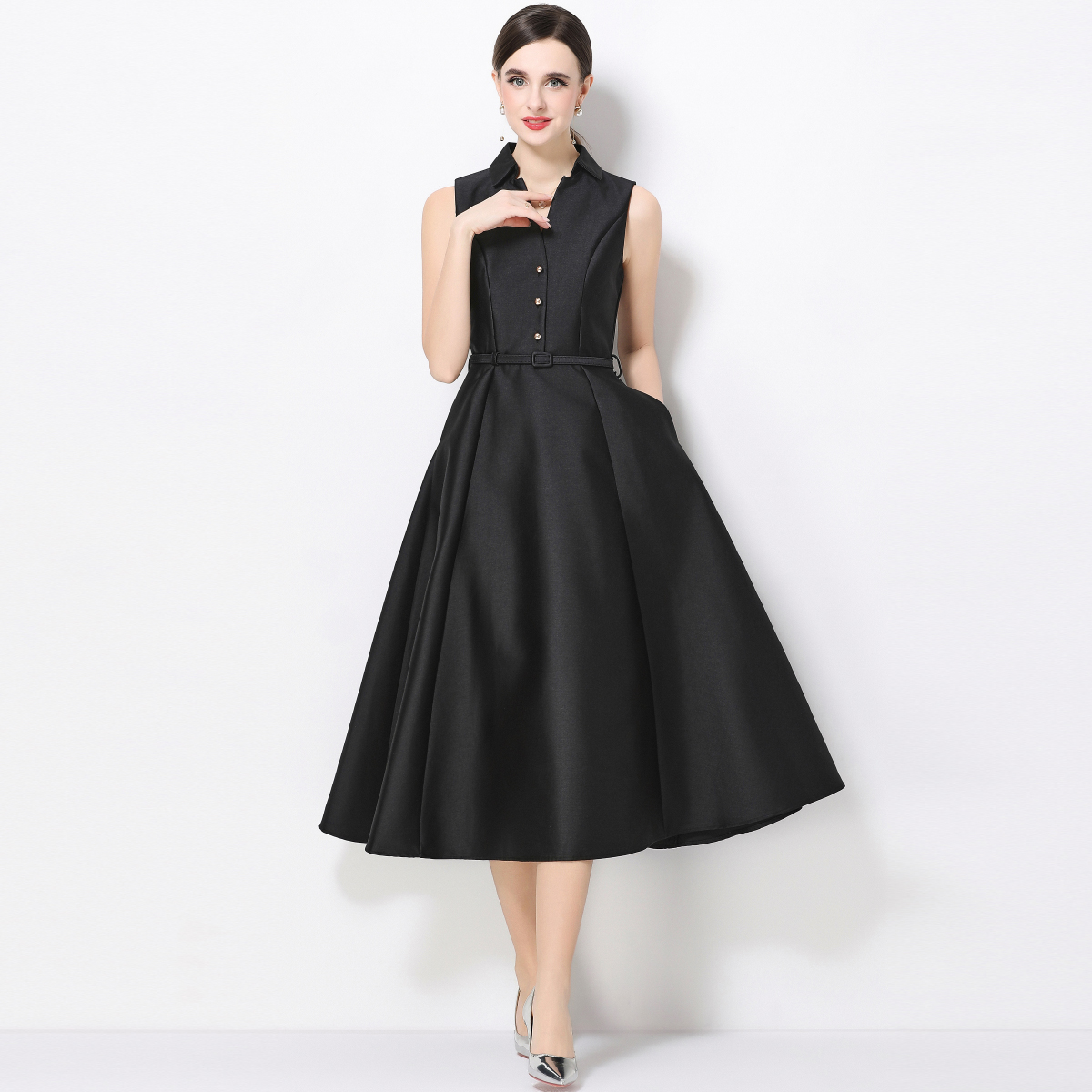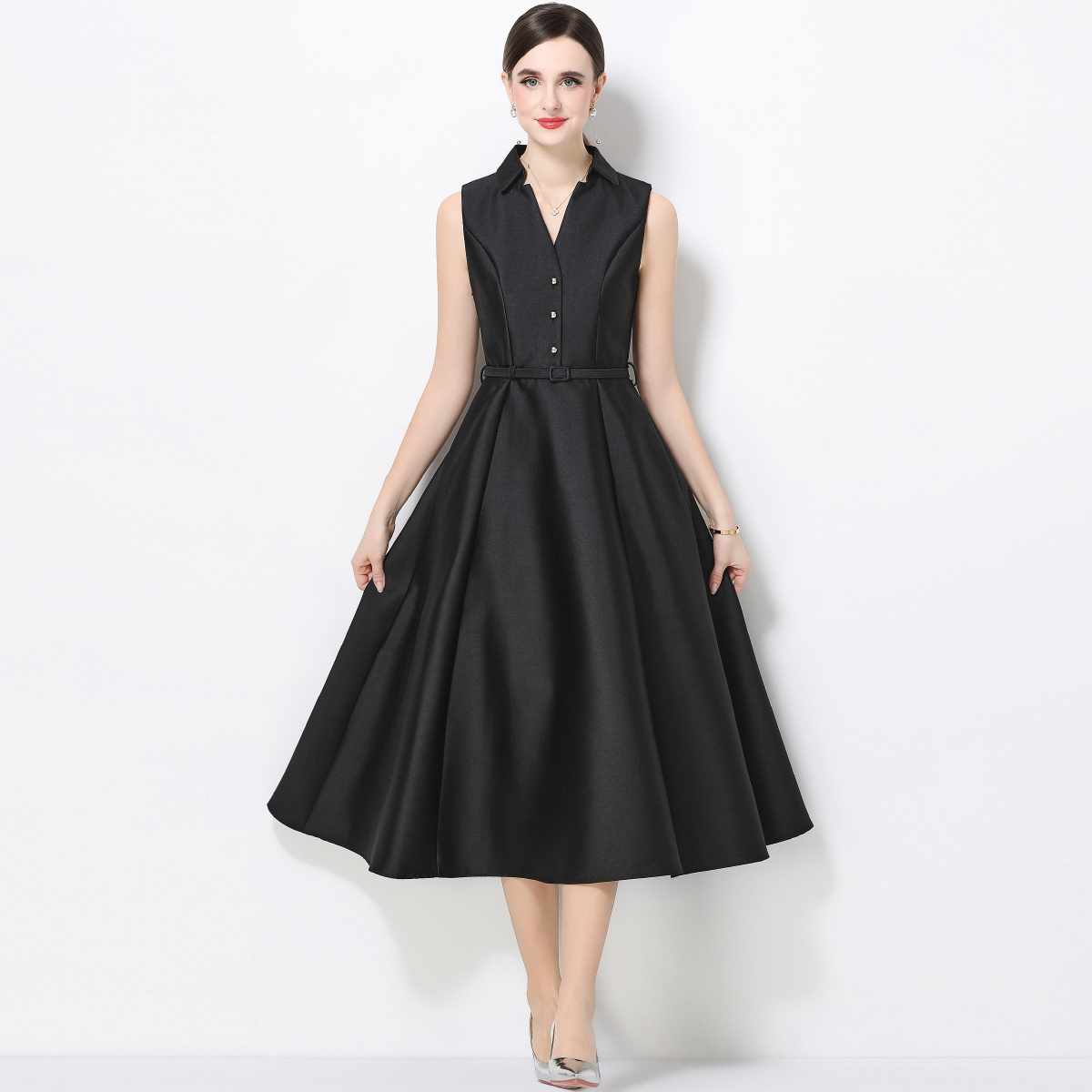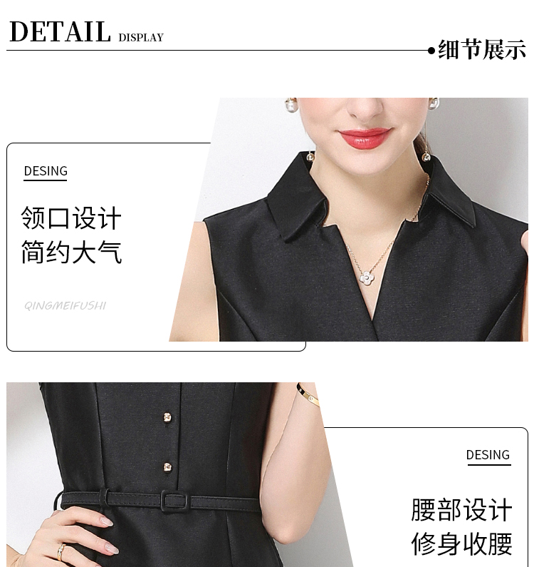 RY3208# 实拍千金风无袖翻领收腰连衣裙高腰A字裙通勤气质修身裙子配腰带
