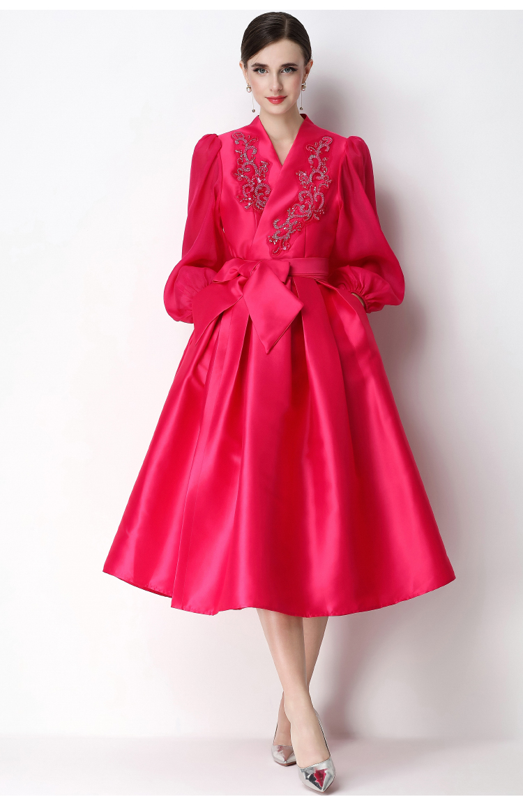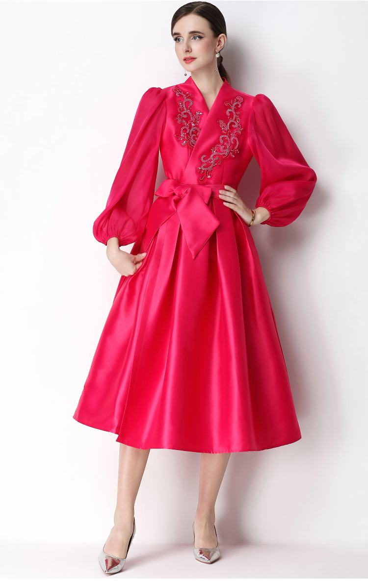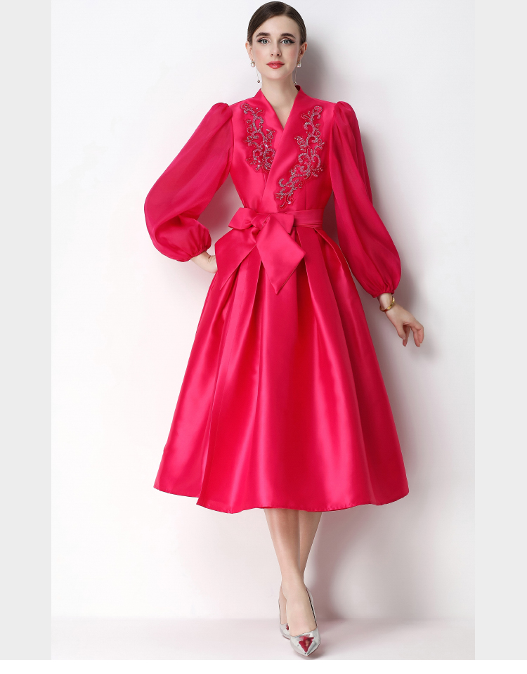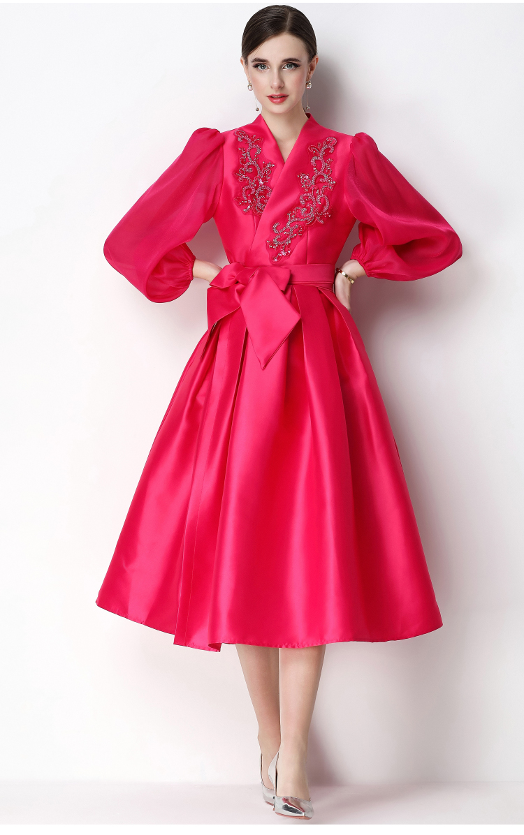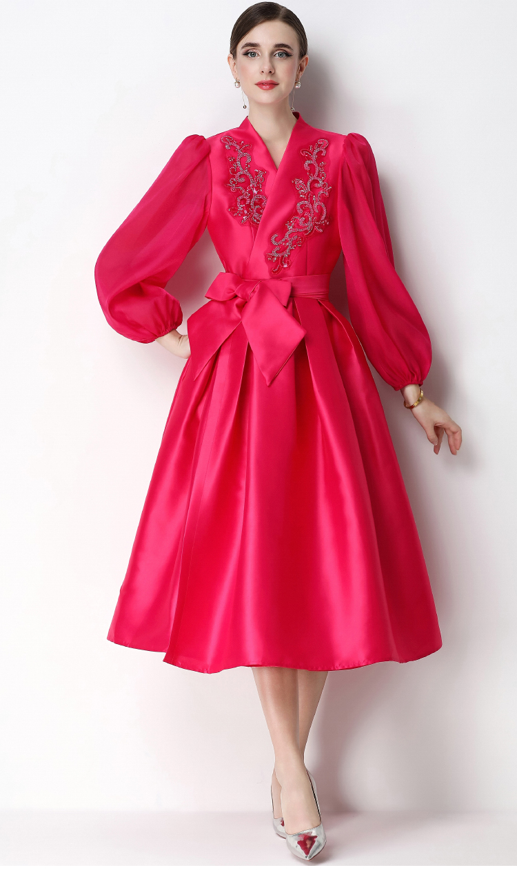 RY3211# 实拍优雅气质缎面V领连衣裙泡泡袖绑带收腰显瘦A字礼服裙配花朵