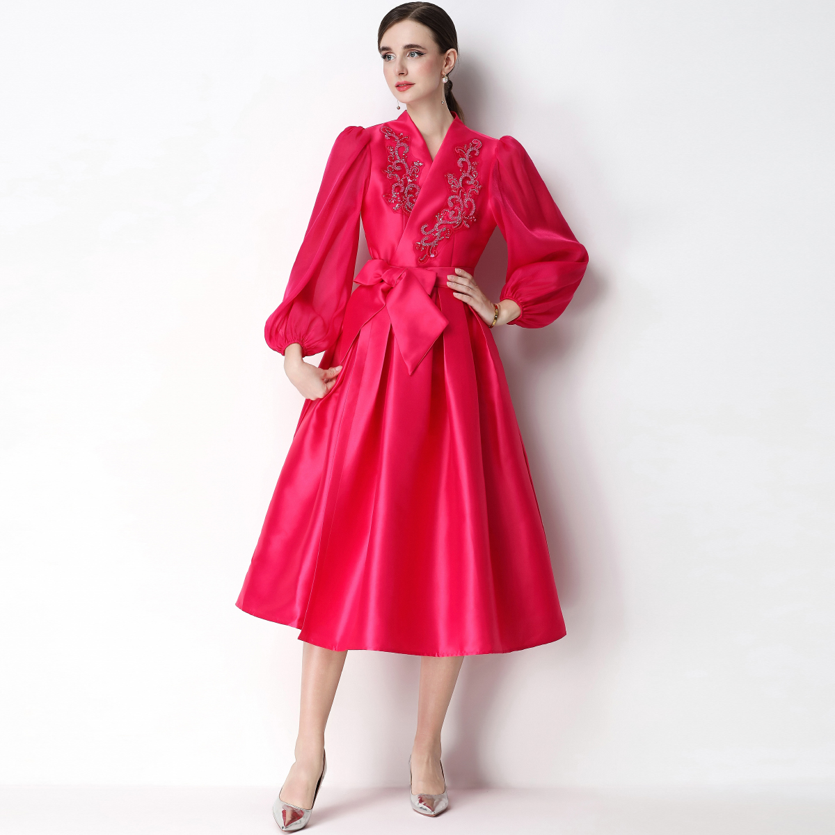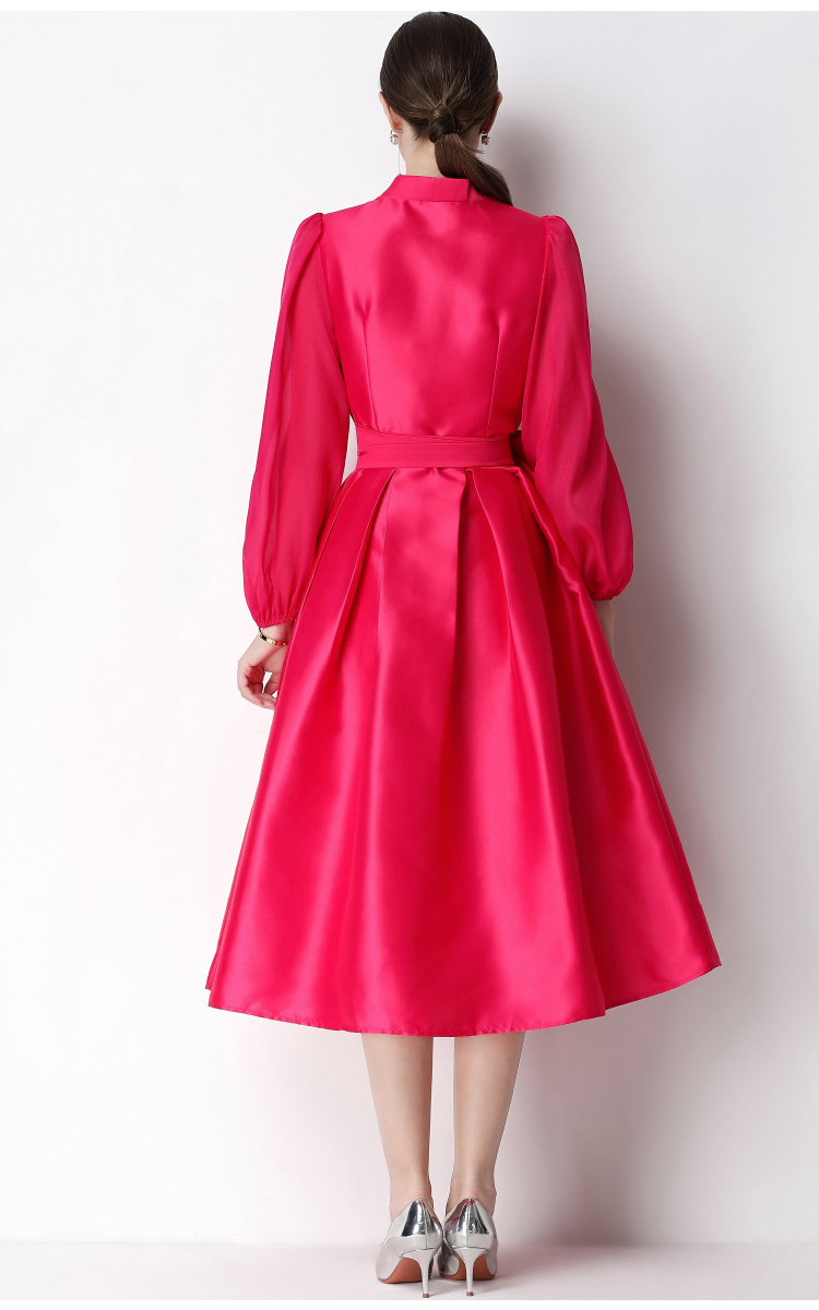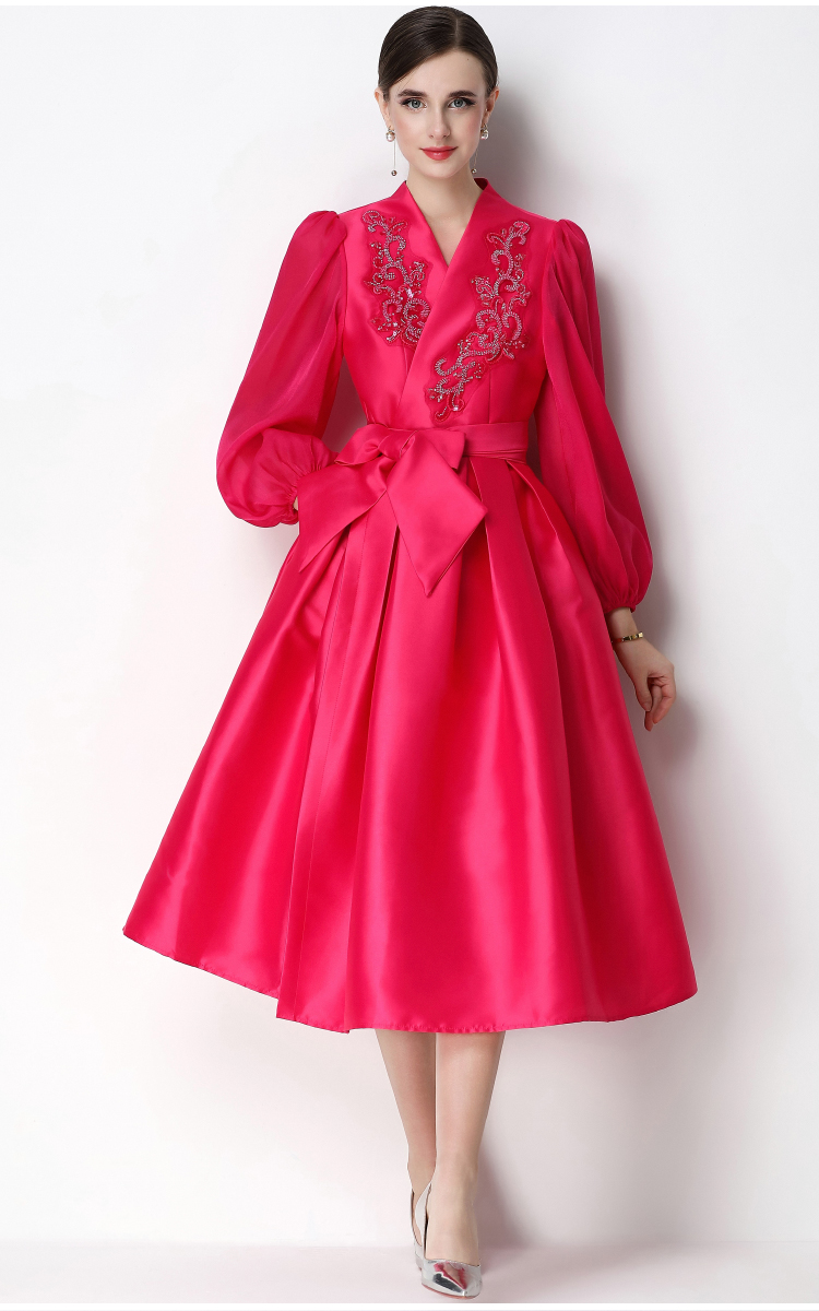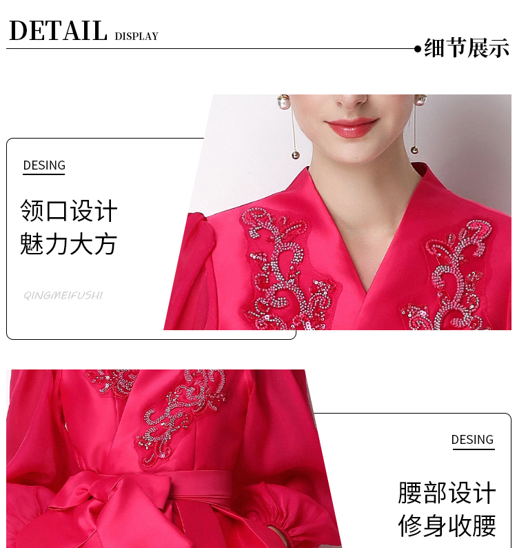 RY3211# 实拍优雅气质缎面V领连衣裙泡泡袖绑带收腰显瘦A字礼服裙配花朵