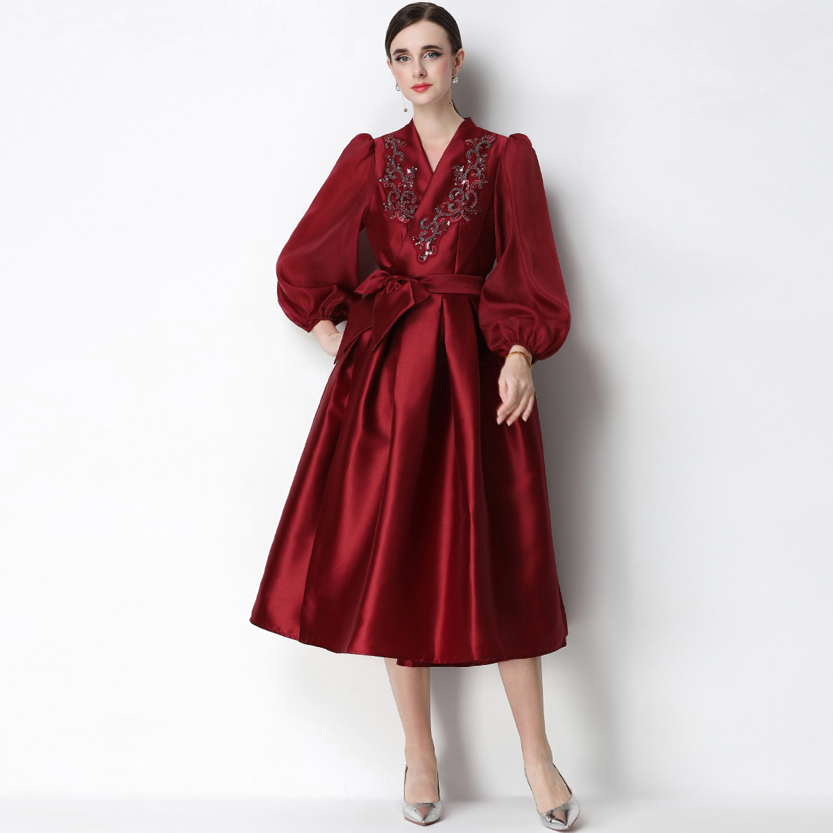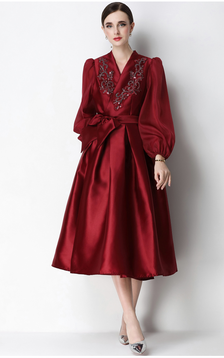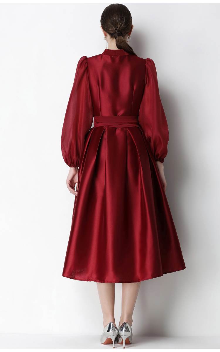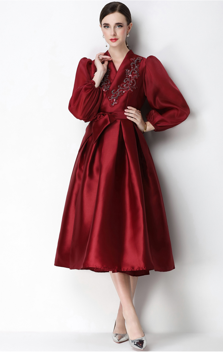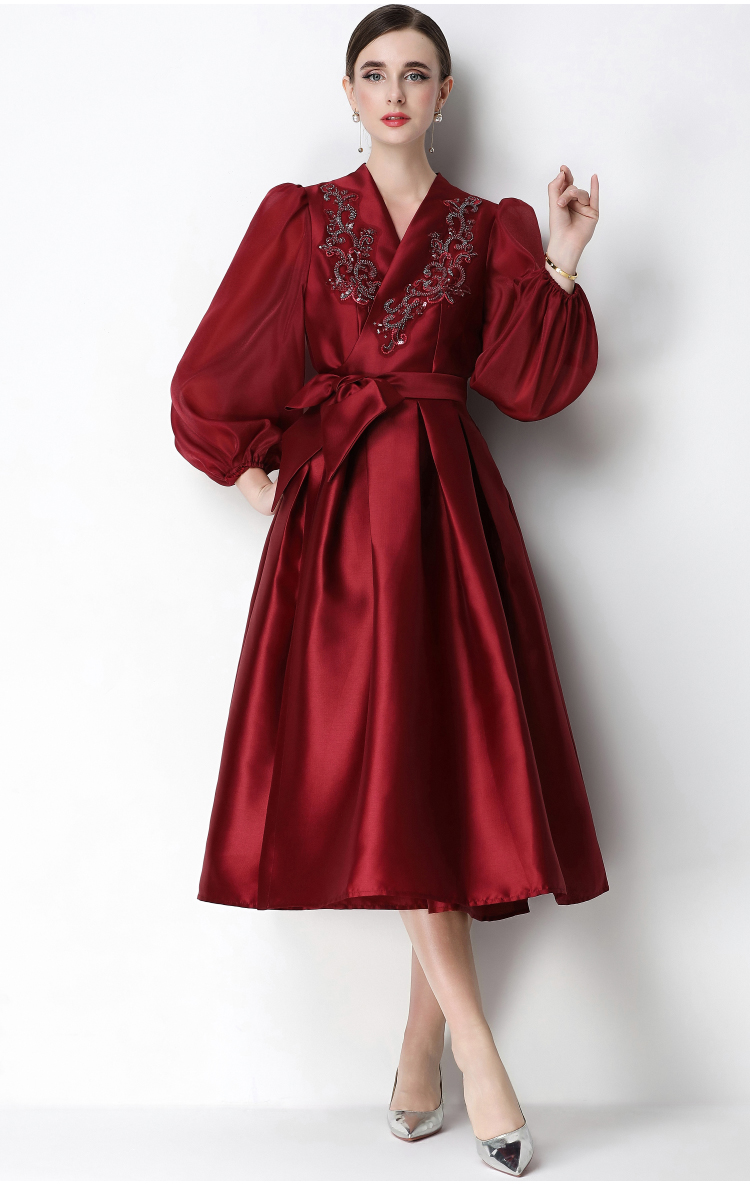 RY3212# 实拍优雅气质缎面V领连衣裙泡泡袖绑带收腰显瘦A字礼服裙配花朵