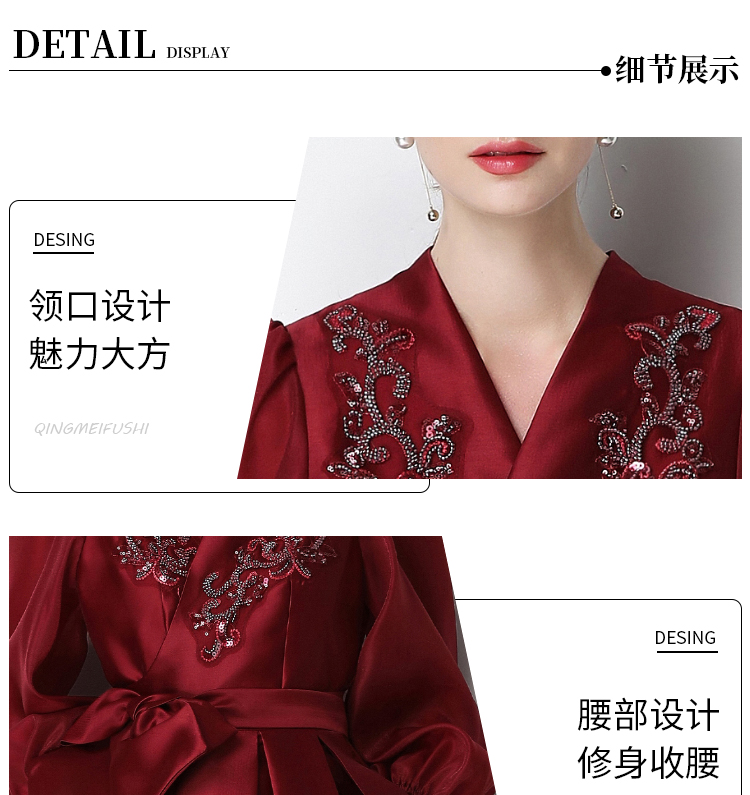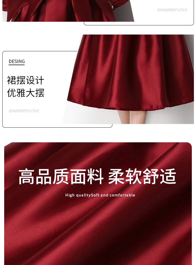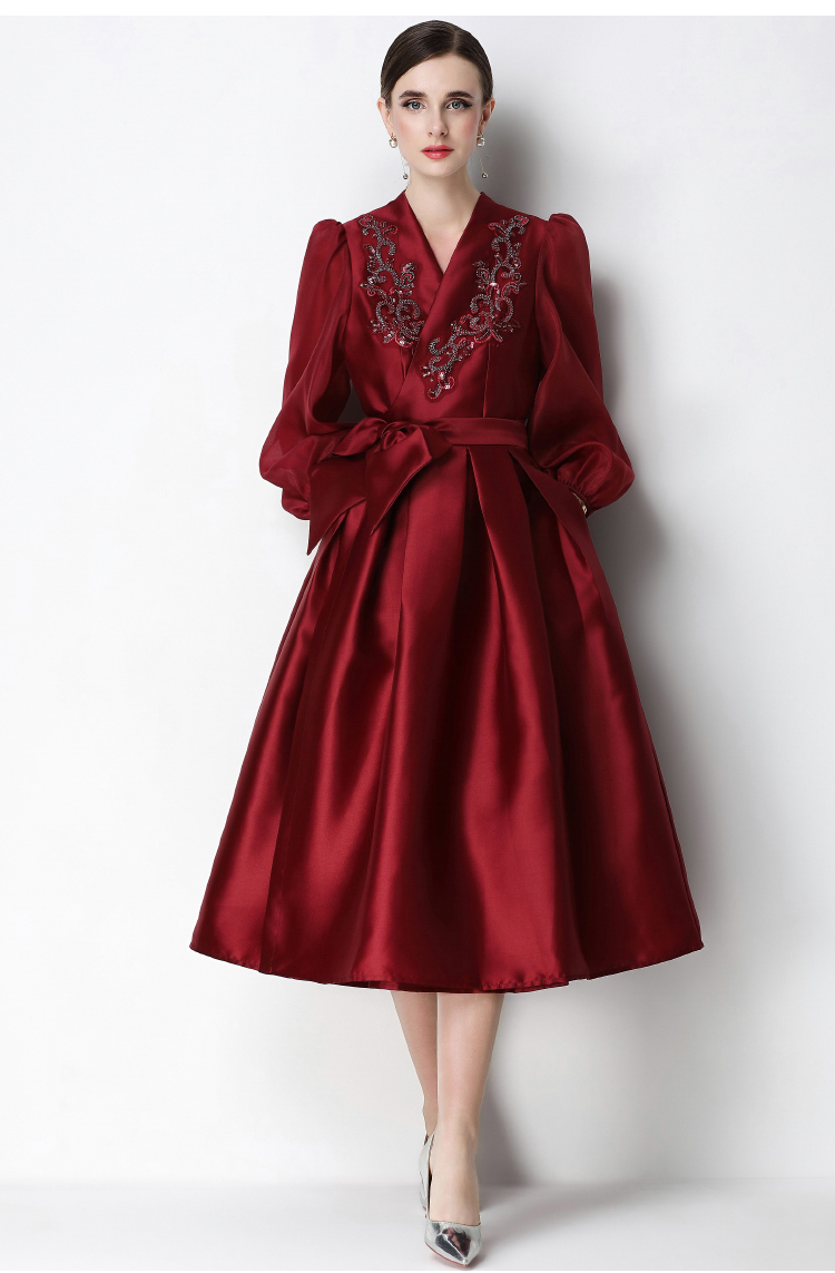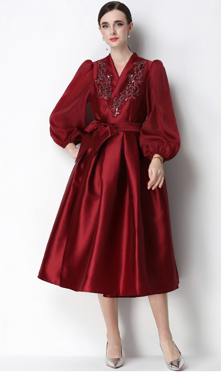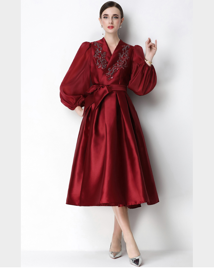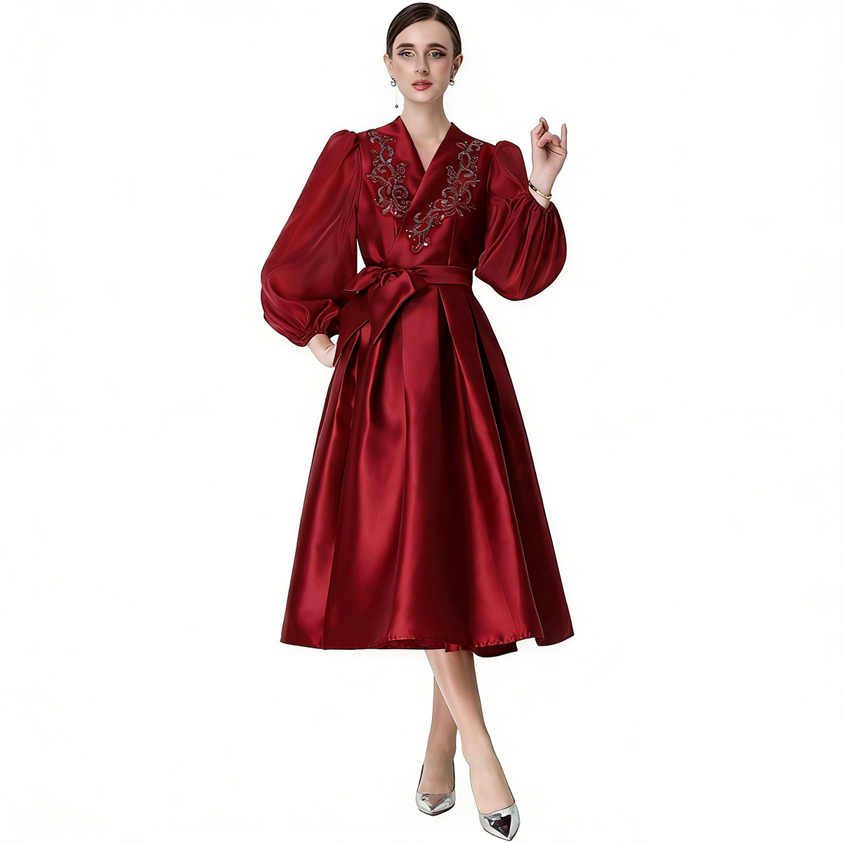 RY3212# 实拍优雅气质缎面V领连衣裙泡泡袖绑带收腰显瘦A字礼服裙配花朵