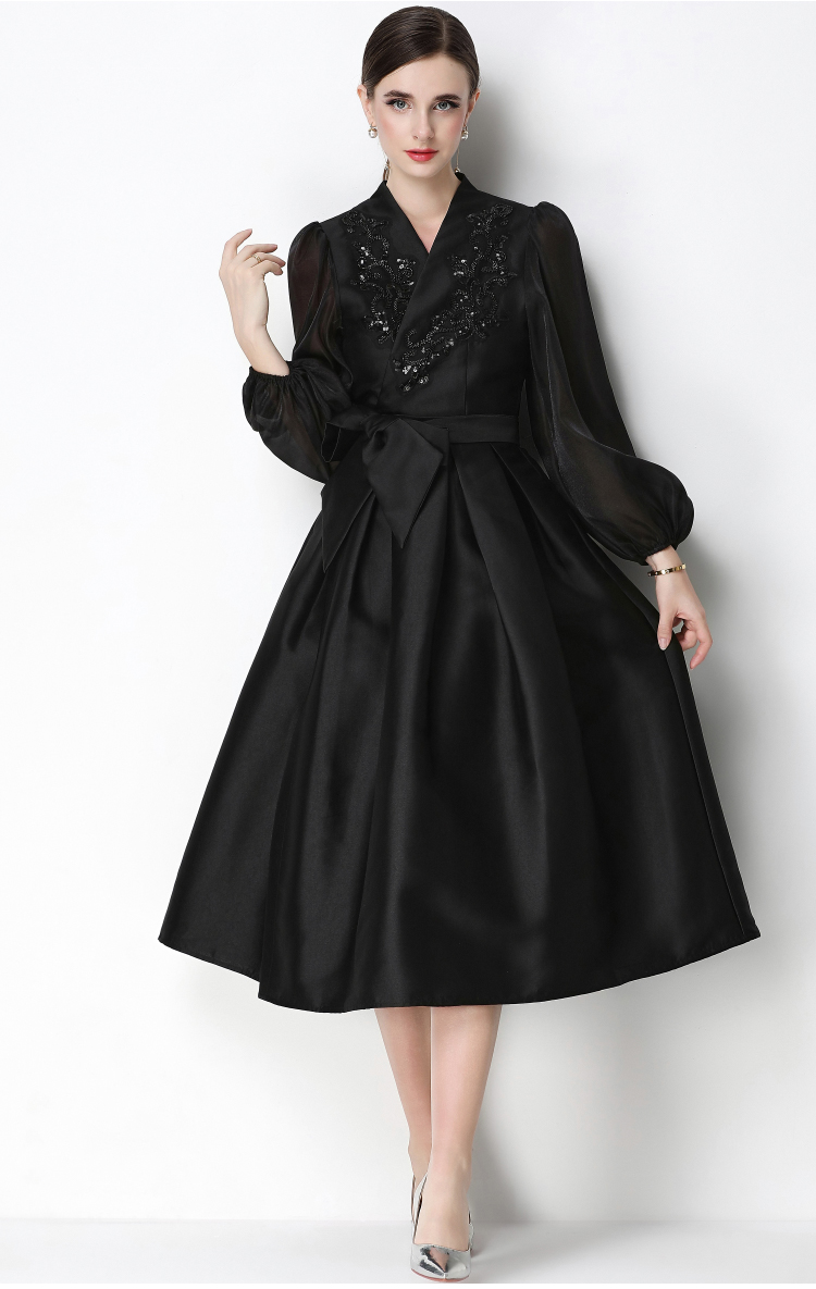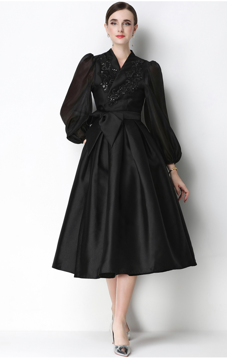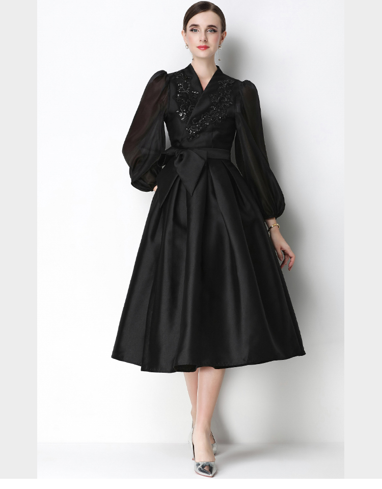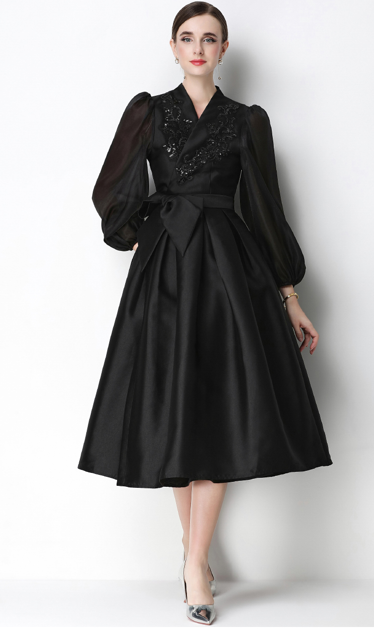 RY3213# 实拍优雅气质缎面V领连衣裙泡泡袖绑带收腰显瘦A字礼服裙配花朵