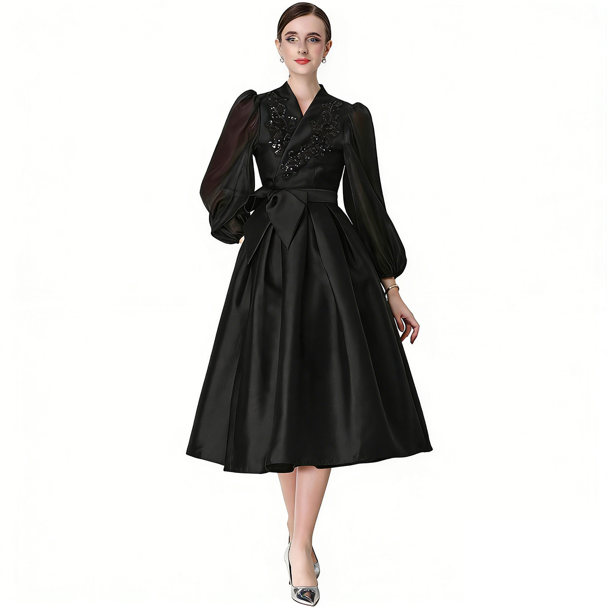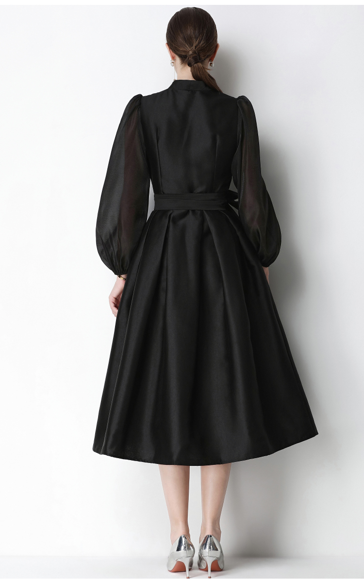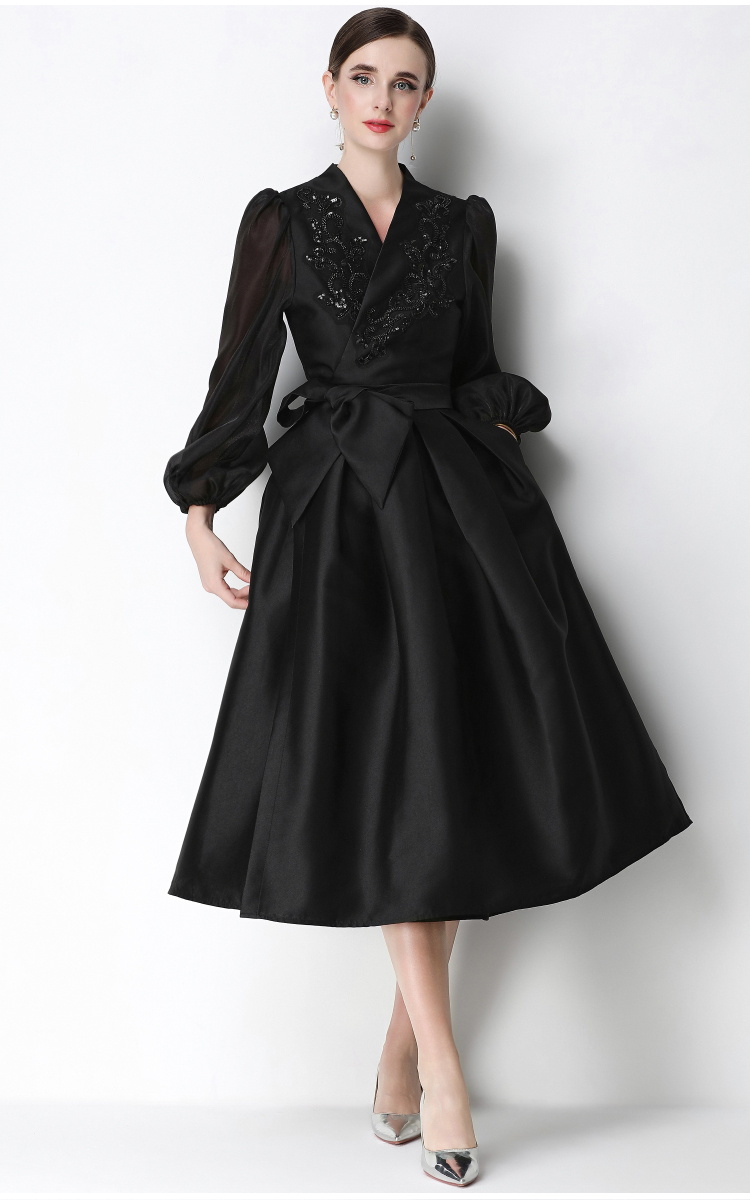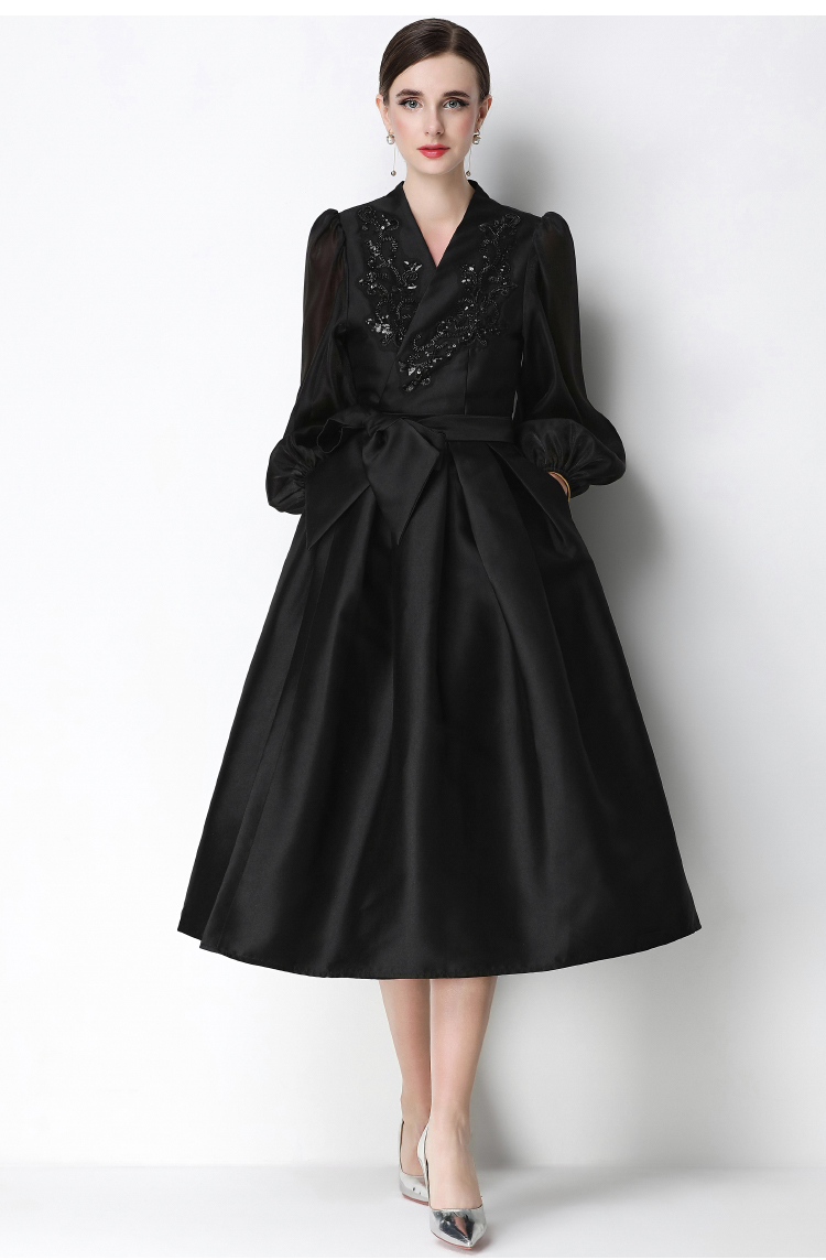 RY3213# 实拍优雅气质缎面V领连衣裙泡泡袖绑带收腰显瘦A字礼服裙配花朵