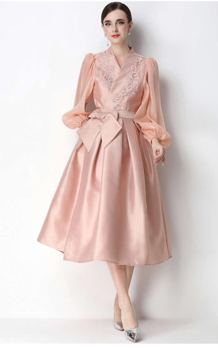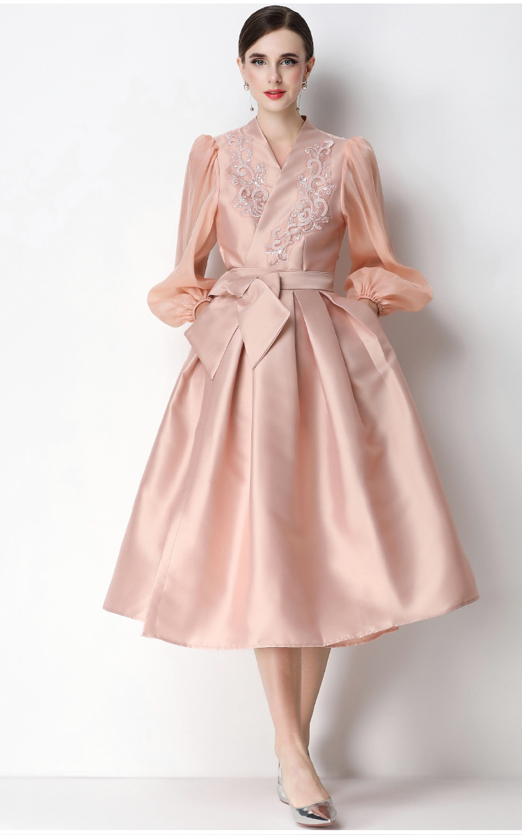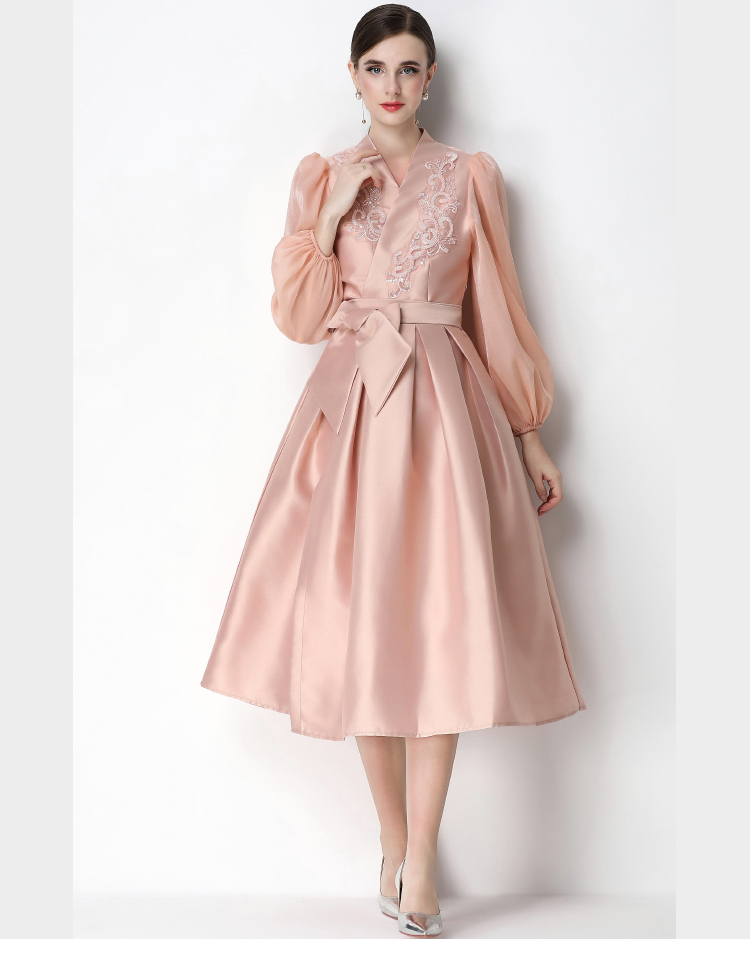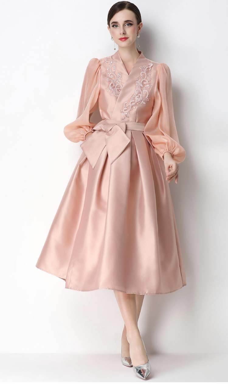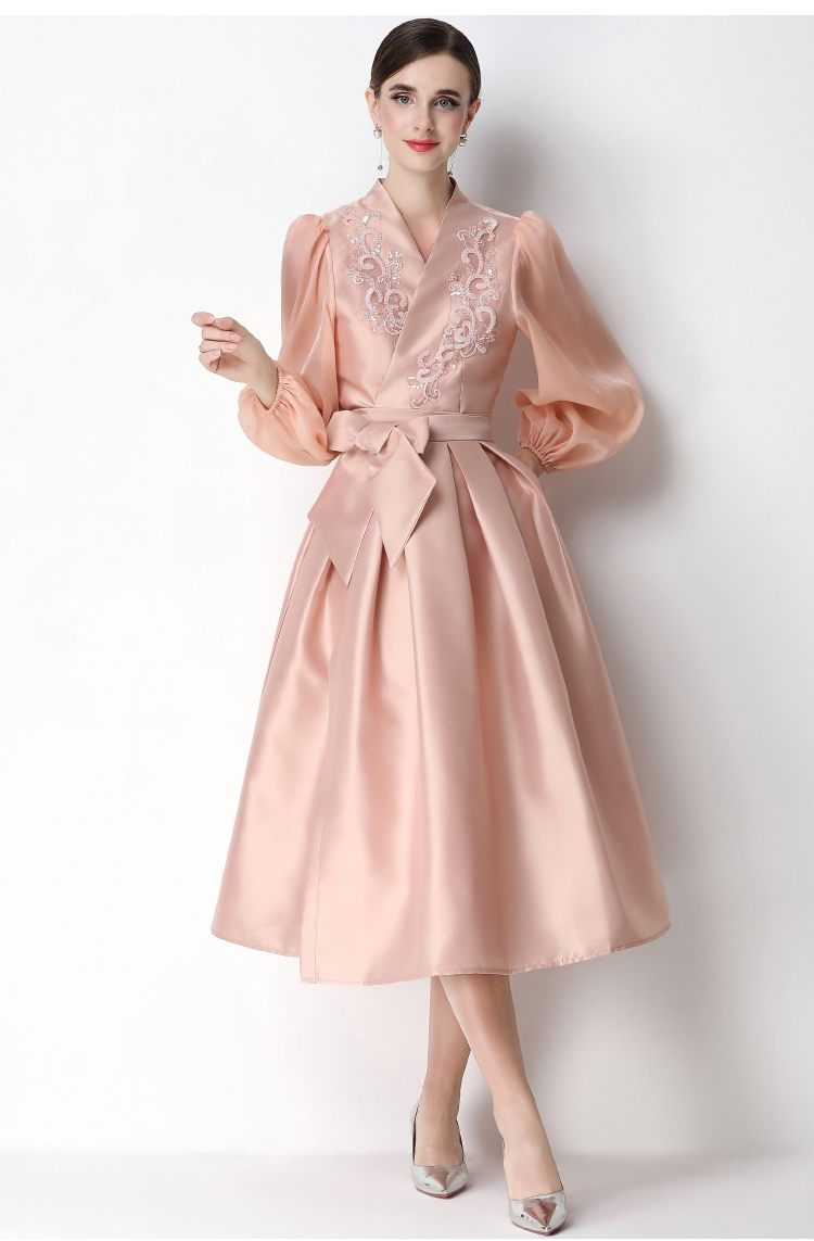 RY3214# 实拍优雅气质缎面V领连衣裙泡泡袖绑带收腰显瘦A字礼服裙配花朵