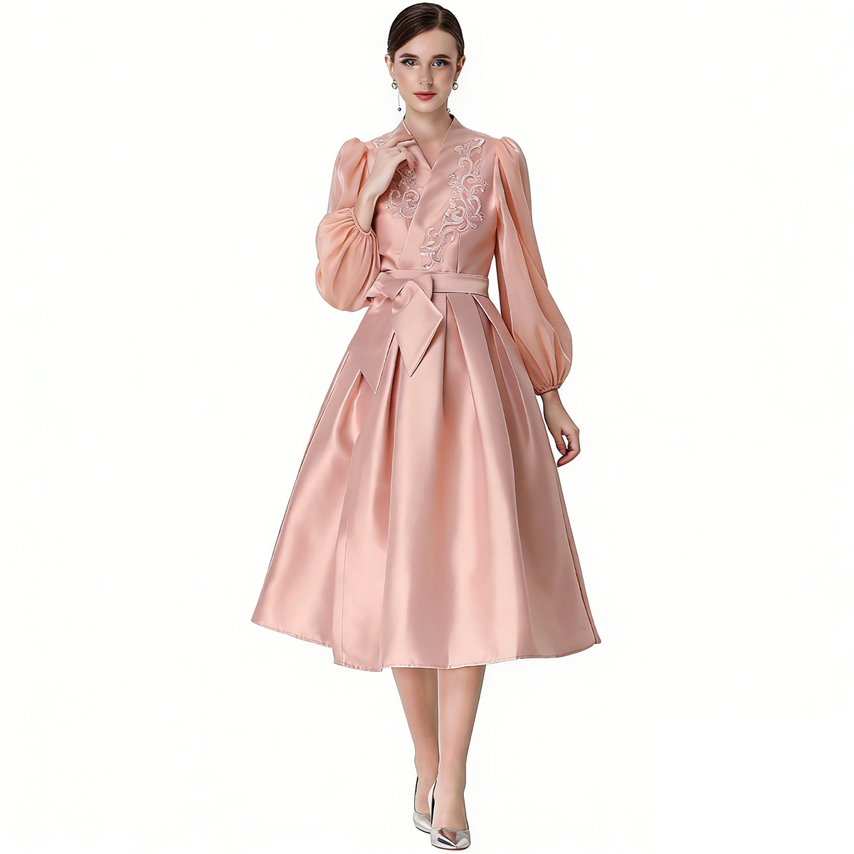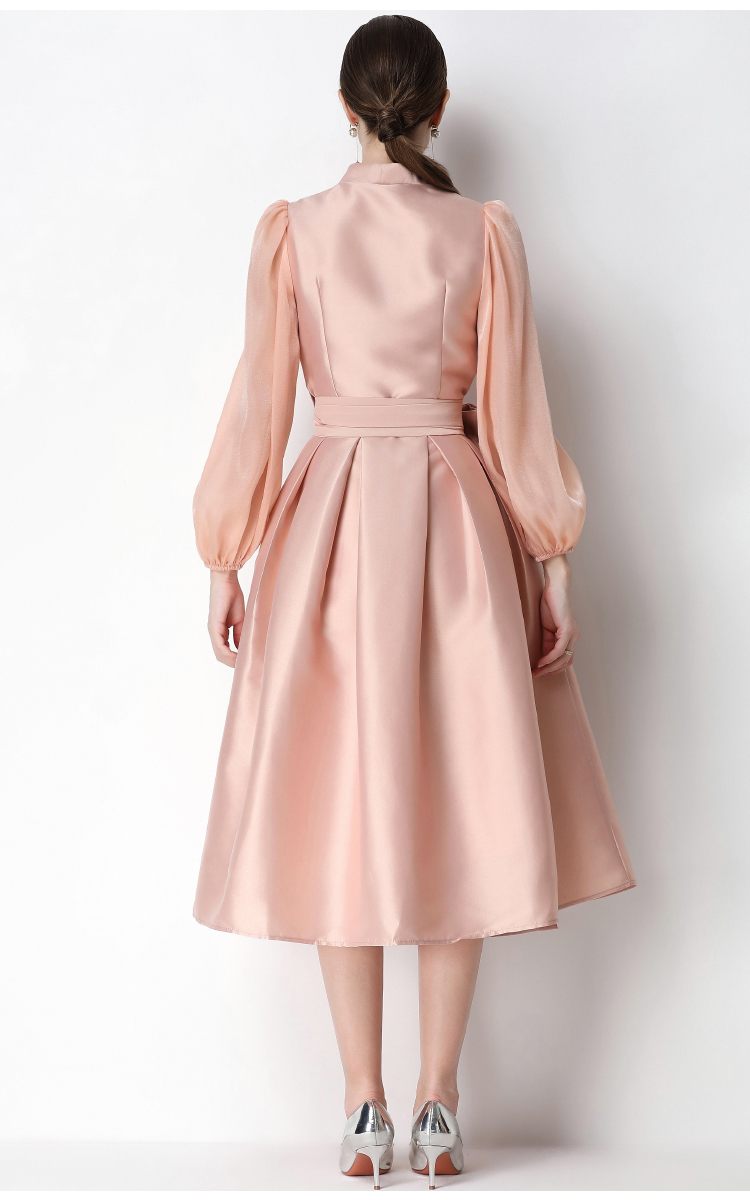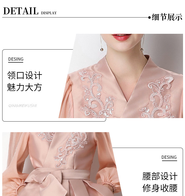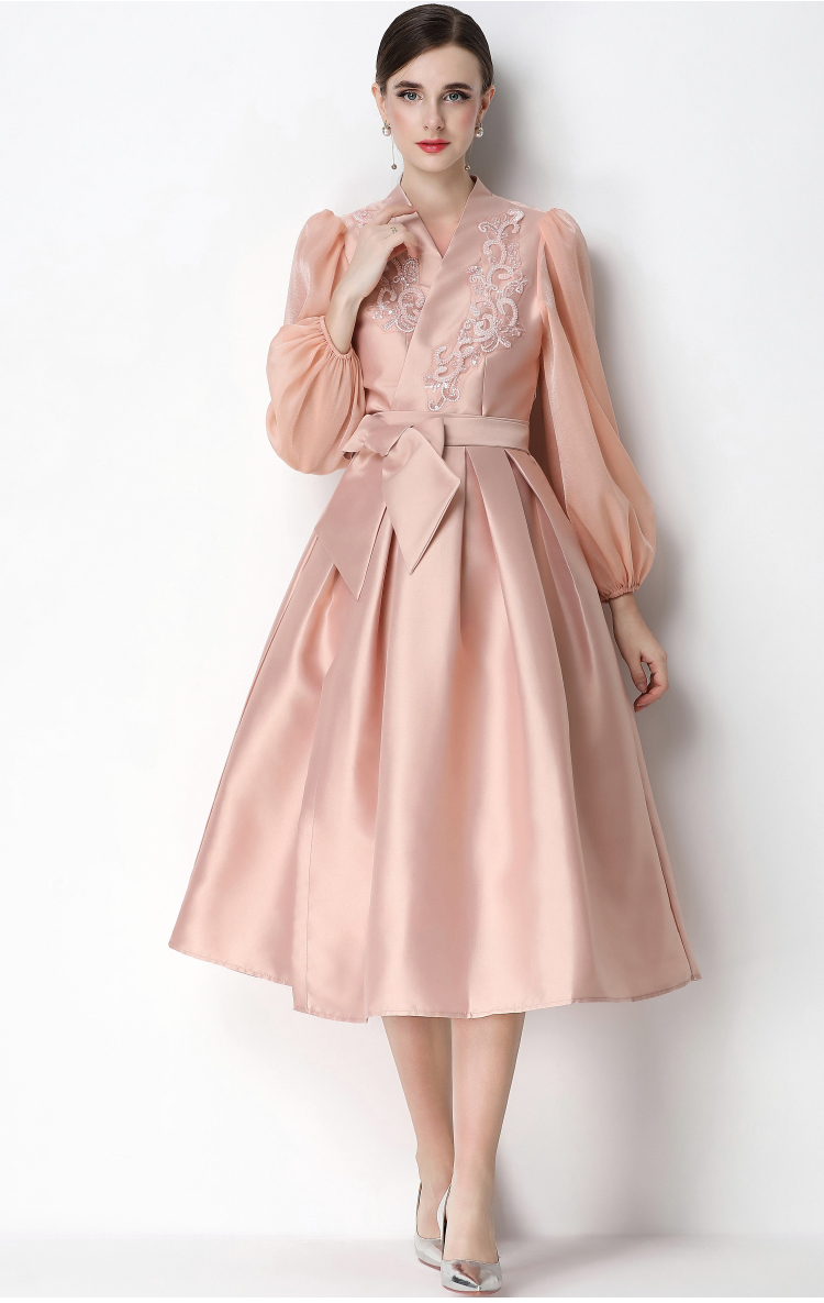 RY3214# 实拍优雅气质缎面V领连衣裙泡泡袖绑带收腰显瘦A字礼服裙配花朵