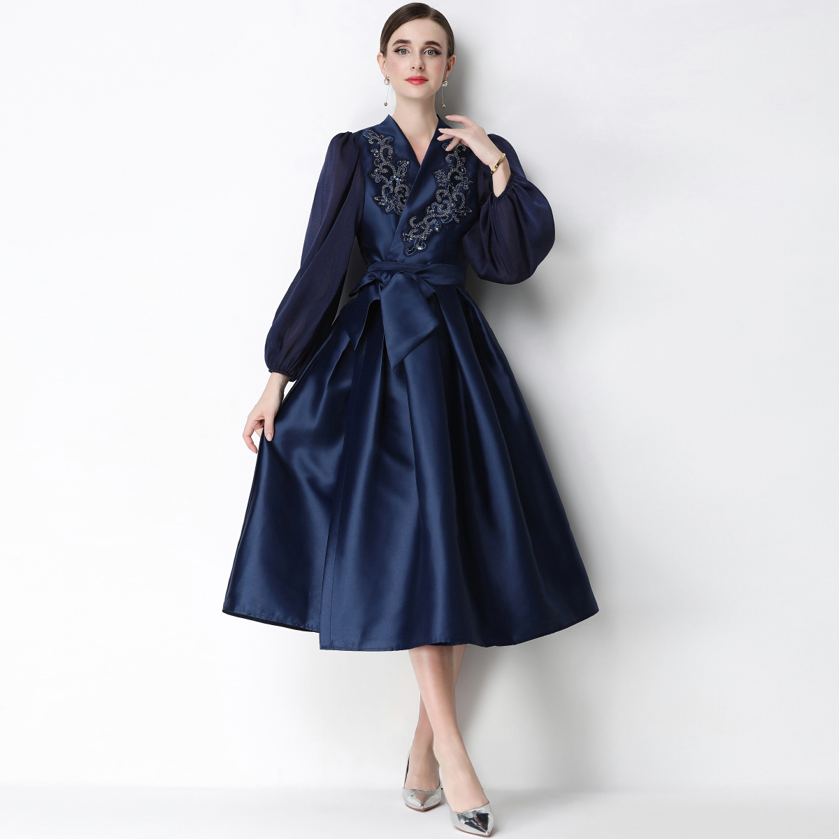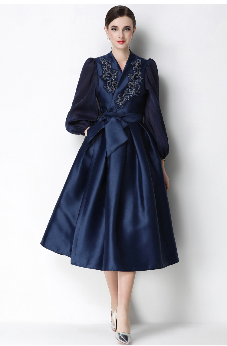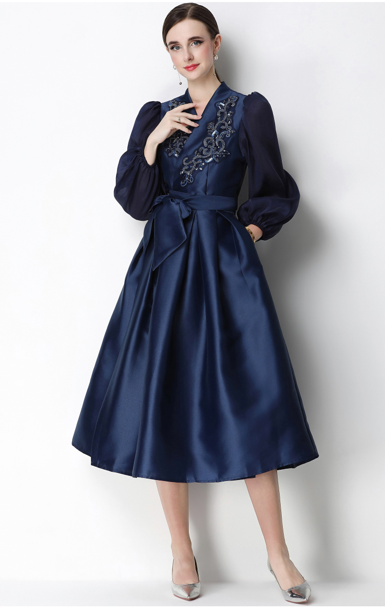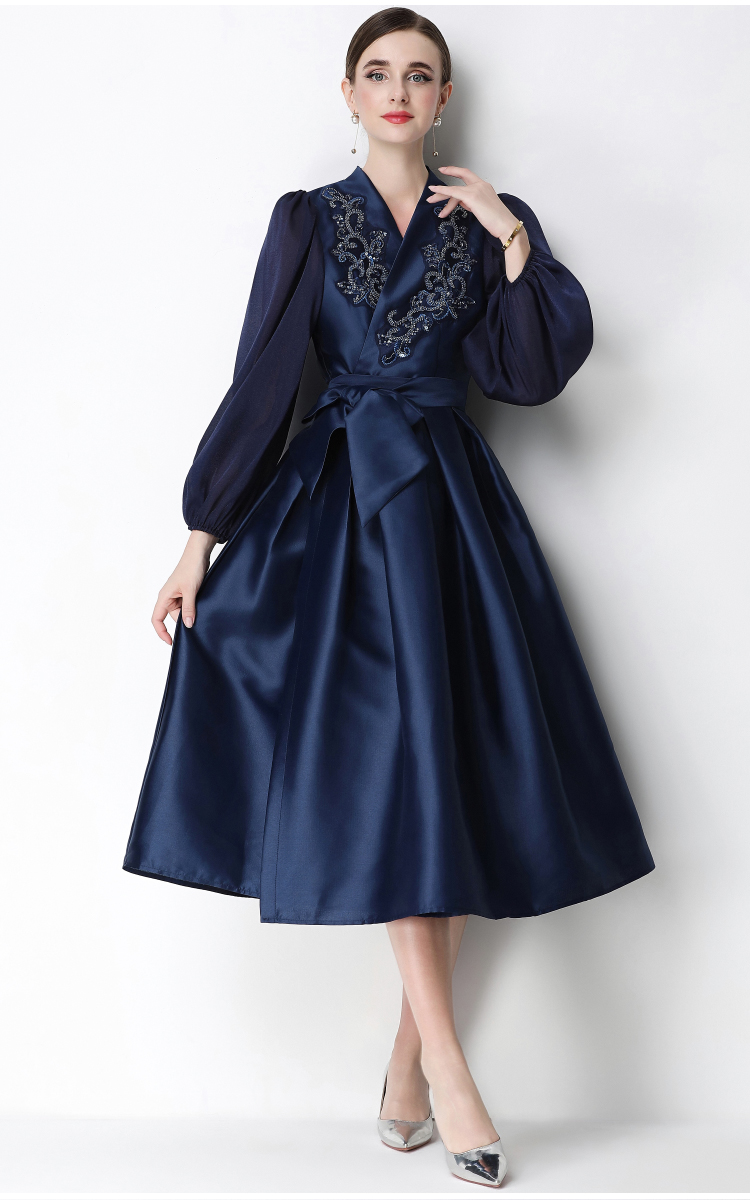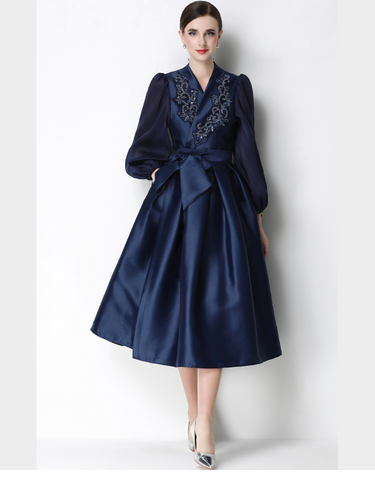RY3215# 实拍优雅气质缎面V领连衣裙泡泡袖绑带收腰显瘦A字礼服裙配花朵