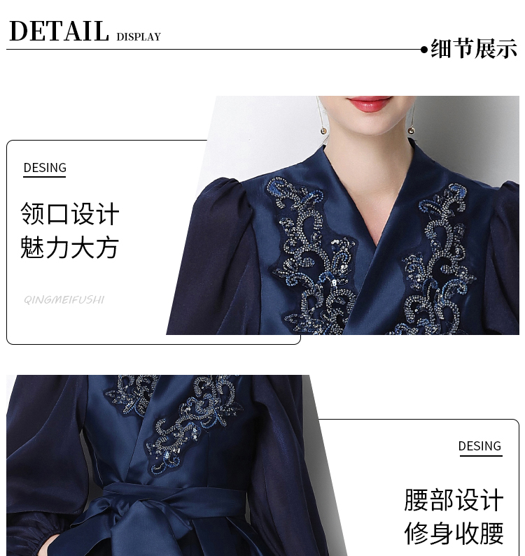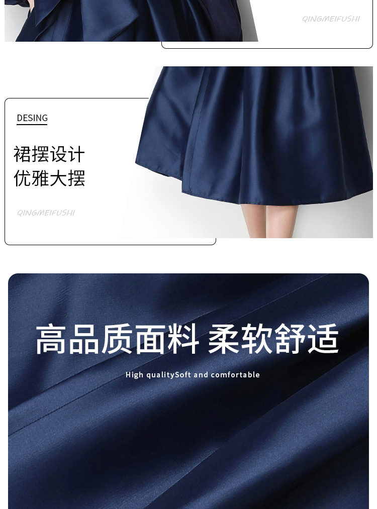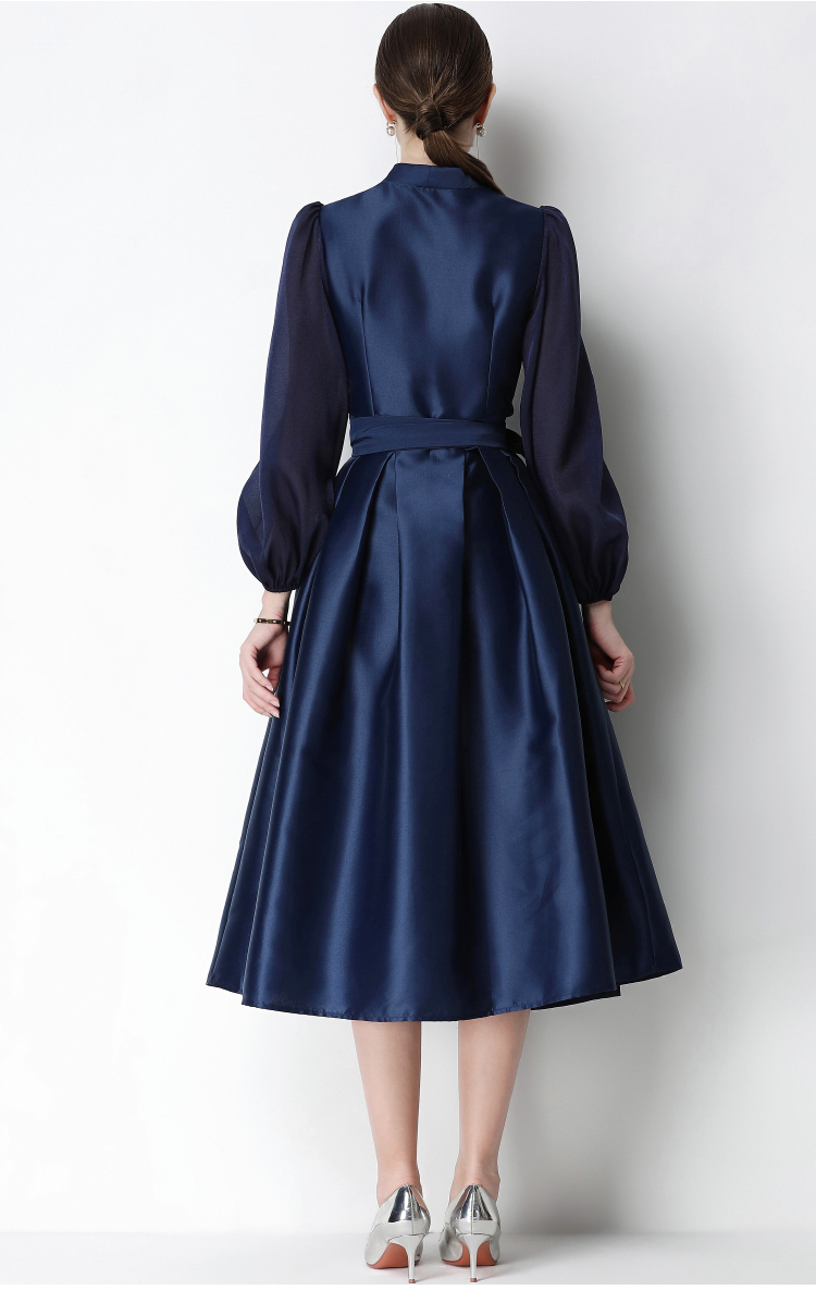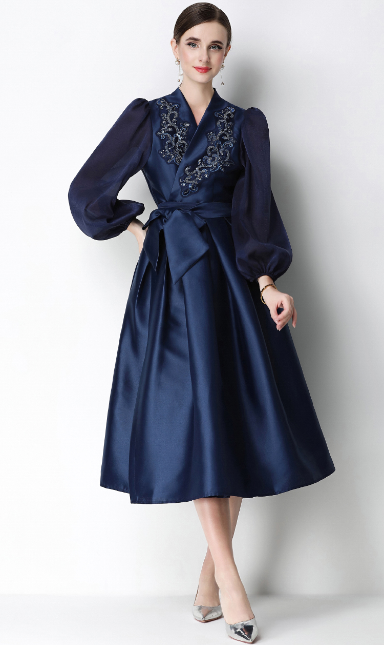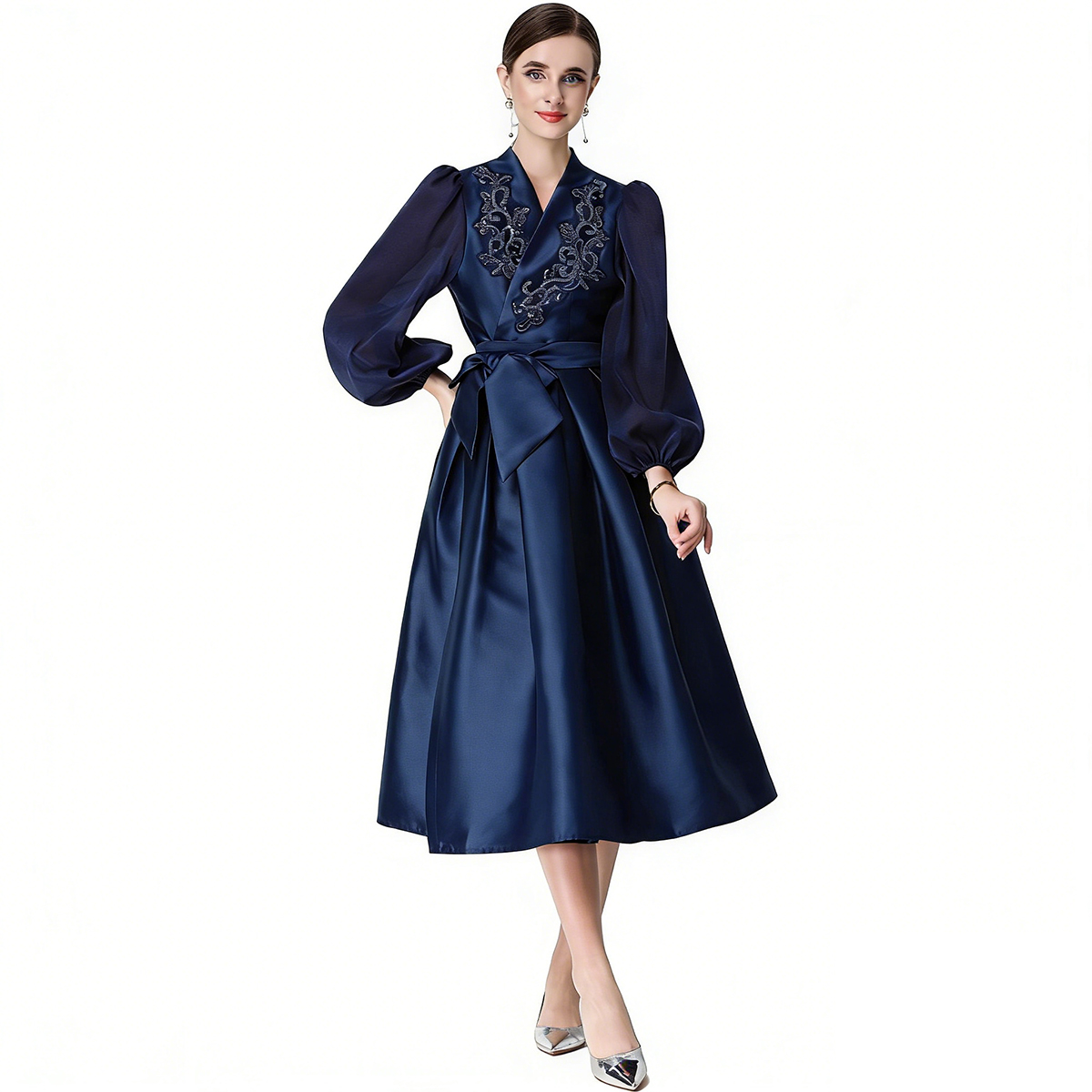 RY3215# 实拍优雅气质缎面V领连衣裙泡泡袖绑带收腰显瘦A字礼服裙配花朵