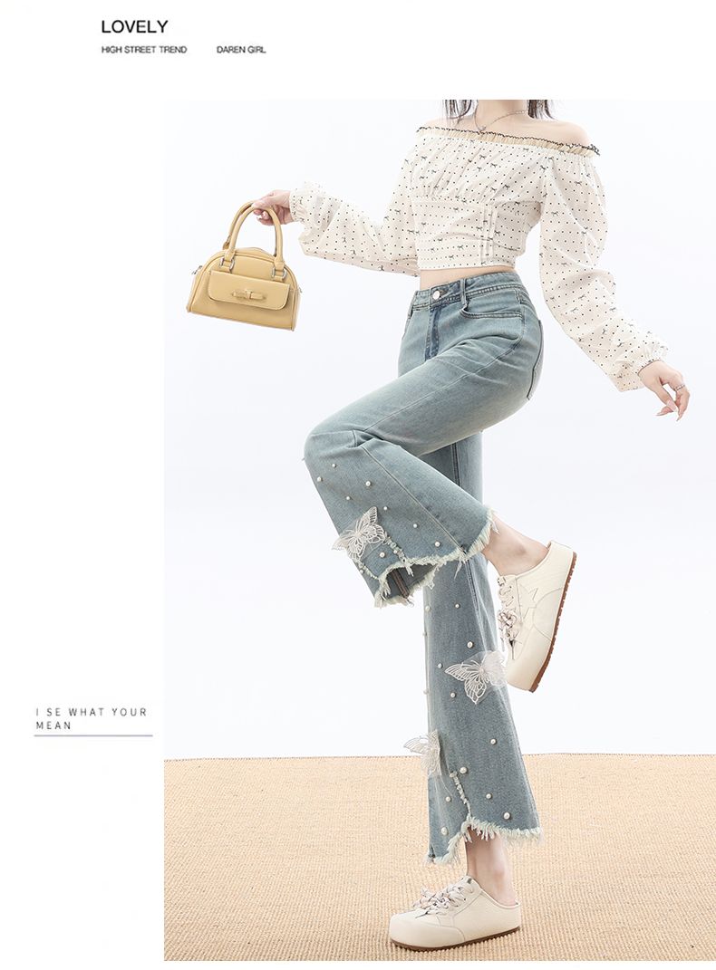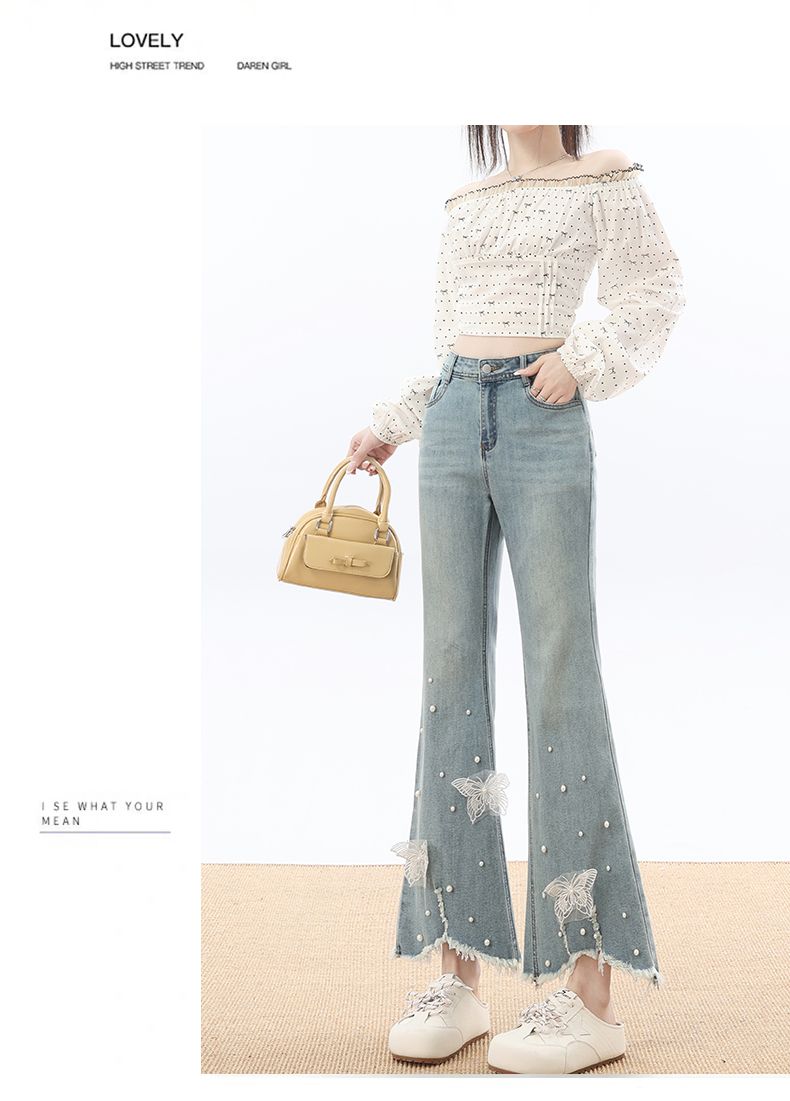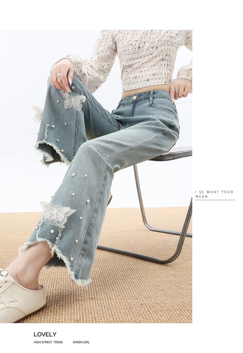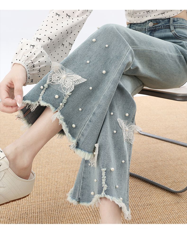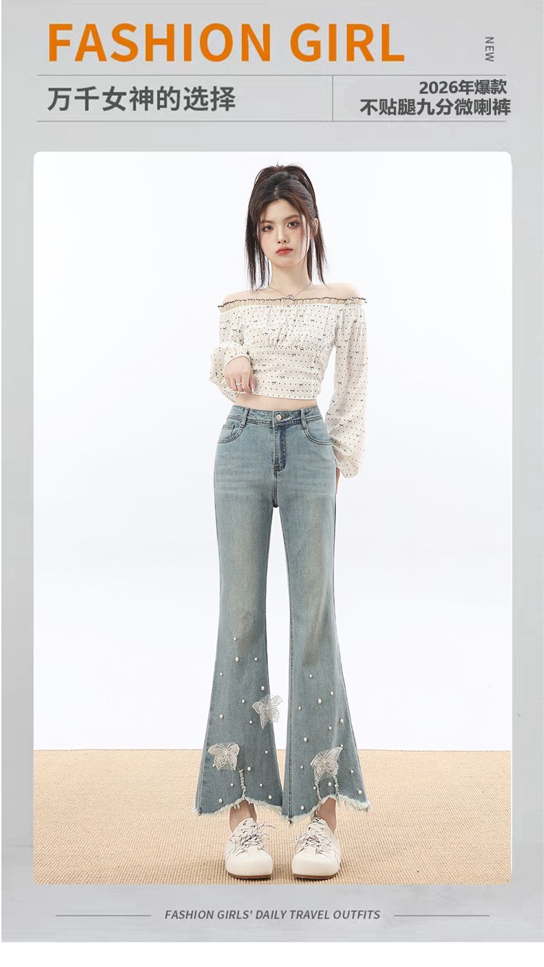RY3274# 2026实拍春设计感钉珠蝴蝶微喇牛仔裤女八分九分毛边开叉喇叭裤