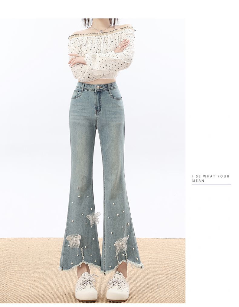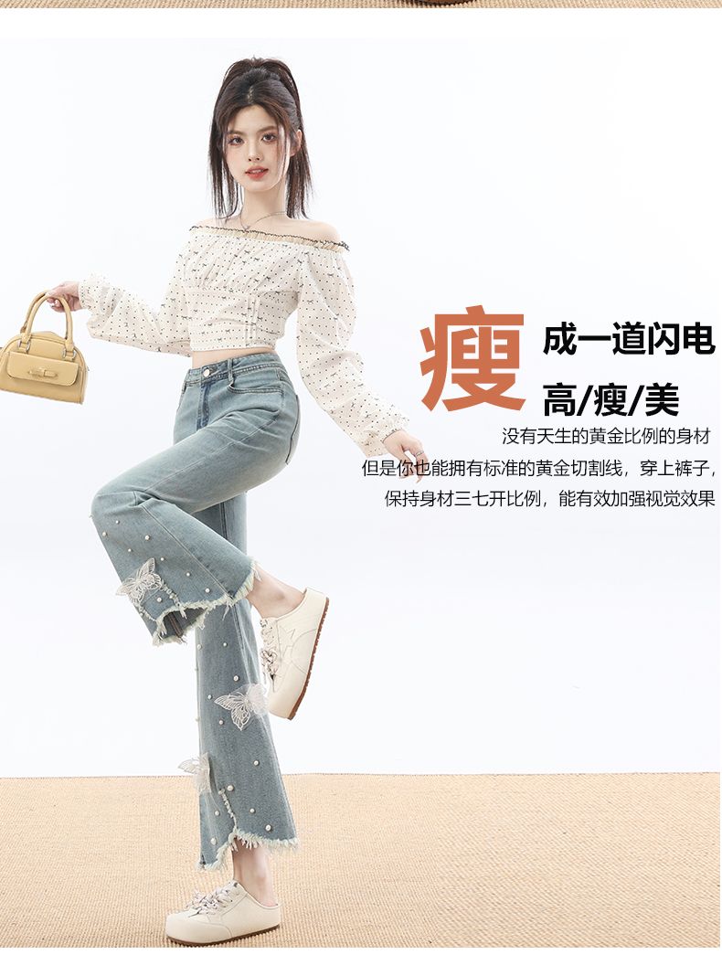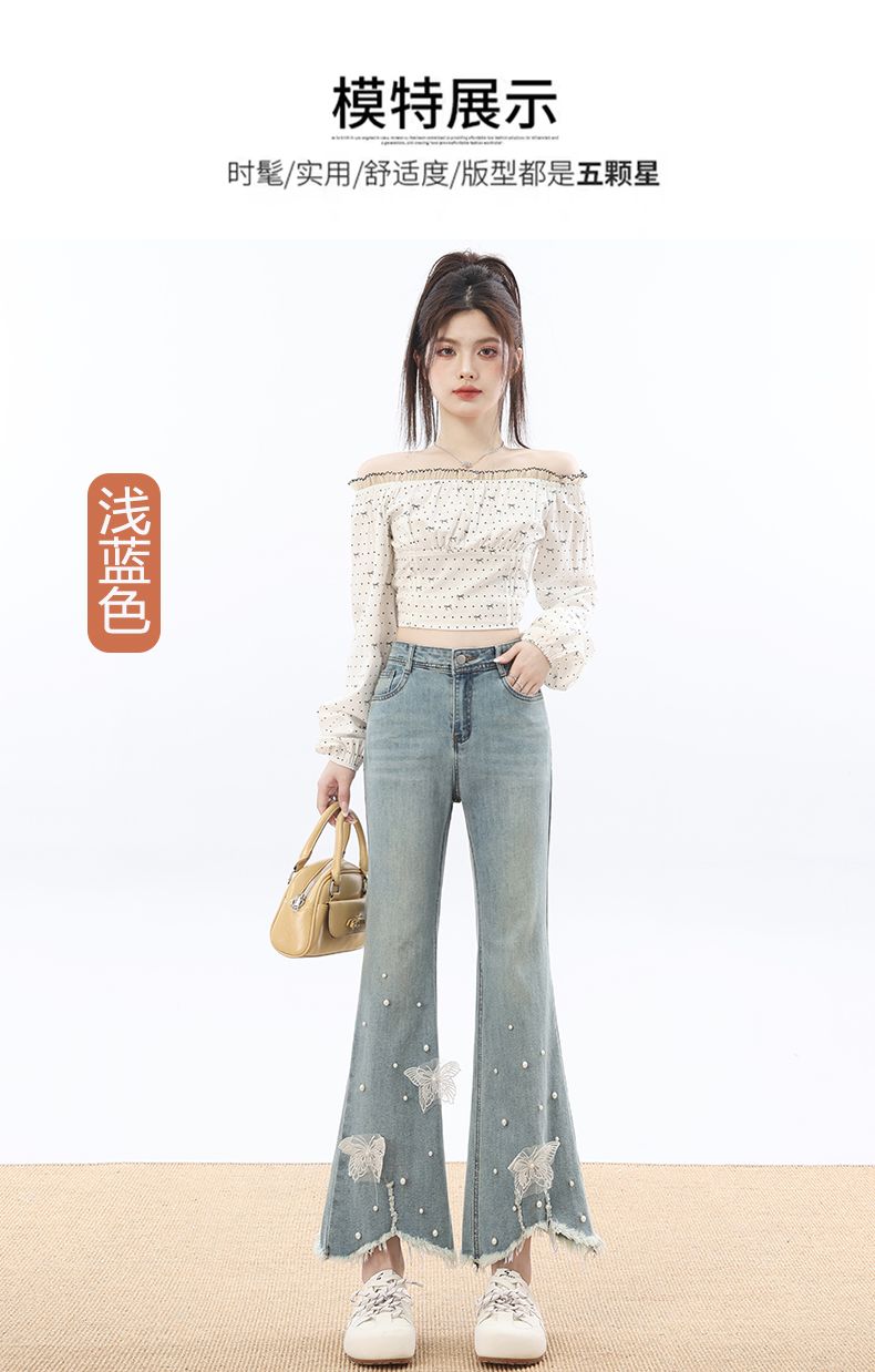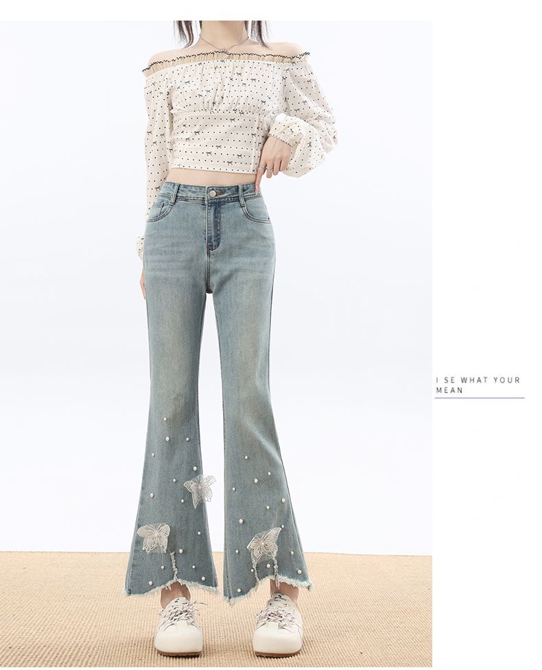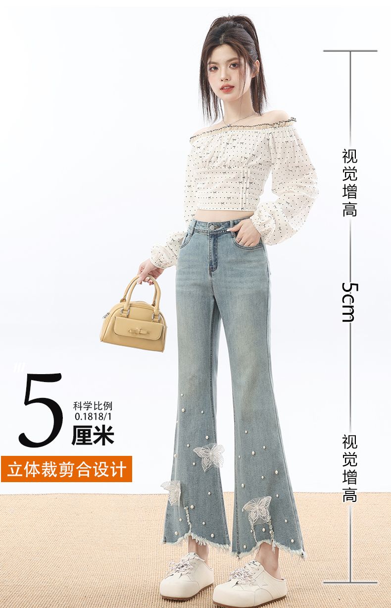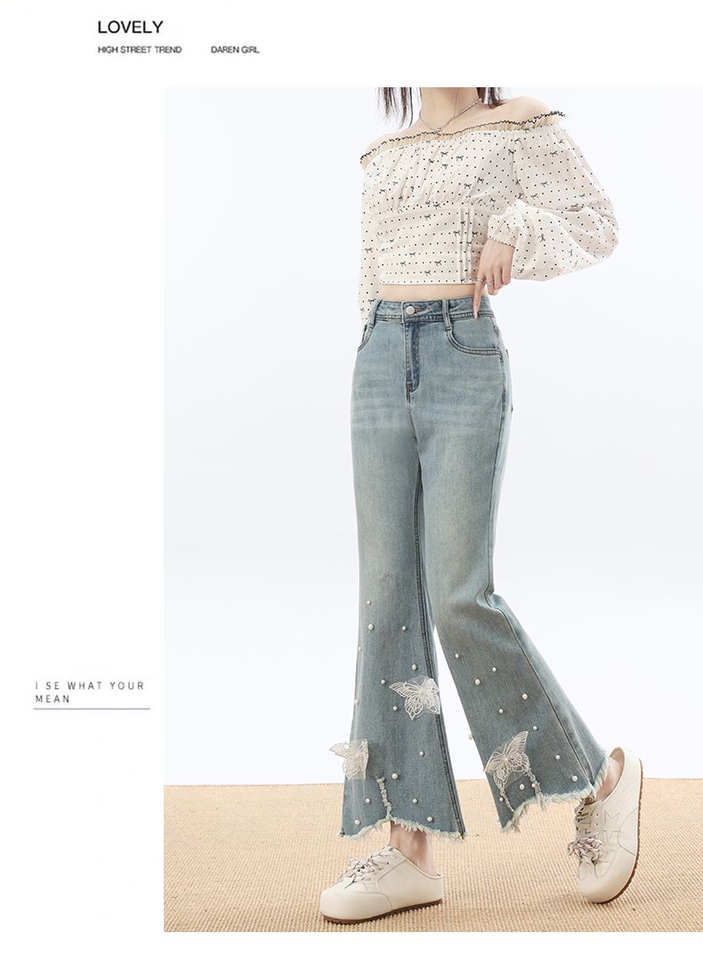 RY3274# 2026实拍春设计感钉珠蝴蝶微喇牛仔裤女八分九分毛边开叉喇叭裤
