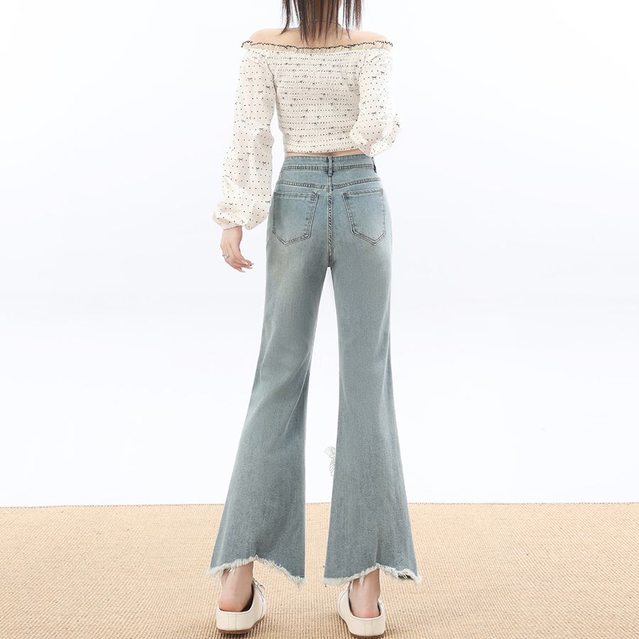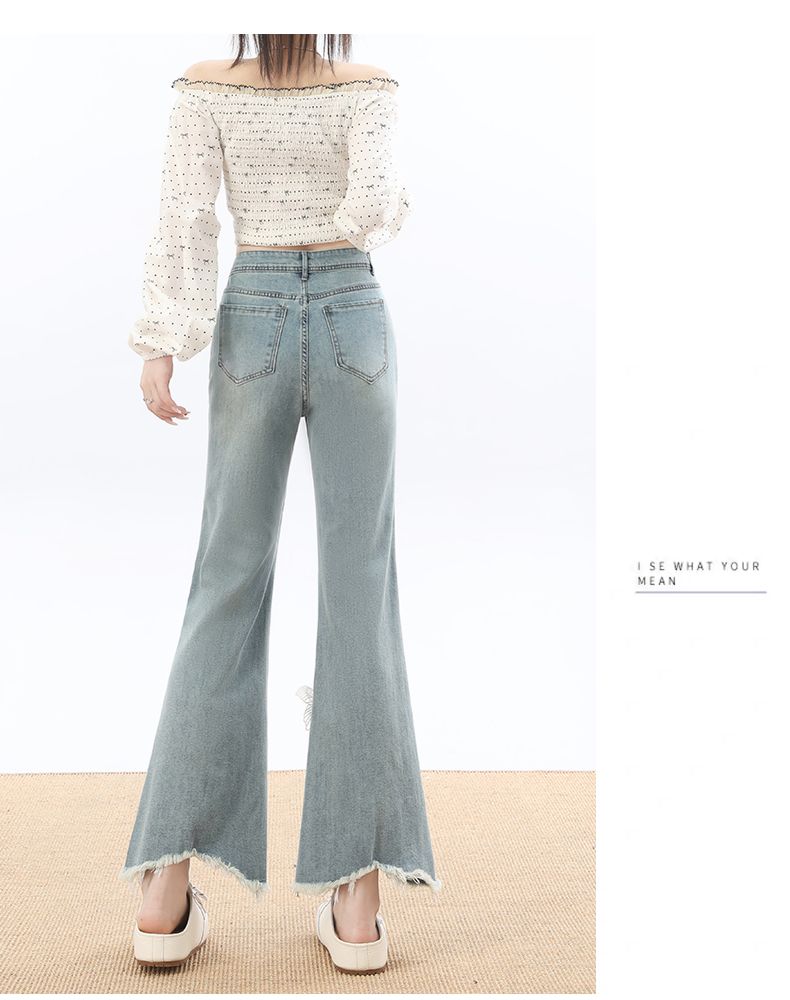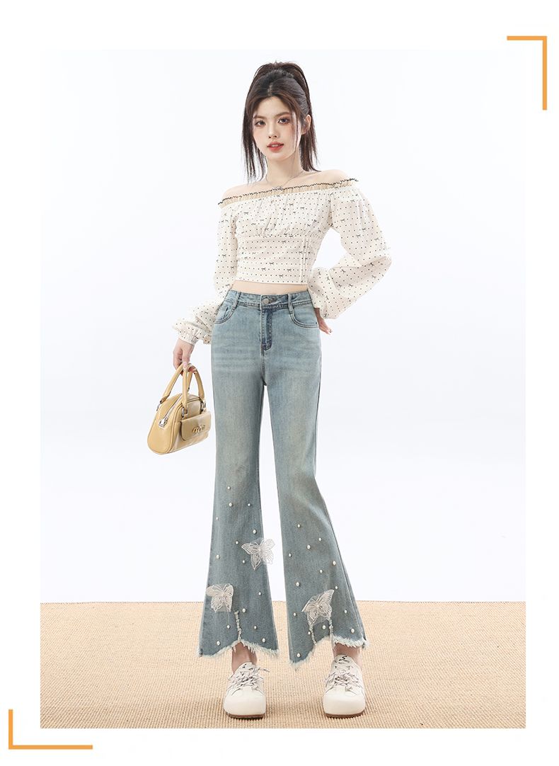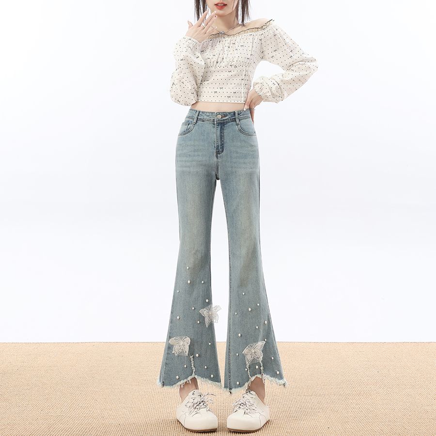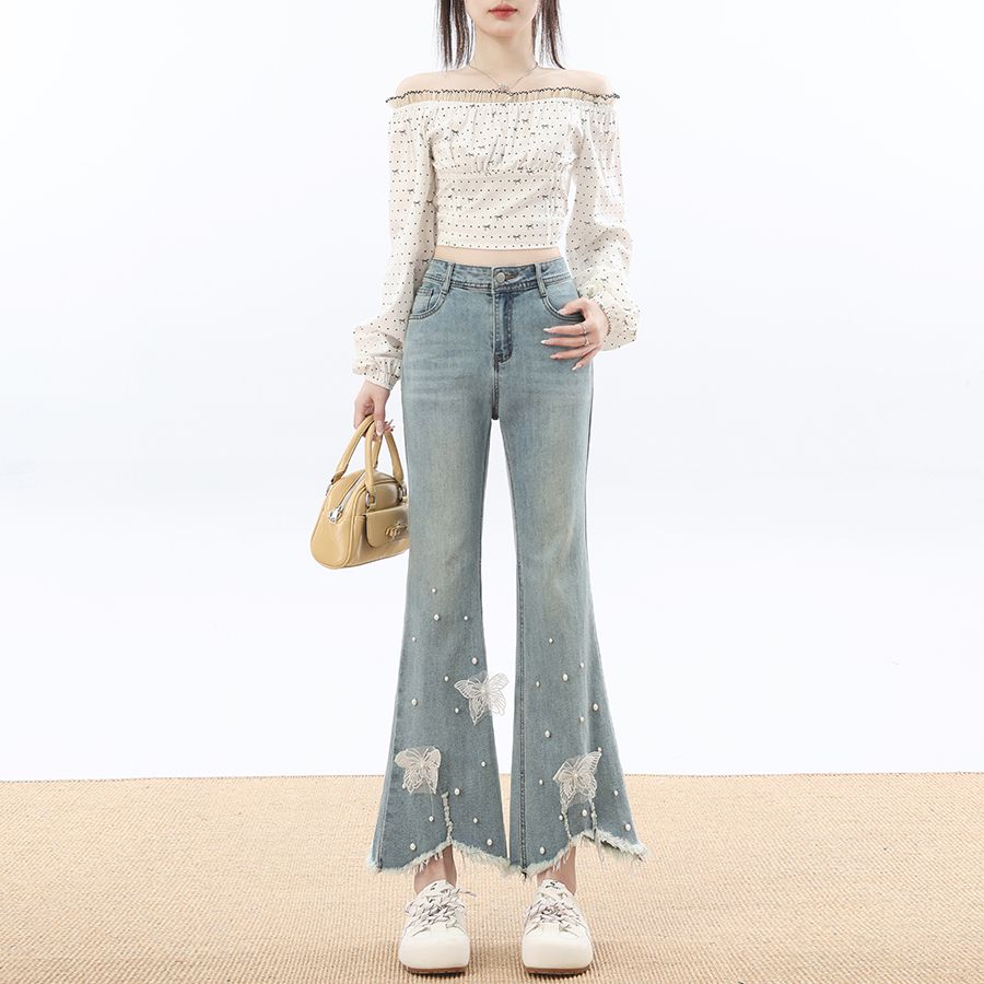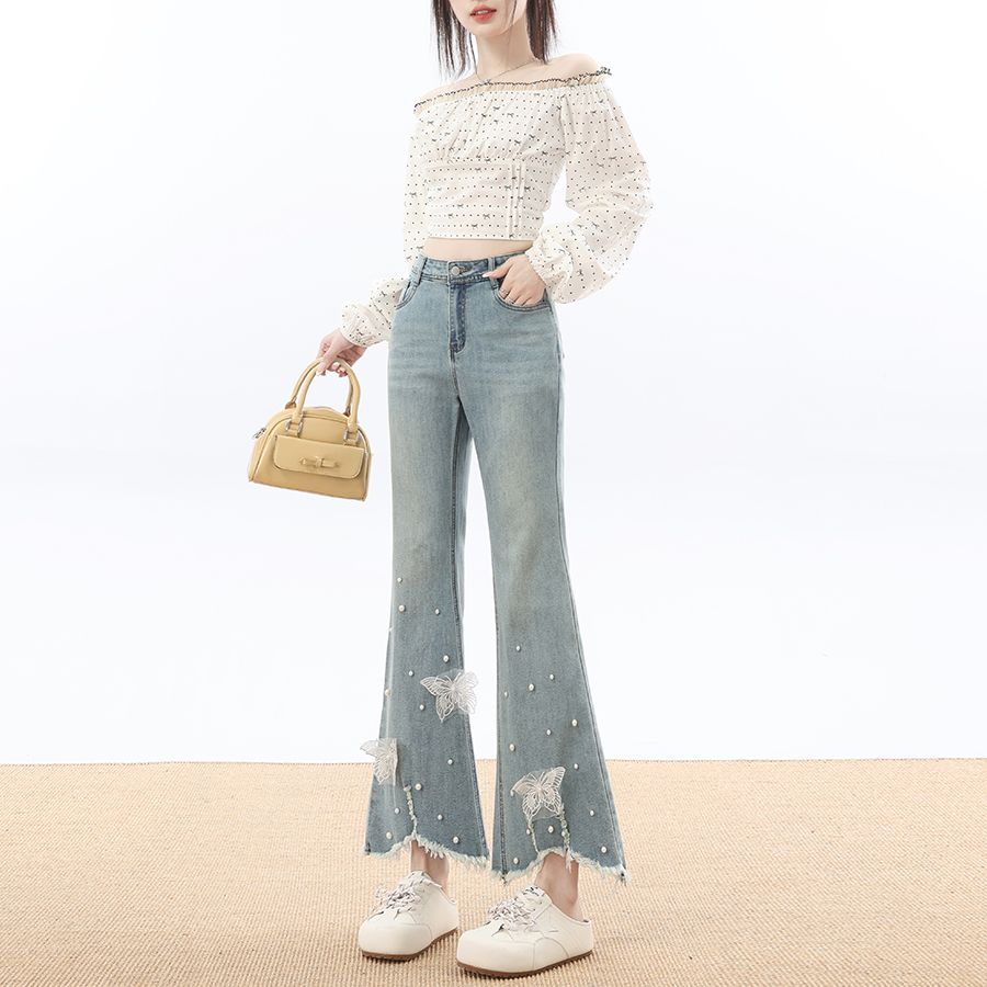 RY3274# 2026实拍春设计感钉珠蝴蝶微喇牛仔裤女八分九分毛边开叉喇叭裤