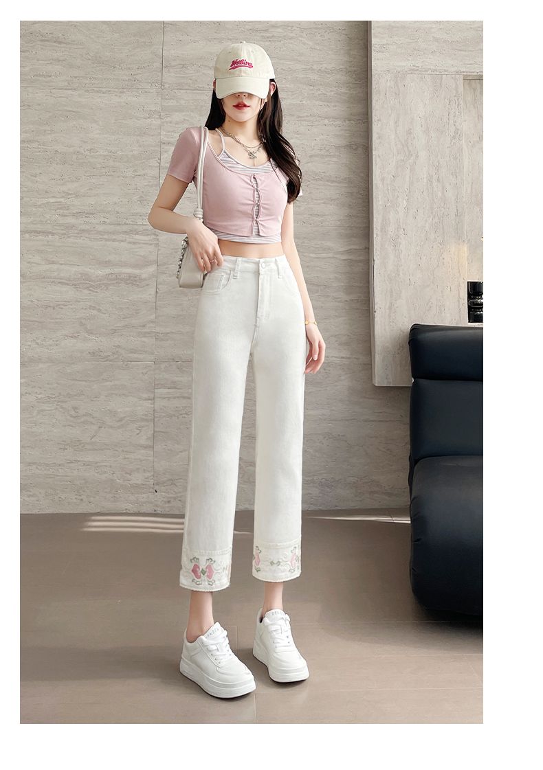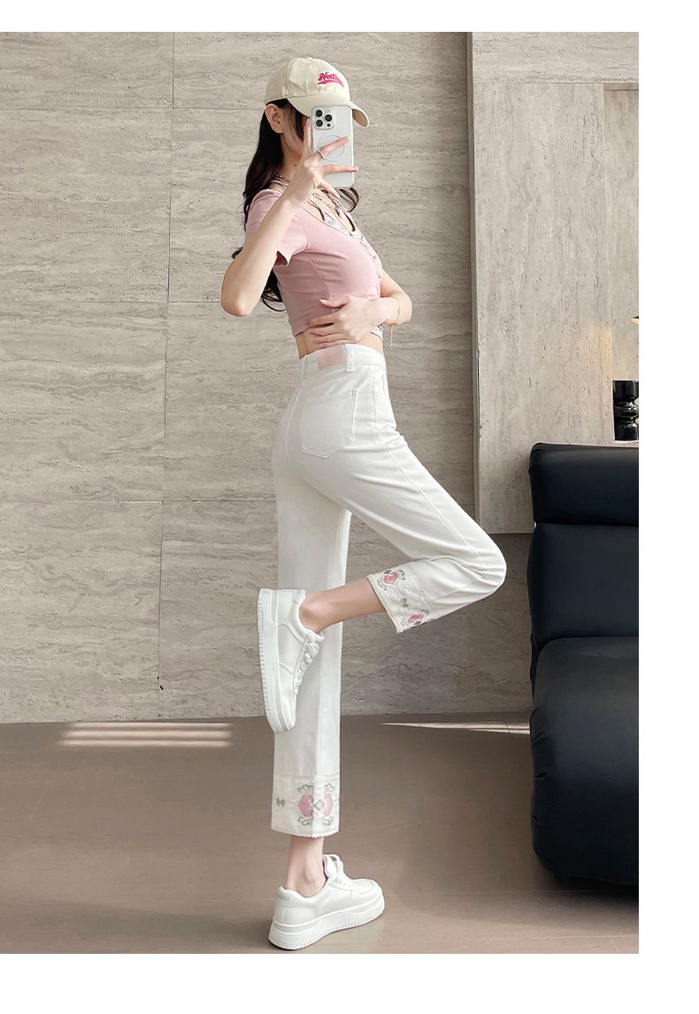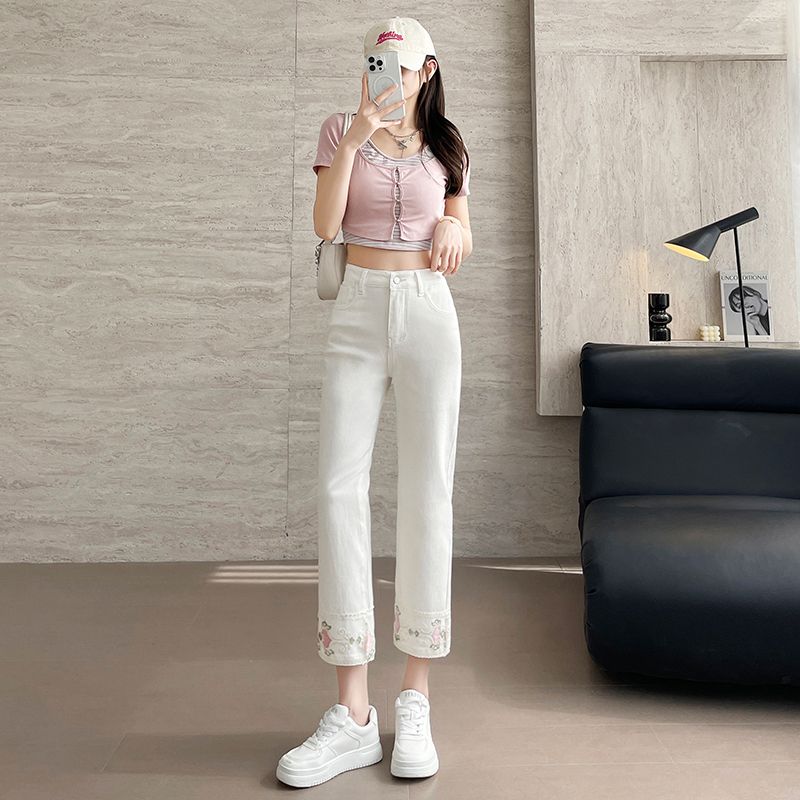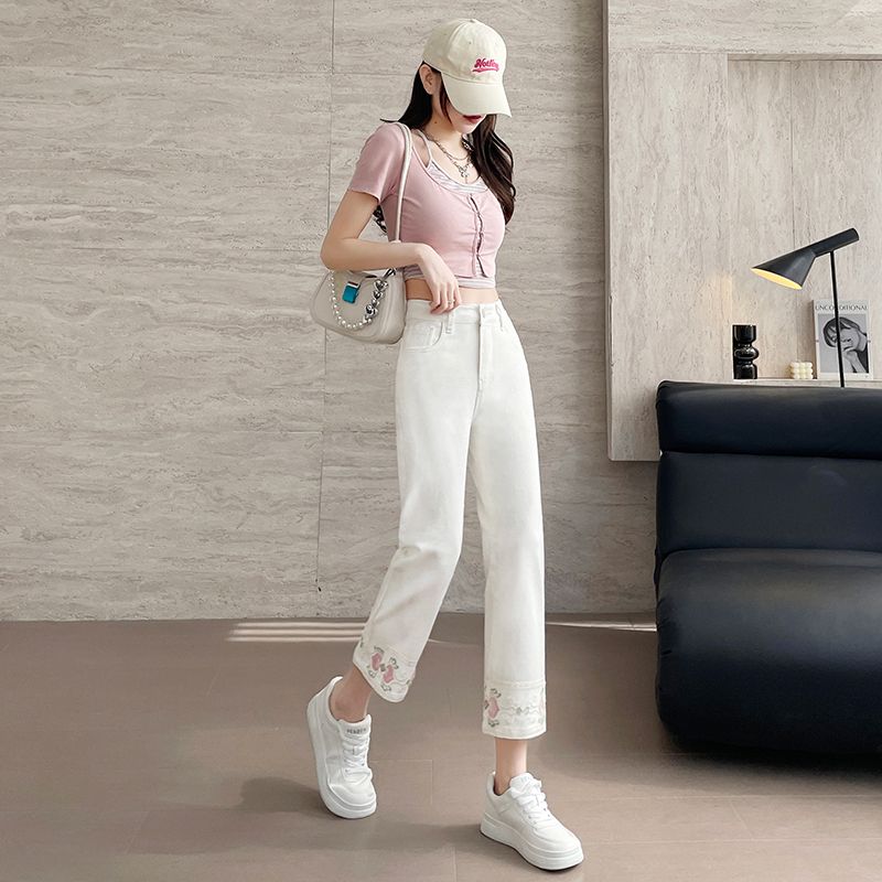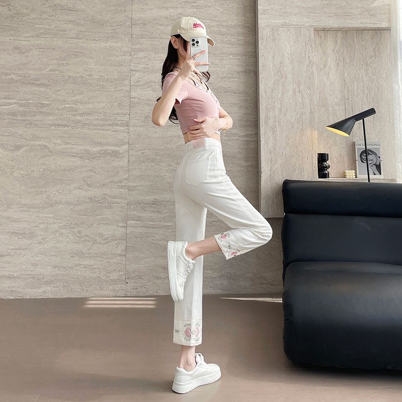 RY3276# 2026实拍夏季薄款高腰刺绣个性直筒裤女宽松百搭休闲八九分烟管裤