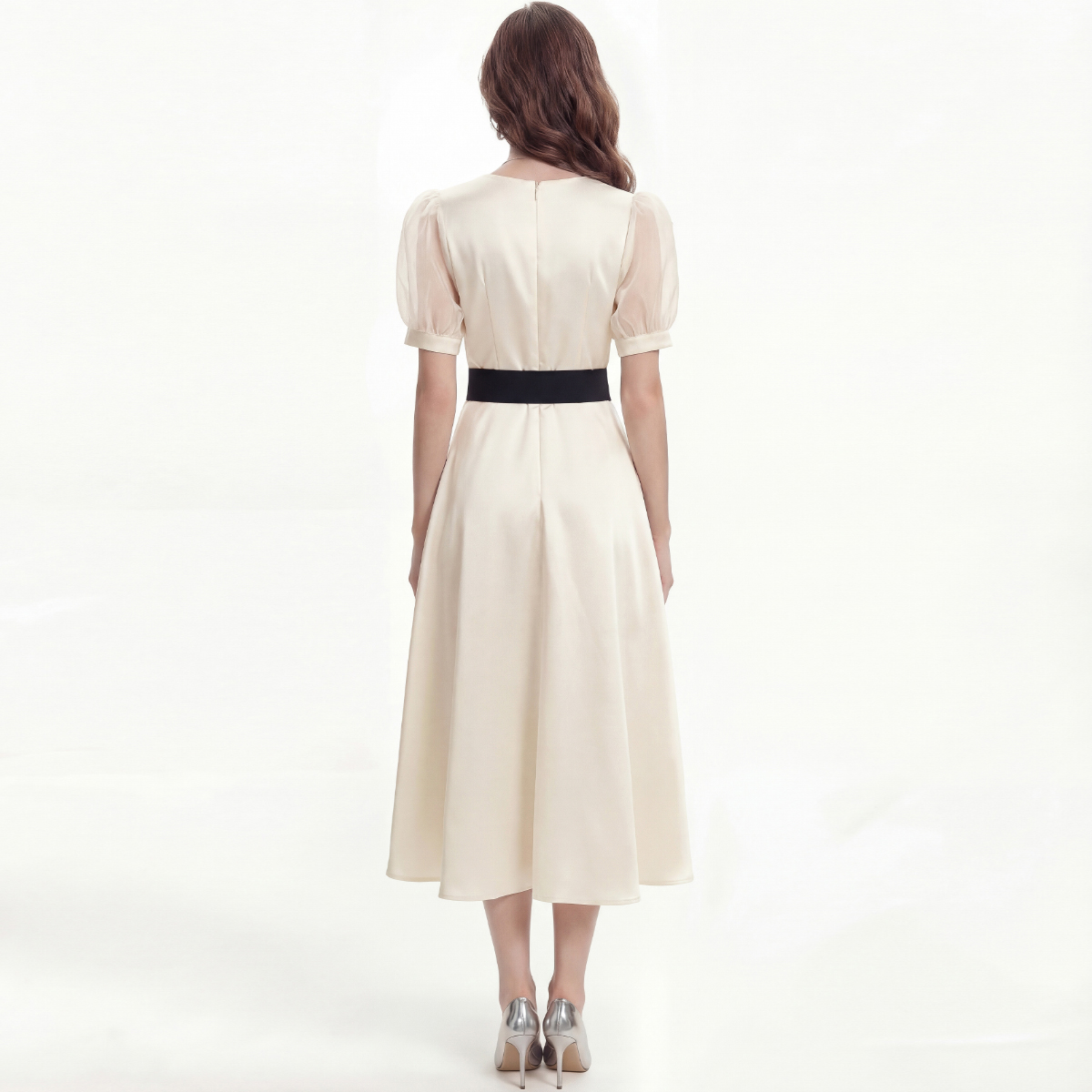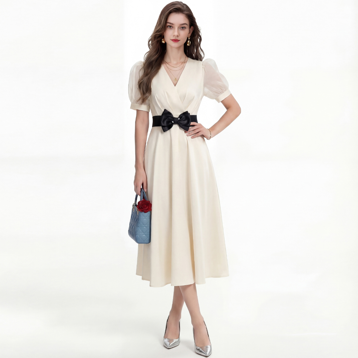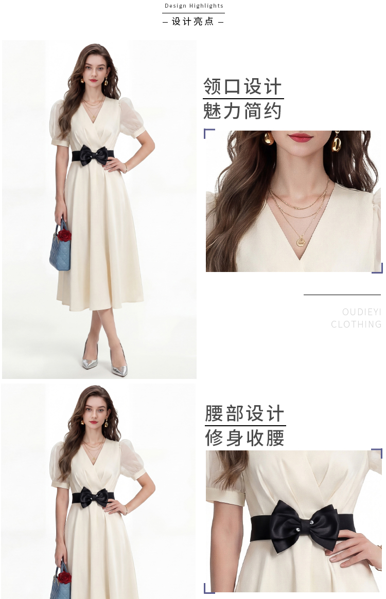 RY3279# 实拍优雅气质缎面V领连衣裙泡泡袖收腰显瘦A字裙中长礼服裙