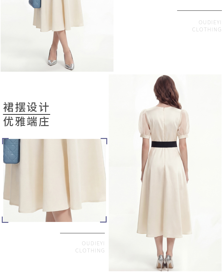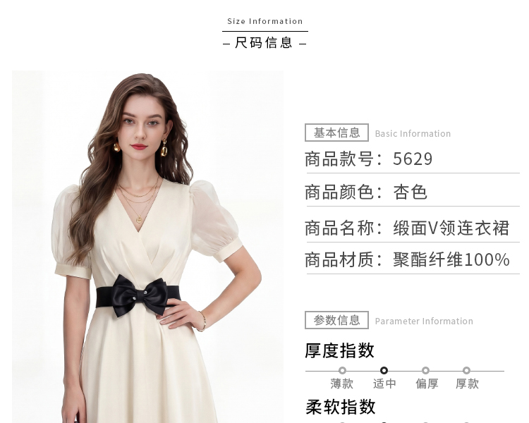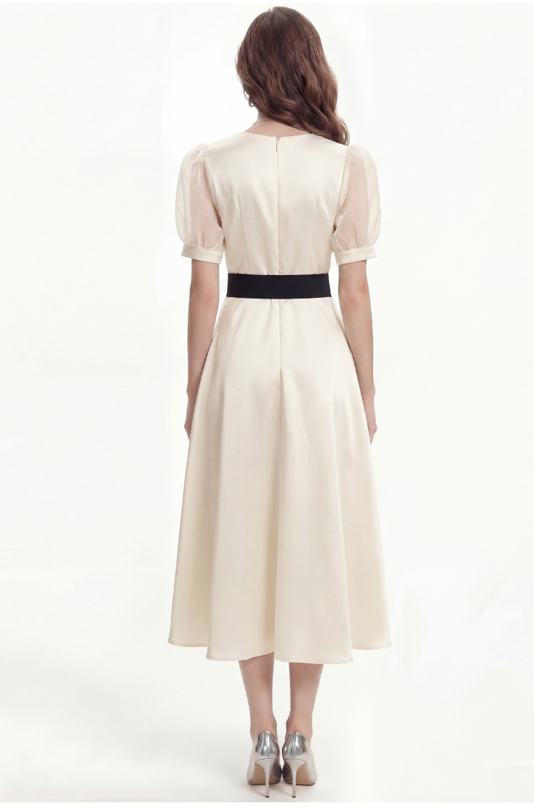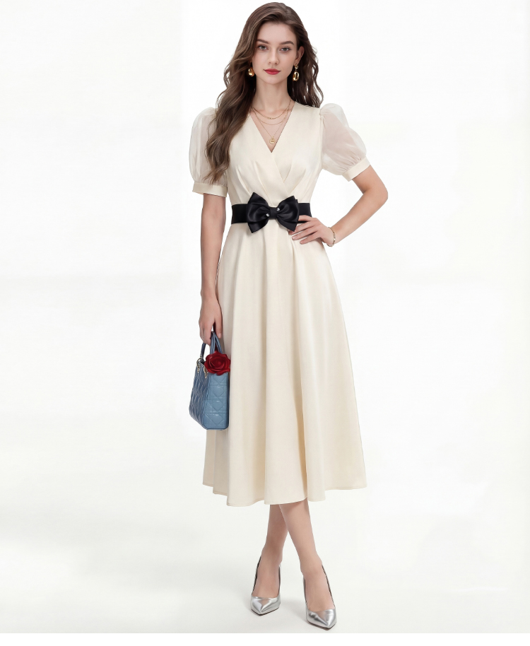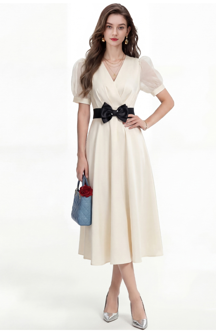 RY3279# 实拍优雅气质缎面V领连衣裙泡泡袖收腰显瘦A字裙中长礼服裙