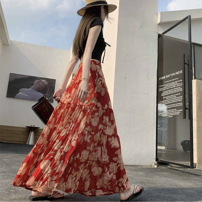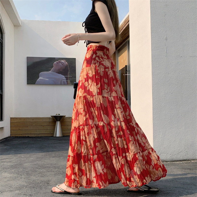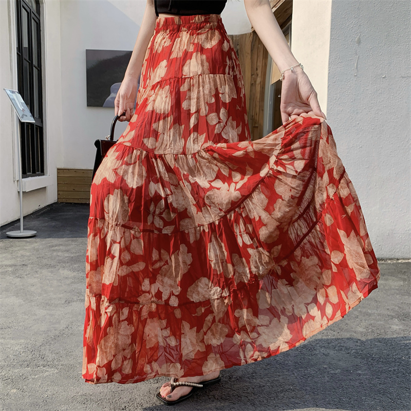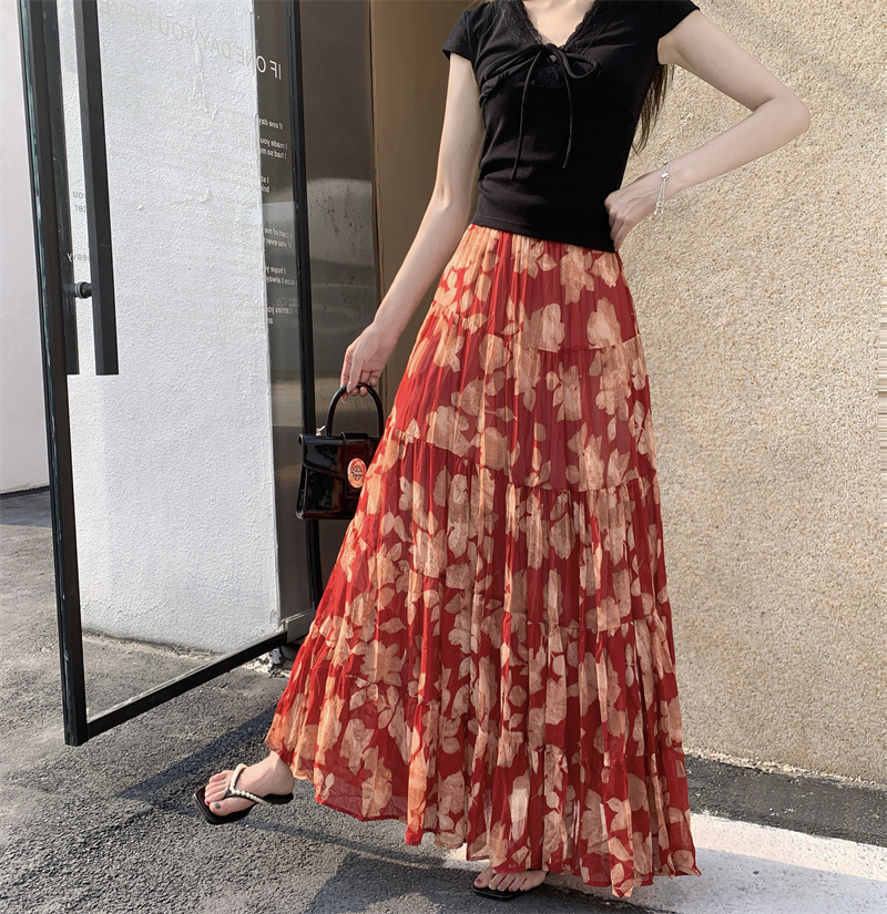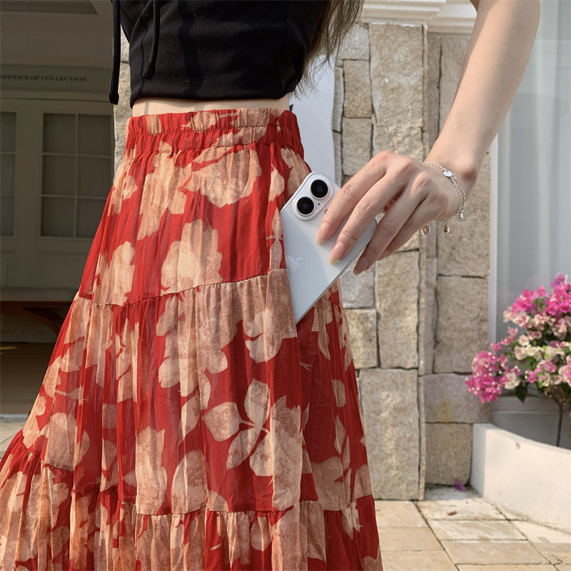 RY3370# 模特实拍红色印花雪纺裙A字拼接大摆半身裙有口袋褶皱百褶裙