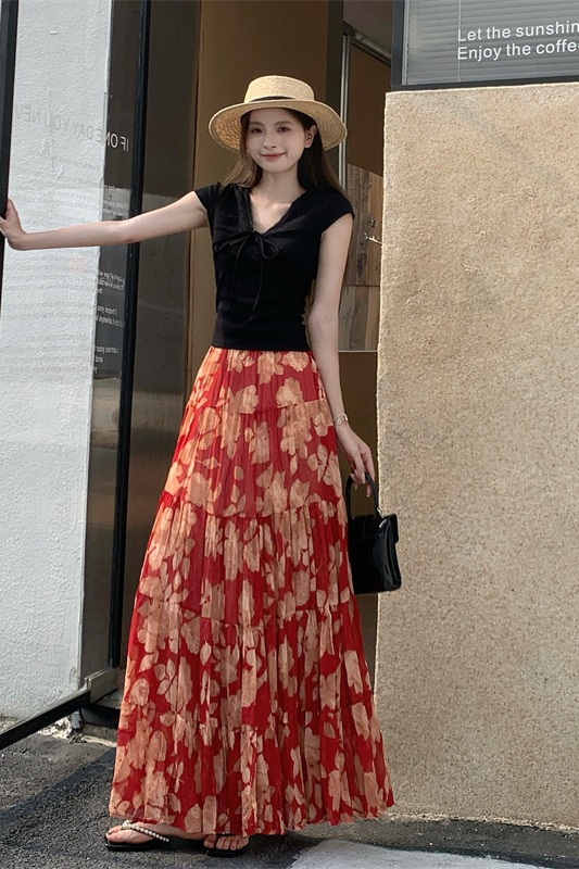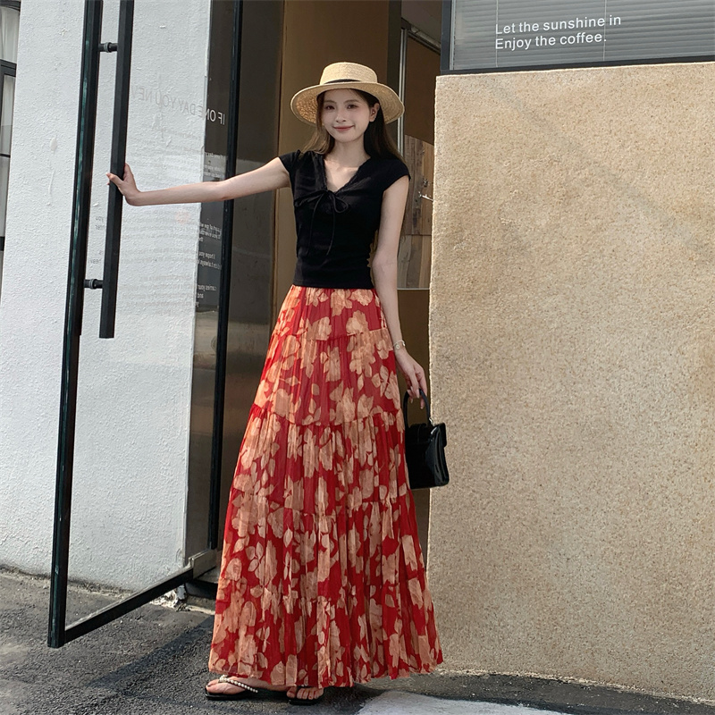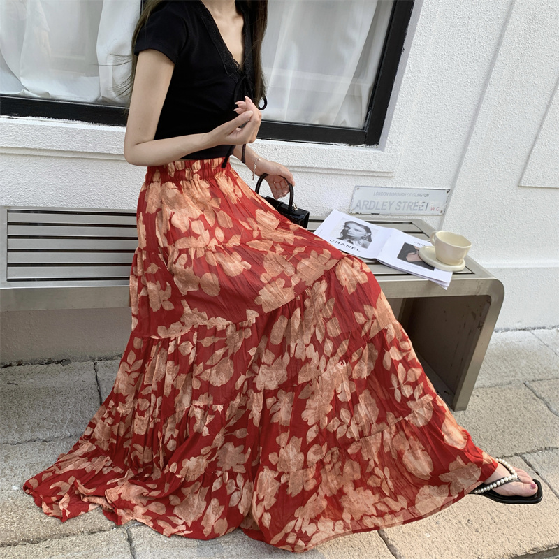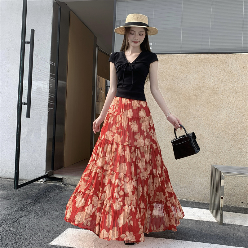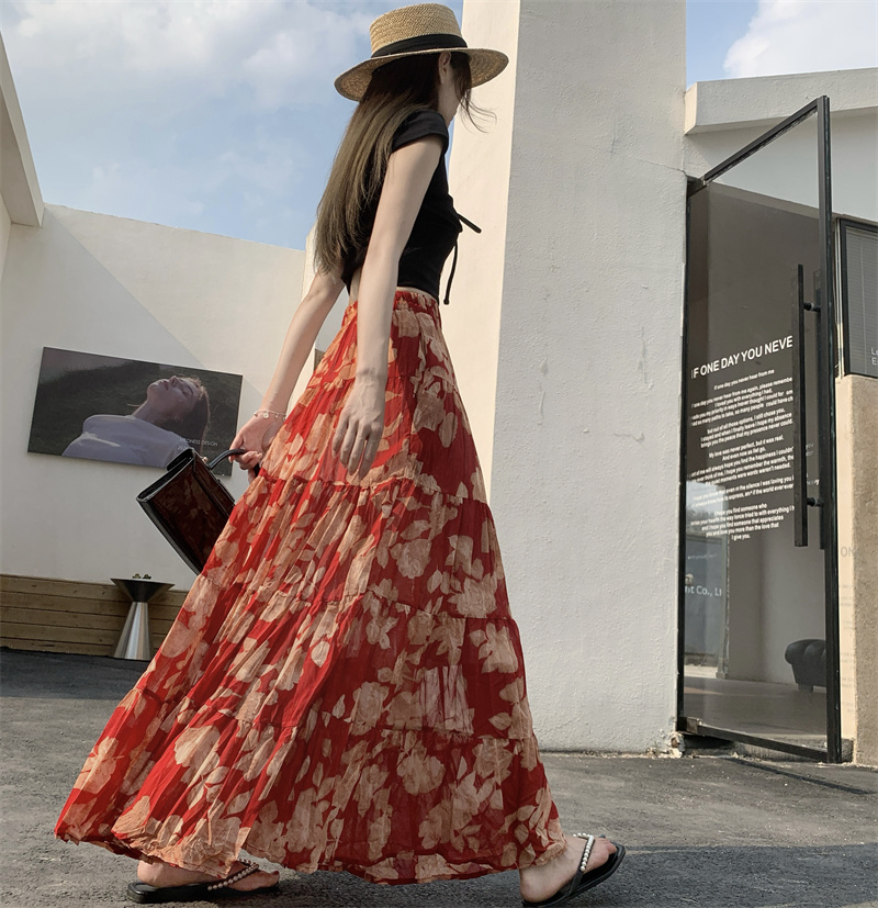 RY3370# 模特实拍红色印花雪纺裙A字拼接大摆半身裙有口袋褶皱百褶裙