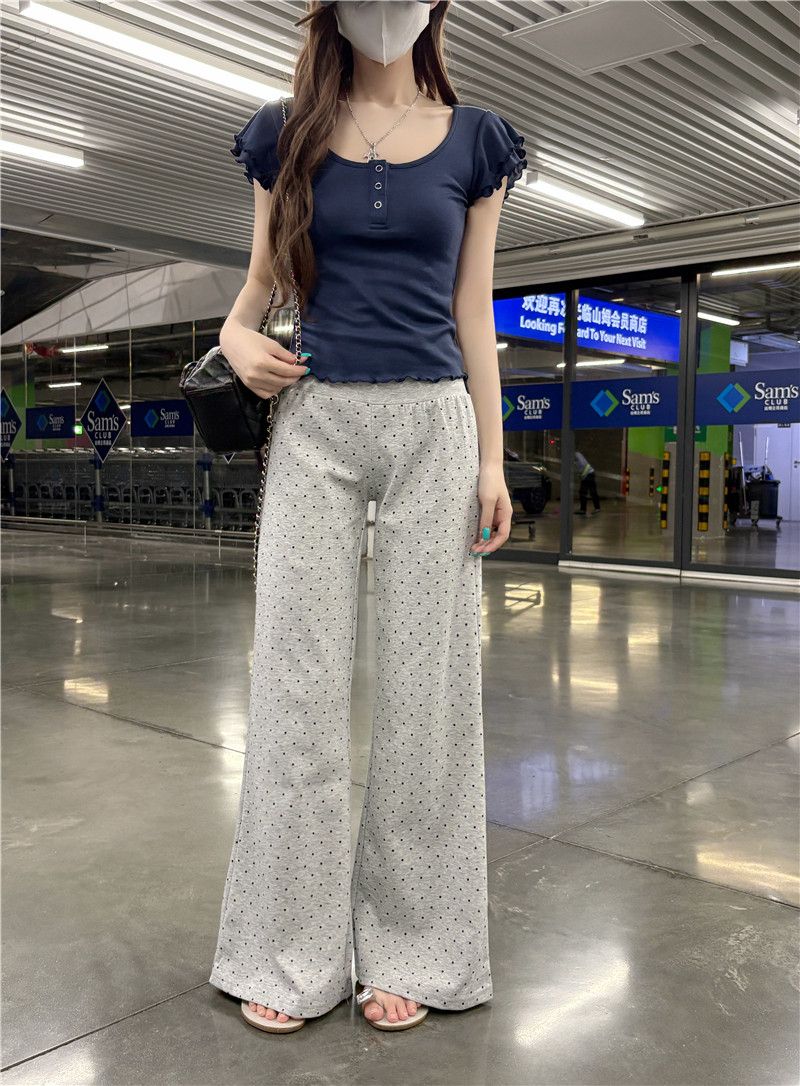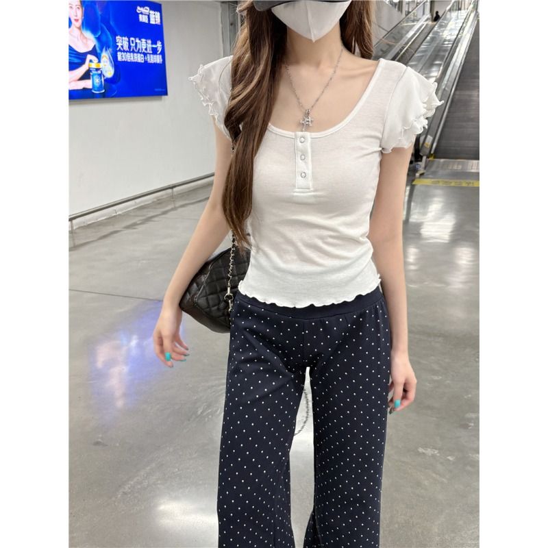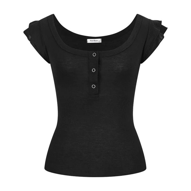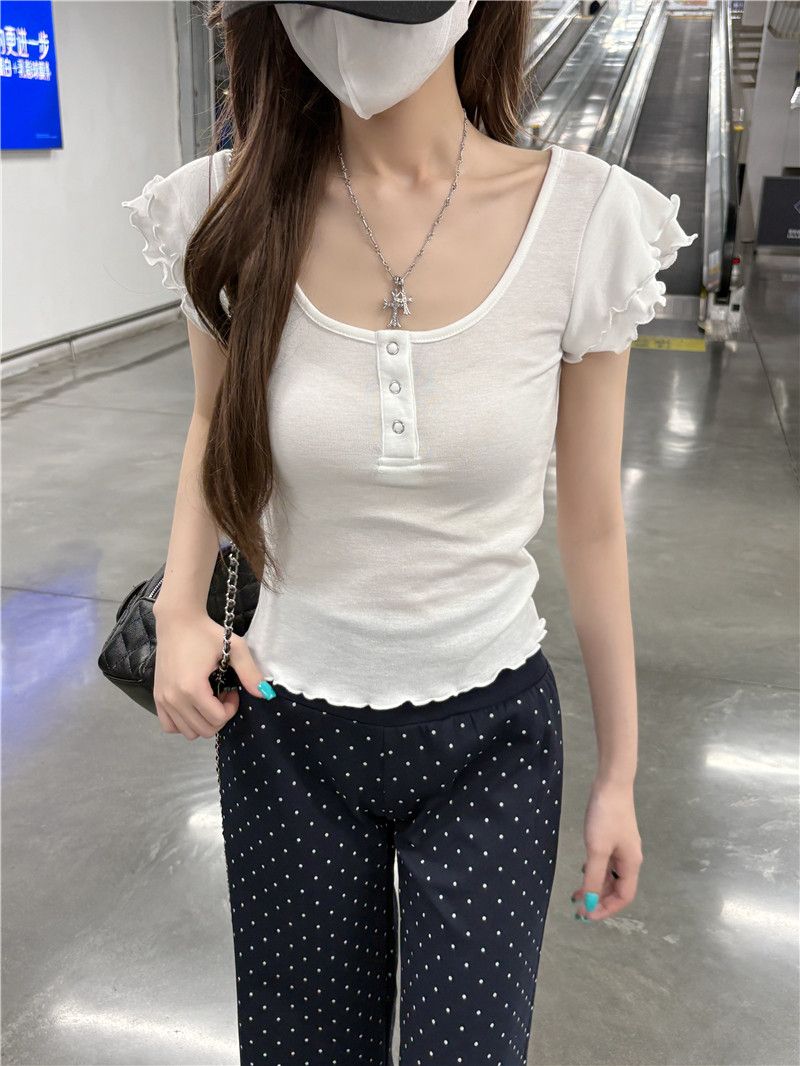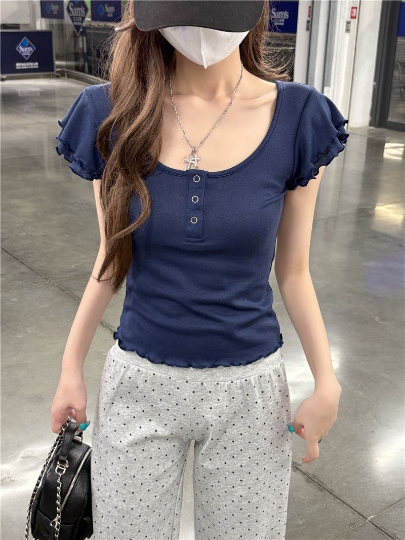 RY3499# 随心裁灰色双层木耳边u领小飞袖T恤女设计感修身显瘦正肩上衣