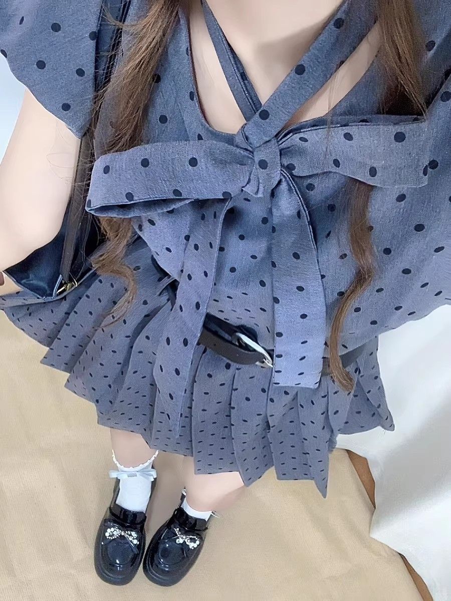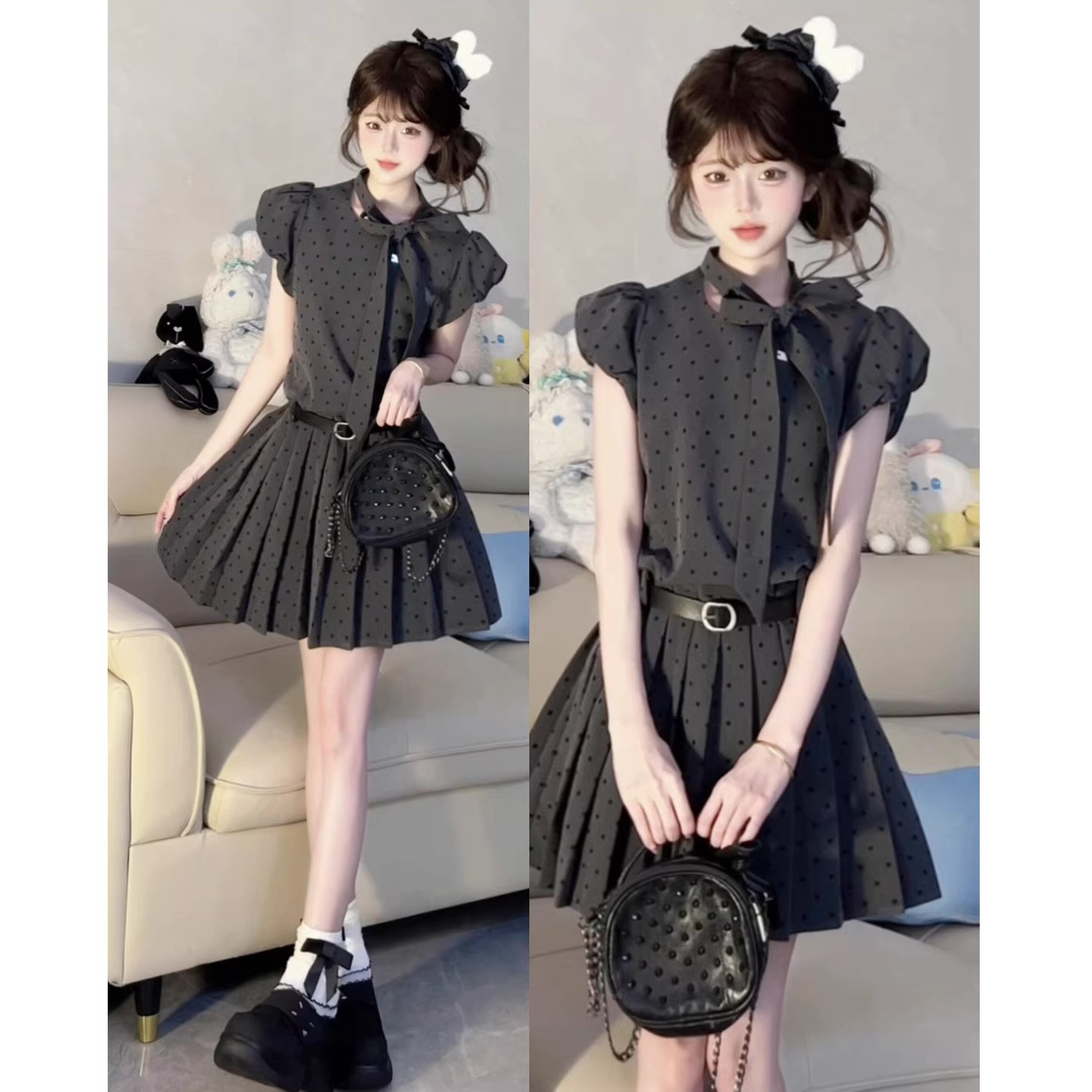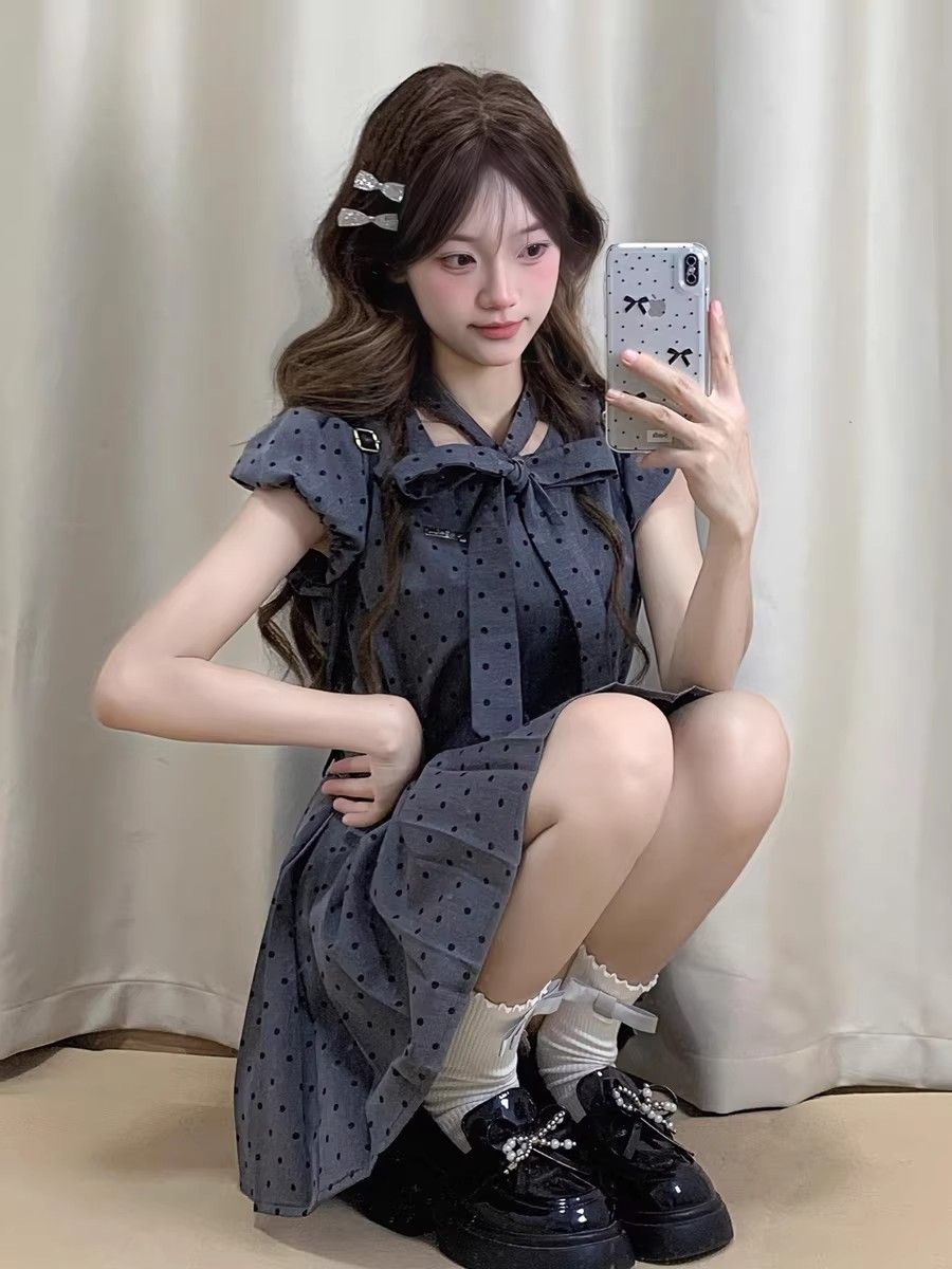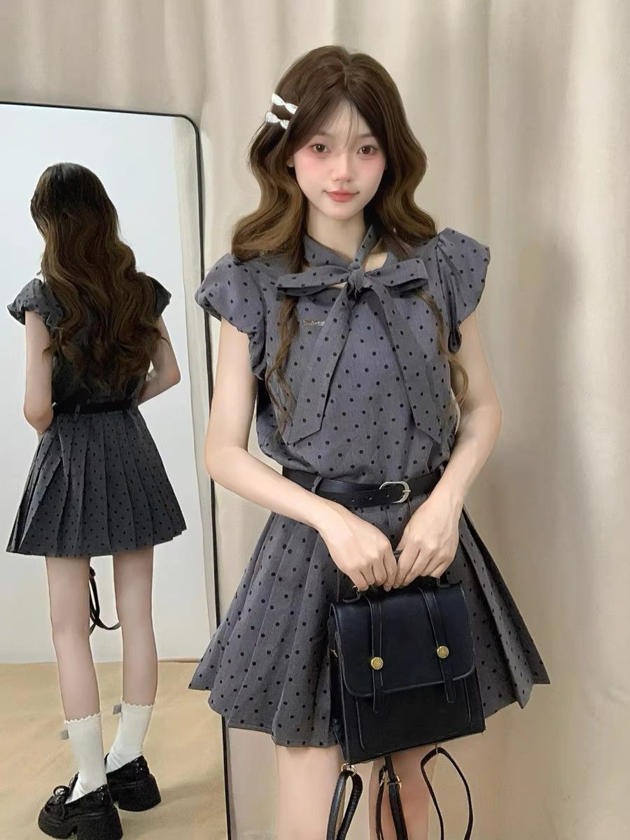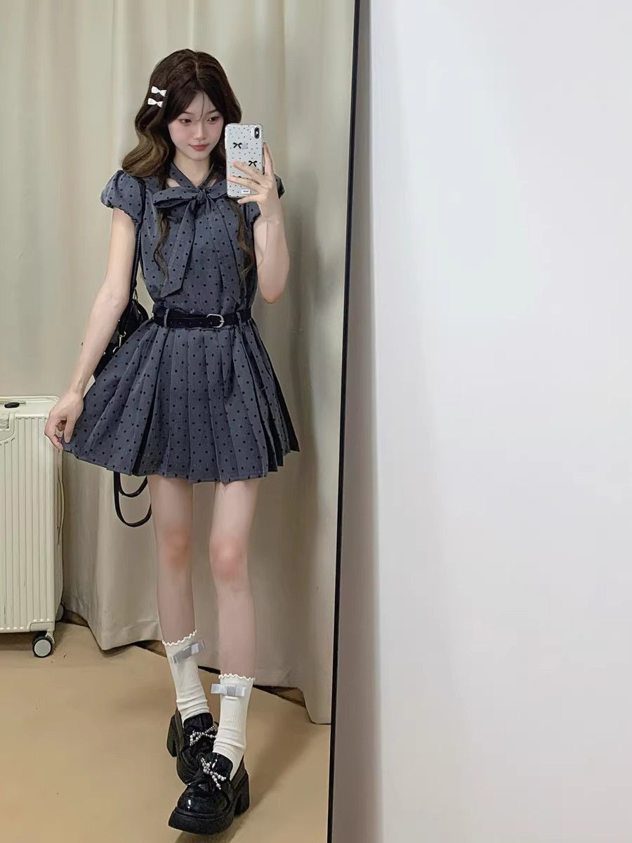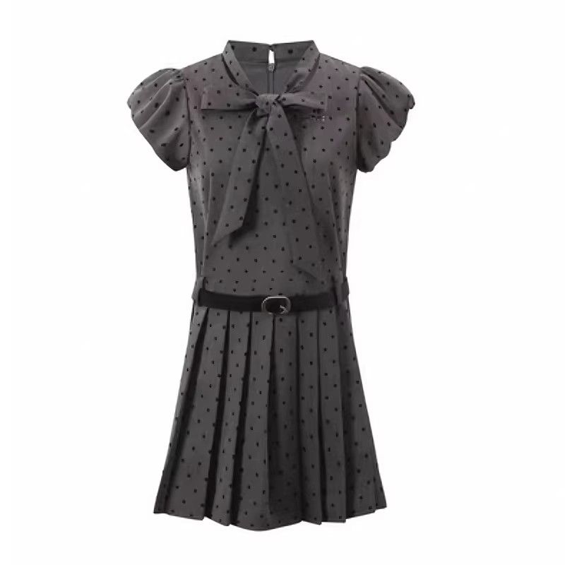 RY3506# miu系富家千金灰色波点连衣裙女夏学院风甜美蝴蝶结收腰百褶短裙