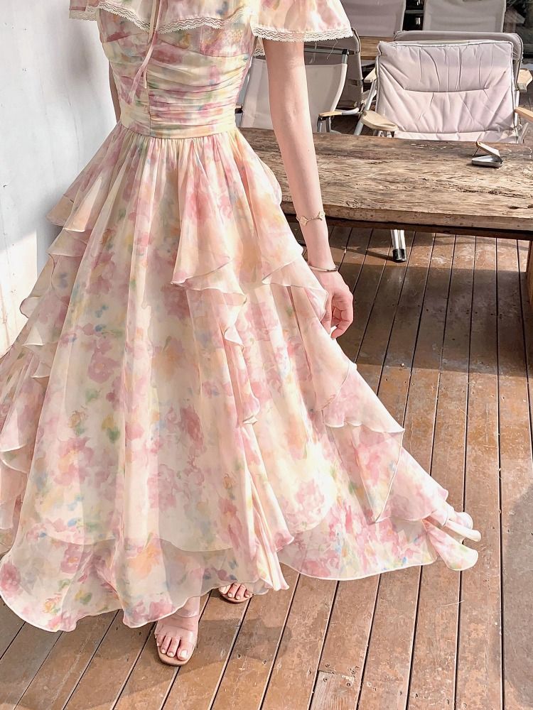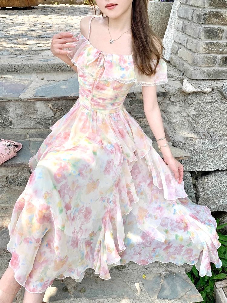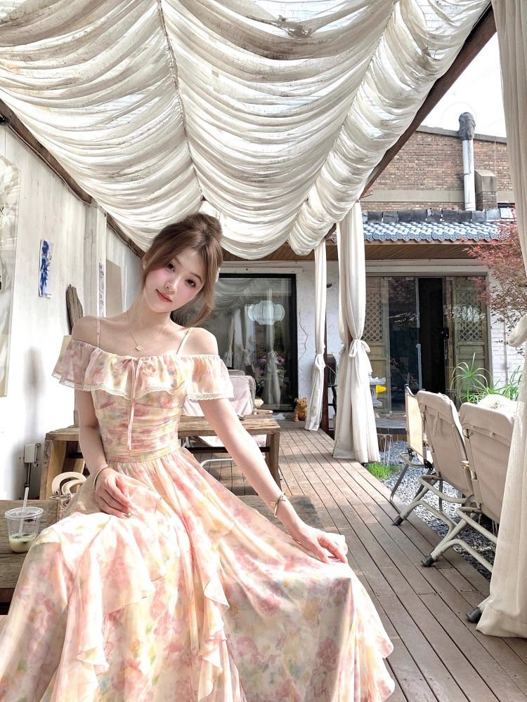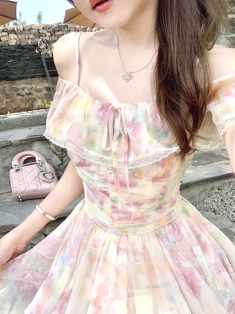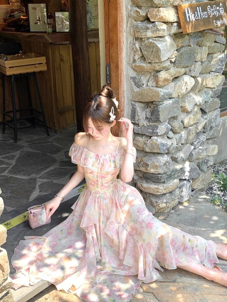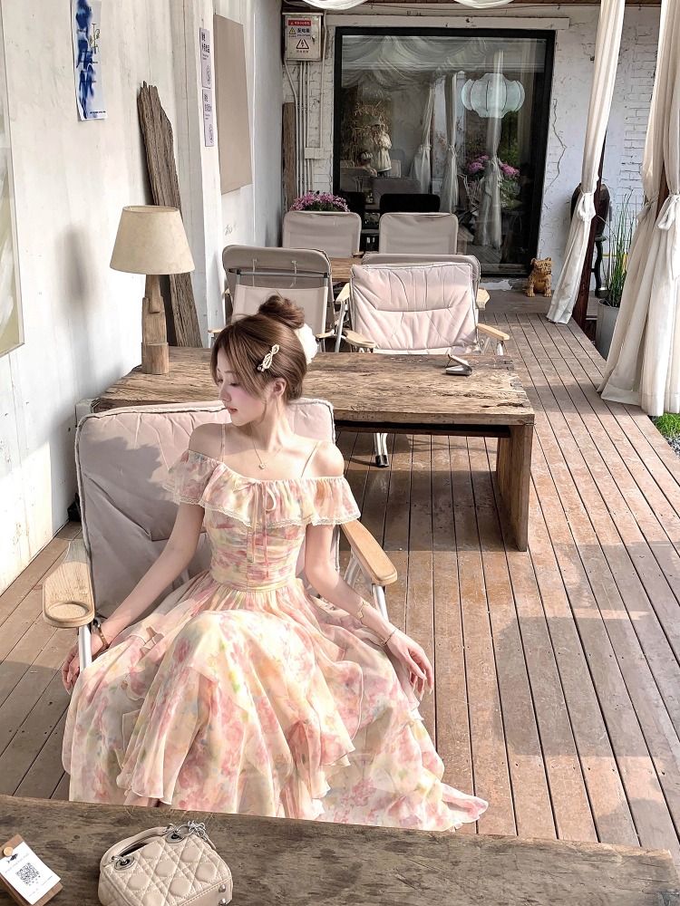 RY3507# Q女家 布拉格之夏/绝美飘逸海边度假碎花大摆连衣裙夏一字肩长裙
